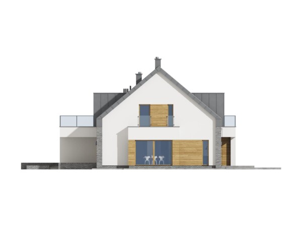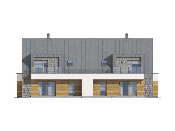 Nowoczesny dom w zabudowie bliźniaczej oferujący atrakcyjne i funkcjonalne wnętrza. Na parterze przestronna przestrzeń dzienna z kominkiem w jadalni, wygodny gabinet i obszerny garaż na jeden samochód. Na poddaszu skosy ograniczone są do minimum dzięki dużym i przeszklonym lukarnom, które zapewniają doskonałe oświetlenie. Liczne tarasy pozwolą domownikom cieszyć się otaczającą naturą.
