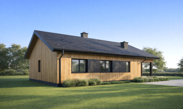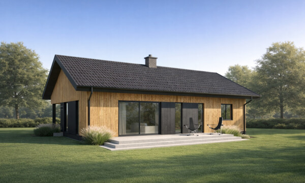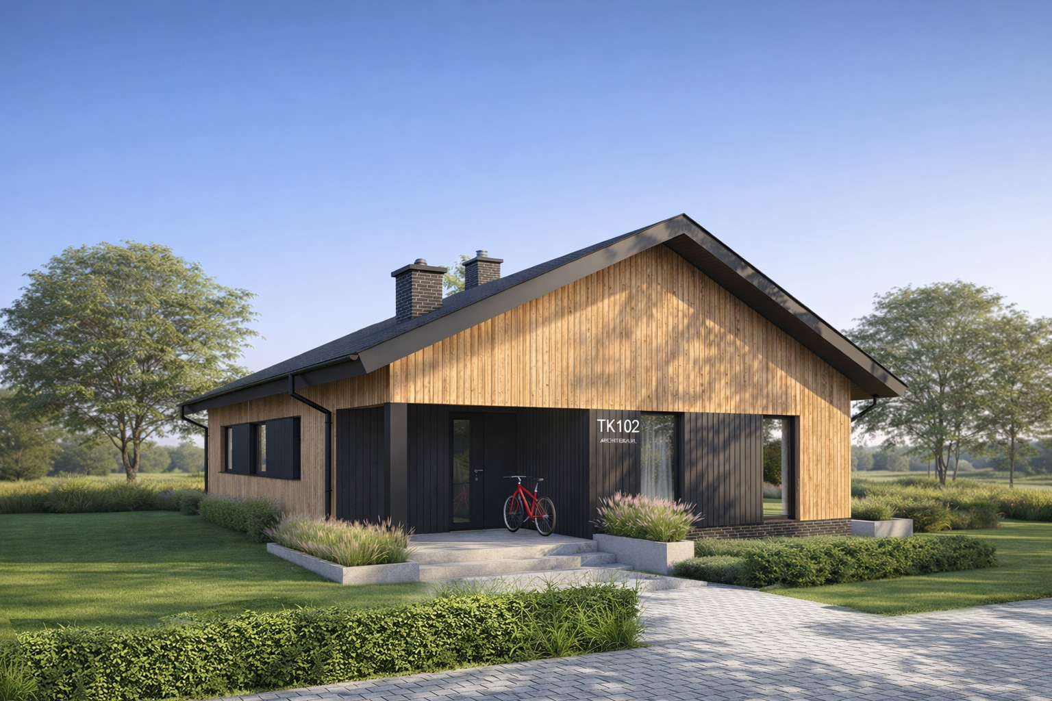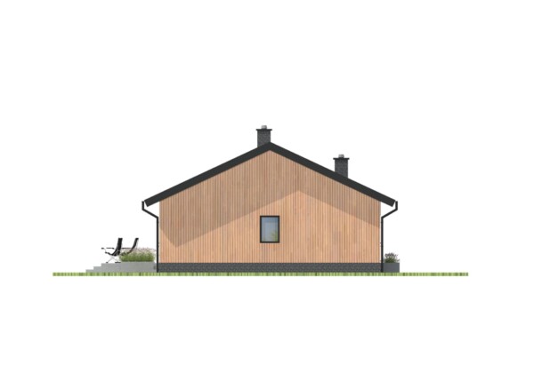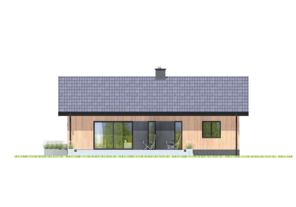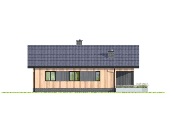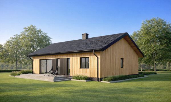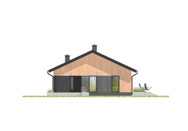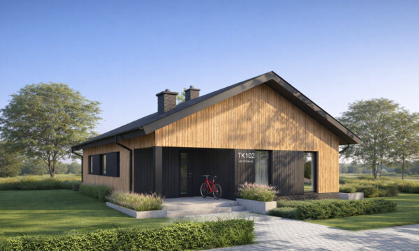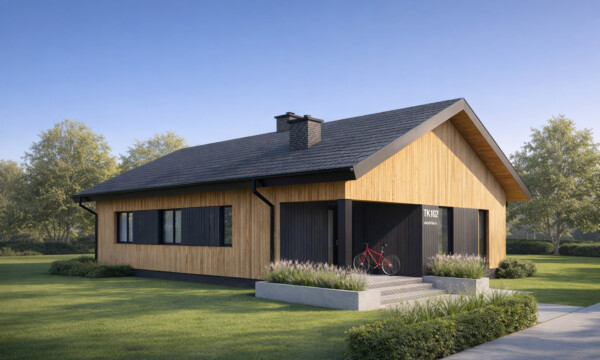 Prosty i wygodny dom parterowy, w którym funkcjonalny układ pomieszczeń pozwoli wygodnie mieszkać czteroosobowej rodzinie. Bryła budynku oraz zastosowane rozwiązania konstrukcyjne i techniczne zapewniają niskie koszty budowy i użytkowania. Znajdziemy tu trzy wygodne pokoje, dwie łazienki i wygodną otwartą przestrzeń dzienną z kominkiem w salonie i jadalni. Otwarta kuchnia z wyspą nie tylko pomieści wszelkie konieczne sprzęty ale zapewni także doskonały widok na ogród. TK102 jest domem w konstrukcji drewnianej szkieletowej.