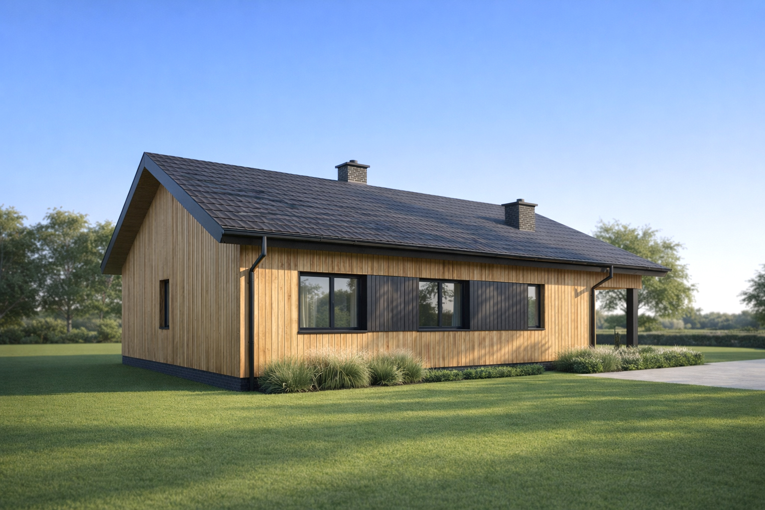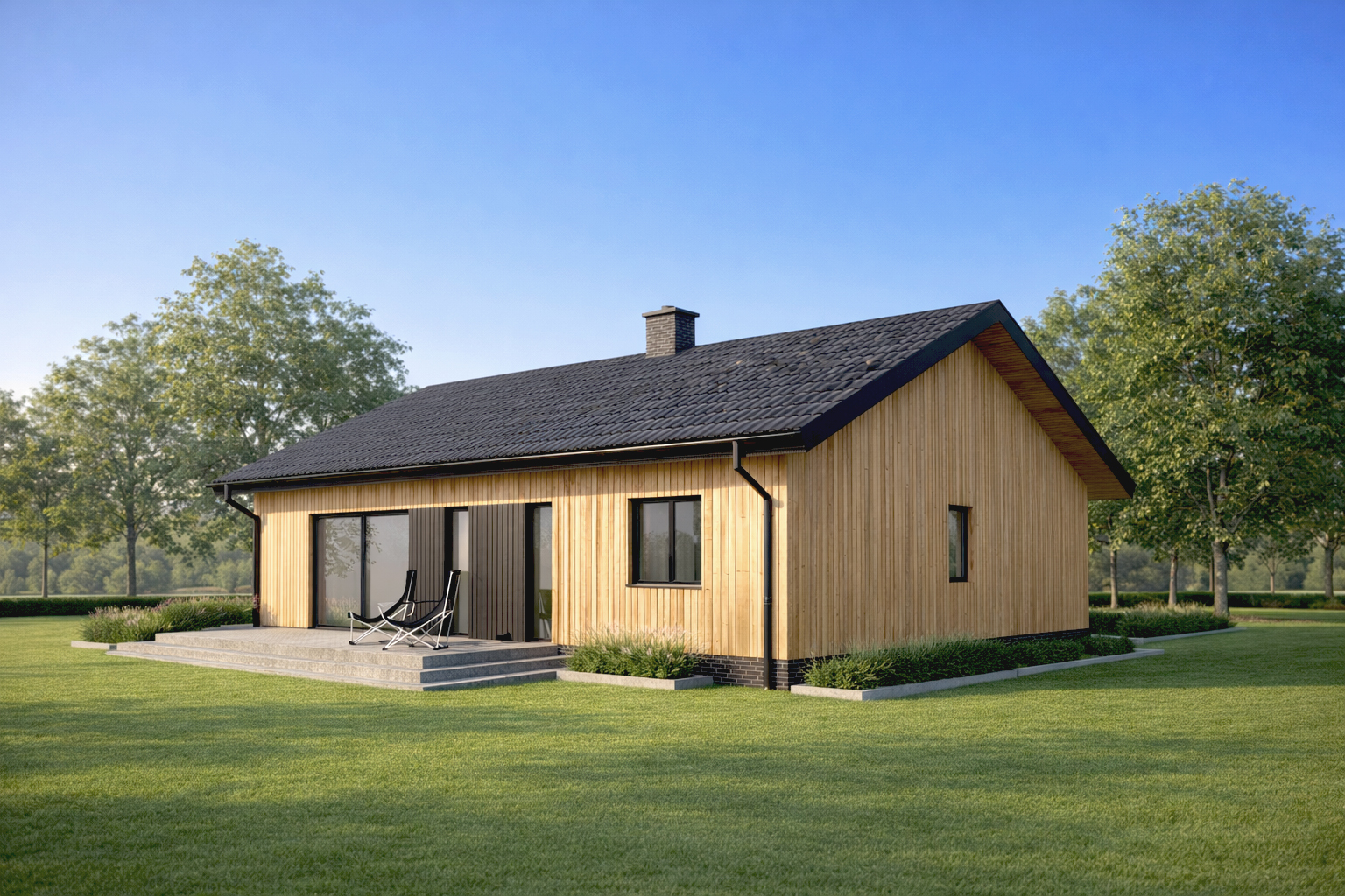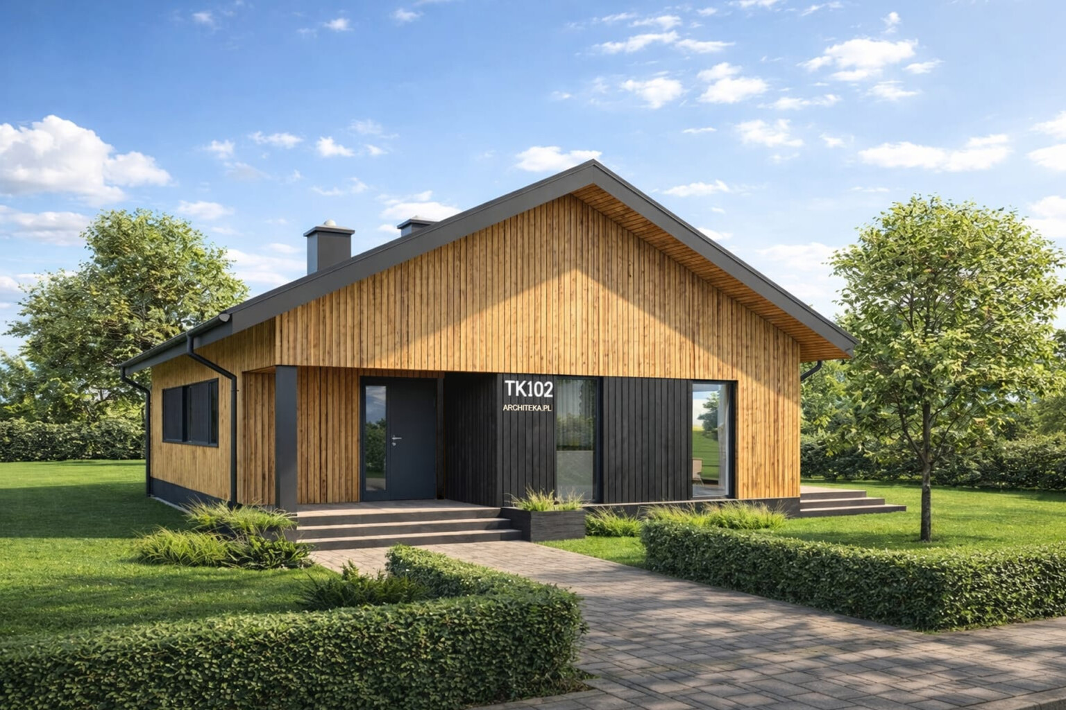 Prosty i wygodny dom parterowy, w którym funkcjonalny układ pomieszczeń pozwoli wygodnie mieszkać czteroosobowej rodzinie. Bryła budynku oraz zastosowane rozwiązania konstrukcyjne i techniczne zapewniają niskie koszty budowy i użytkowania. Znajdziemy tu trzy wygodne pokoje, dwie łazienki i wygodną otwartą przestrzeń dzienną z kominkiem w salonie i jadalni. Otwarta kuchnia z wyspą nie tylko pomieści wszelkie konieczne sprzęty ale zapewni także doskonały widok na ogród. TK102 jest domem w konstrukcji drewnianej szkieletowej.