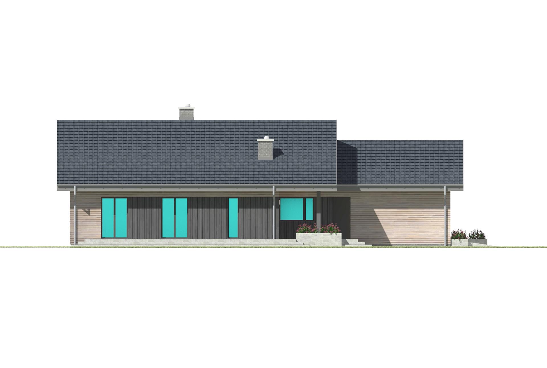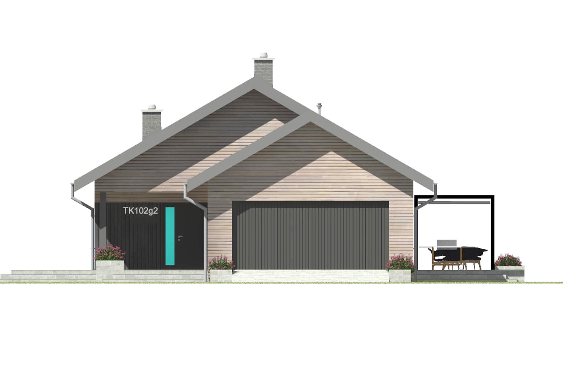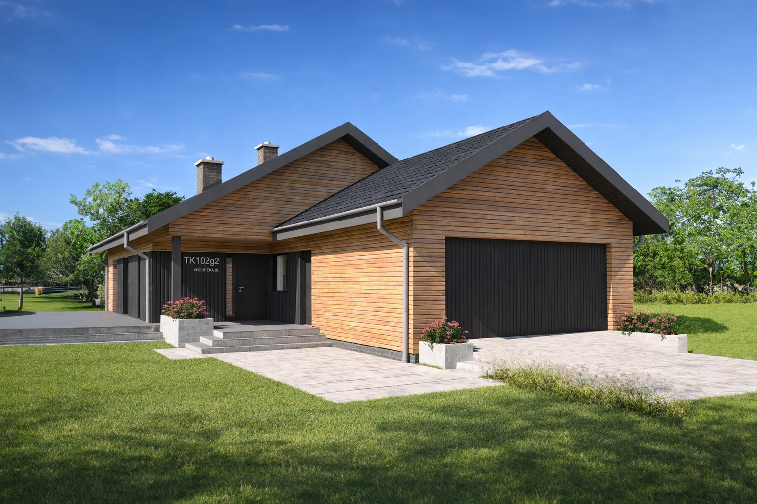 Prosty i wygodny dom parterowy z garażem na dwa samochody. Zaprojektowany z myślą o wygodach dla czteroosobowej rodziny. Proste rozwiązania konstrukcyjne i techniczne zapewniają niskie koszty budowy i użytkowania, a niewielka szerokość budynku pozwala umieści go na wąskiej działce. Znajdziemy tu dwa wygodne pokoje dla dzieci, sypialnie dla rodziców z własną garderobą, dwie łazienki i wygodną otwartą przestrzeń dzienną z kominkiem w salonie i jadalni. TK102g2 jest domem w konstrukcji drewnianej szkieletowej.