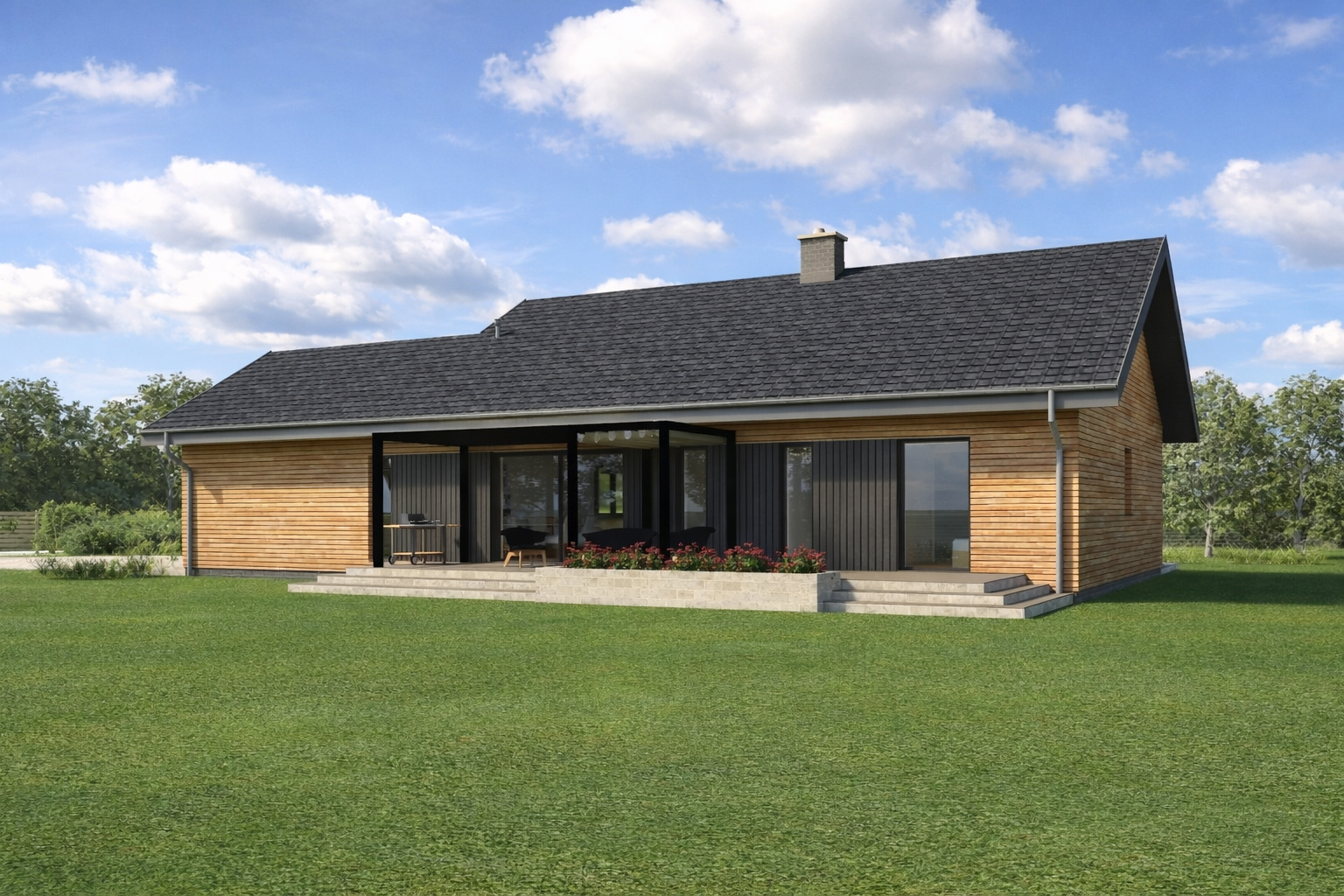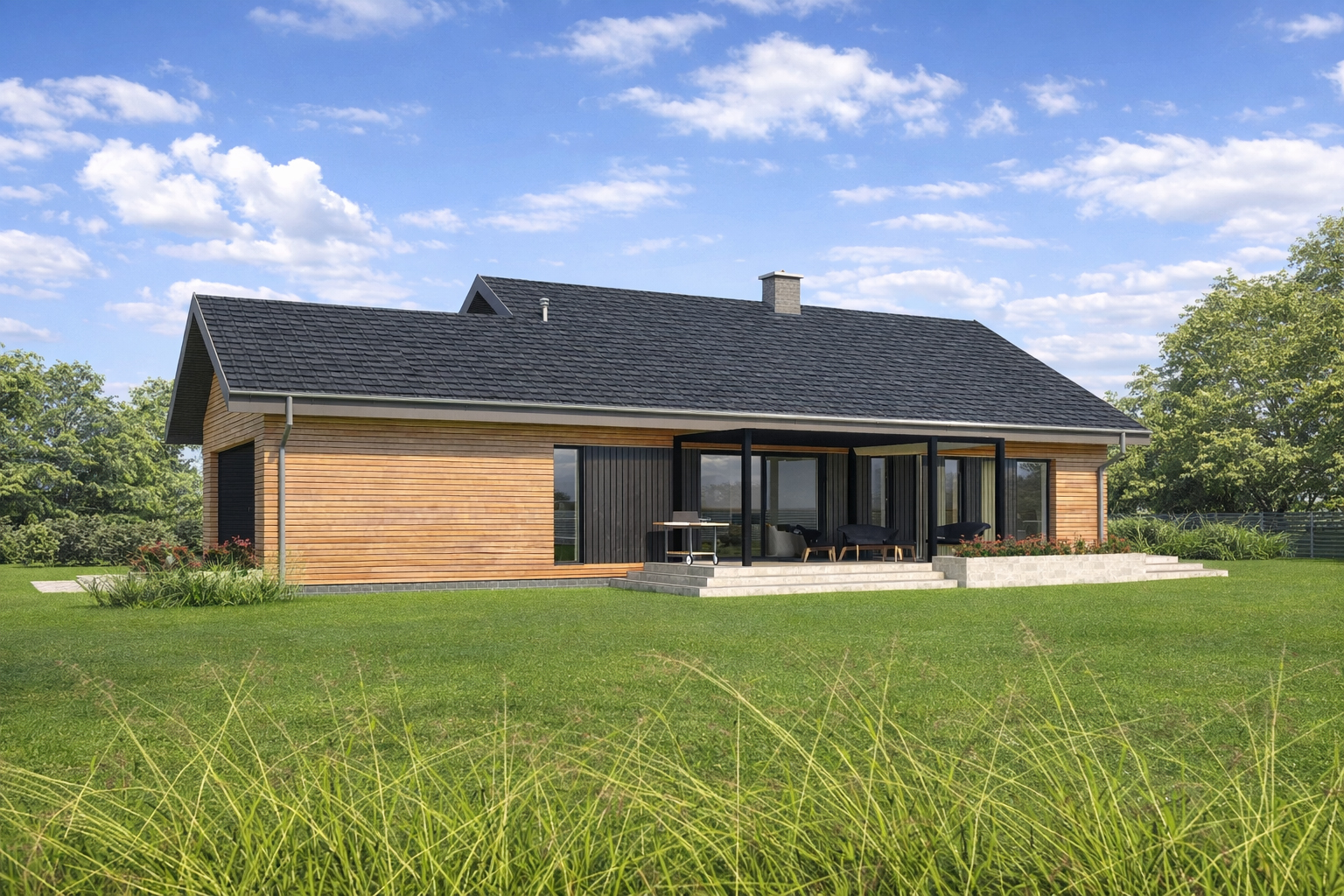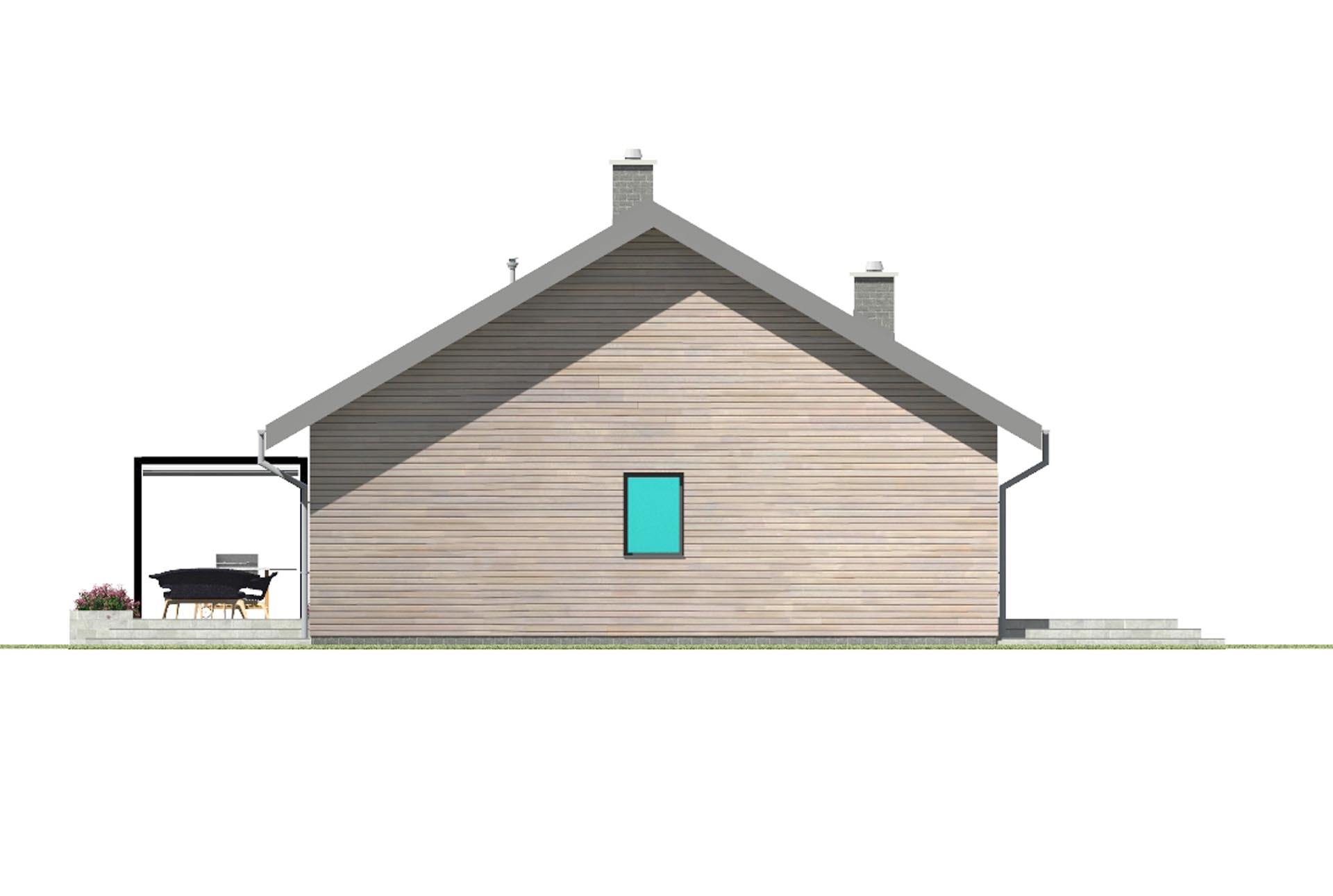 Prosty i wygodny dom parterowy z garażem na dwa samochody. Zaprojektowany z myślą o wygodach dla czteroosobowej rodziny. Proste rozwiązania konstrukcyjne i techniczne zapewniają niskie koszty budowy i użytkowania, a niewielka szerokość budynku pozwala umieści go na wąskiej działce. Znajdziemy tu dwa wygodne pokoje dla dzieci, sypialnie dla rodziców z własną garderobą, dwie łazienki i wygodną otwartą przestrzeń dzienną z kominkiem w salonie i jadalni. TK102g2 jest domem w konstrukcji drewnianej szkieletowej.