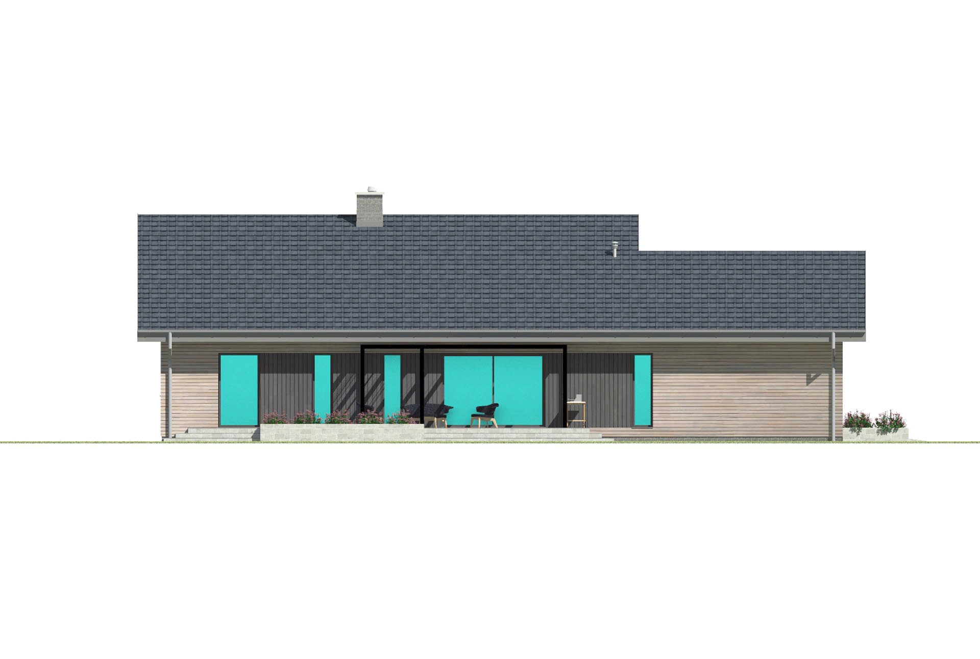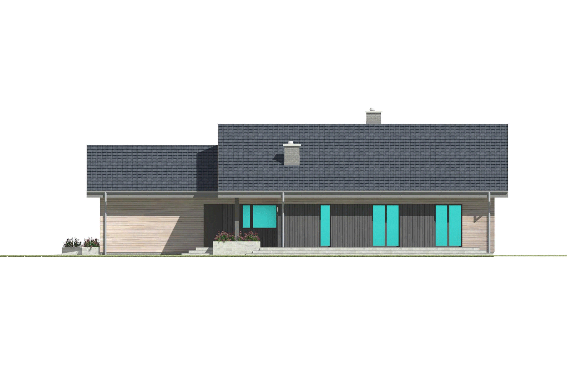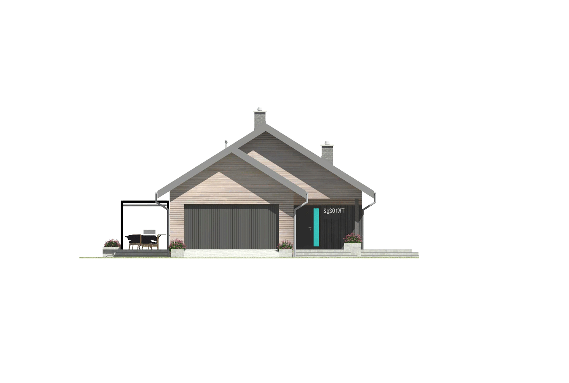 Prosty i wygodny dom parterowy z garażem na dwa samochody. Zaprojektowany z myślą o wygodach dla czteroosobowej rodziny. Proste rozwiązania konstrukcyjne i techniczne zapewniają niskie koszty budowy i użytkowania, a niewielka szerokość budynku pozwala umieści go na wąskiej działce. Znajdziemy tu dwa wygodne pokoje dla dzieci, sypialnie dla rodziców z własną garderobą, dwie łazienki i wygodną otwartą przestrzeń dzienną z kominkiem w salonie i jadalni. TK102g2l jest domem w konstrukcji drewnianej szkieletowej.