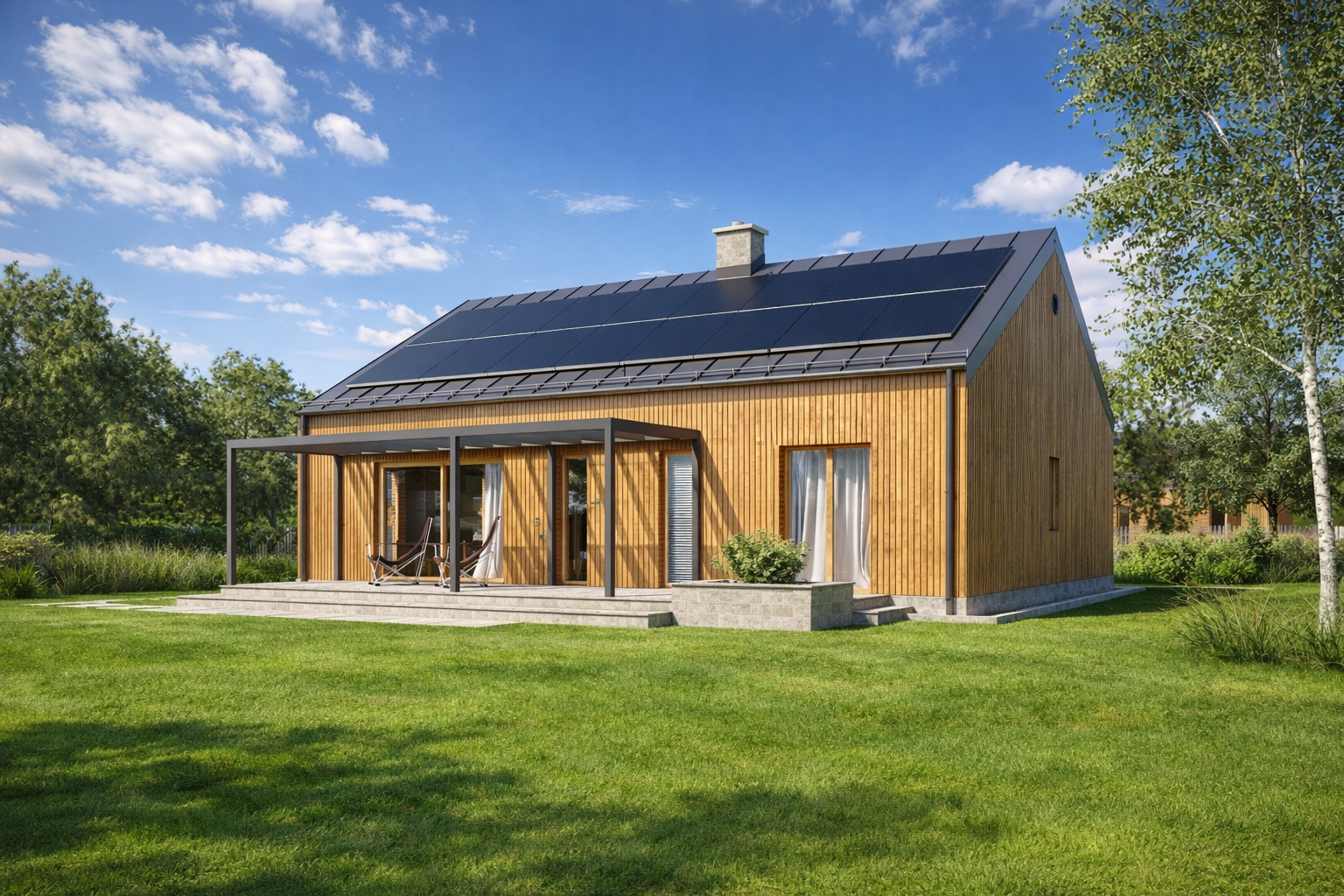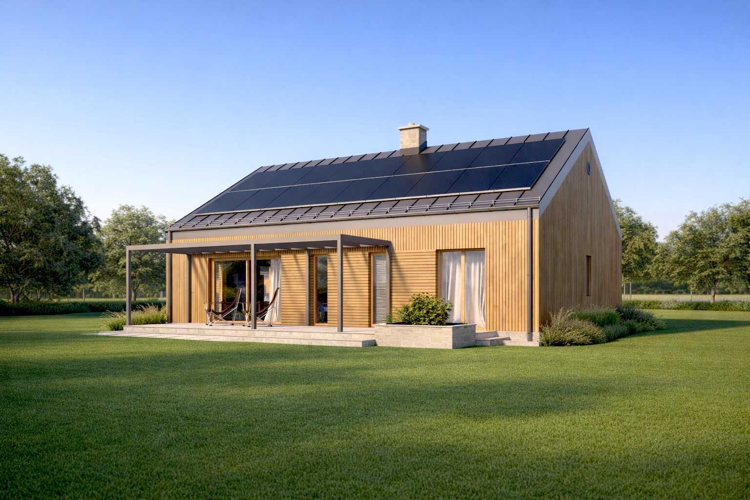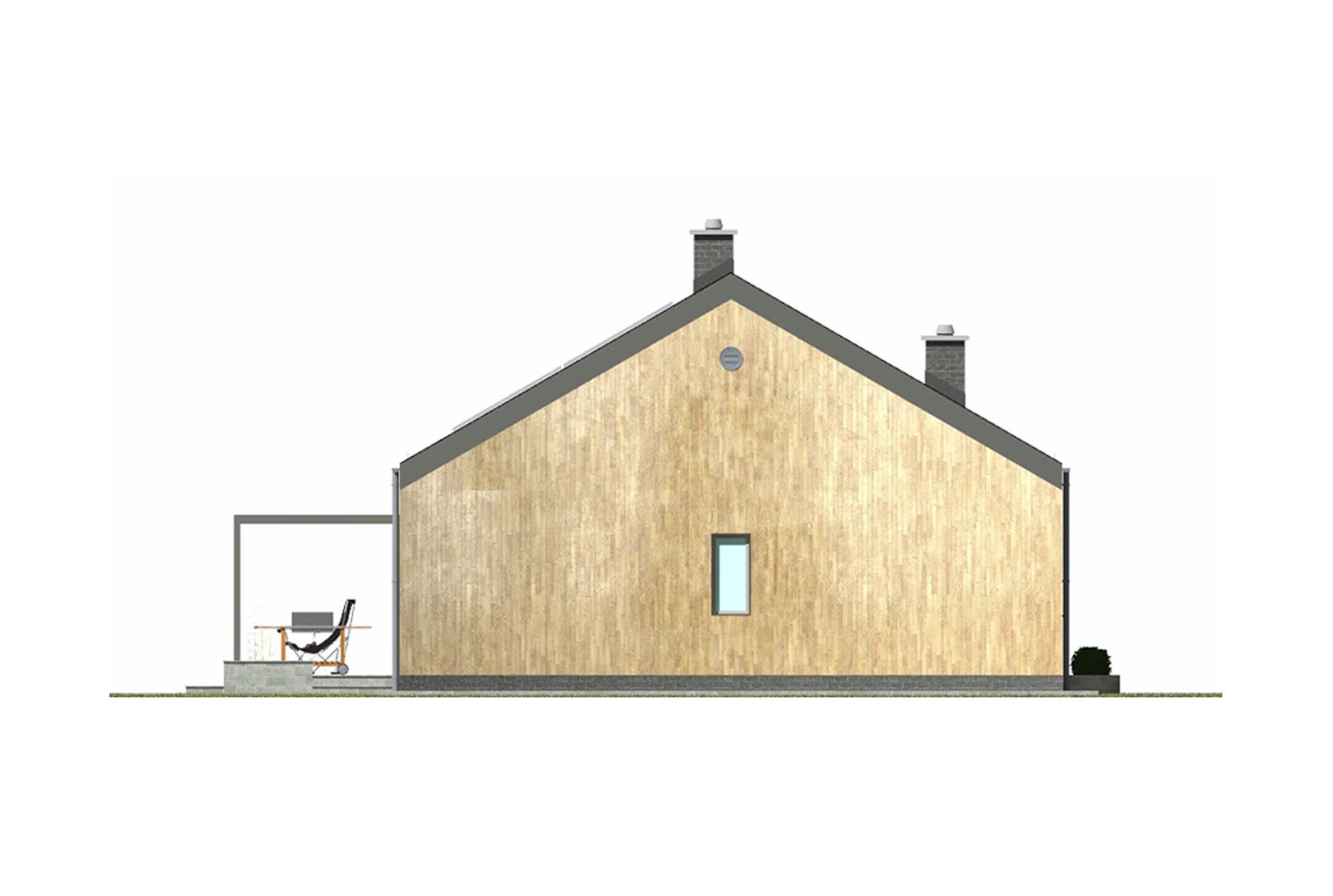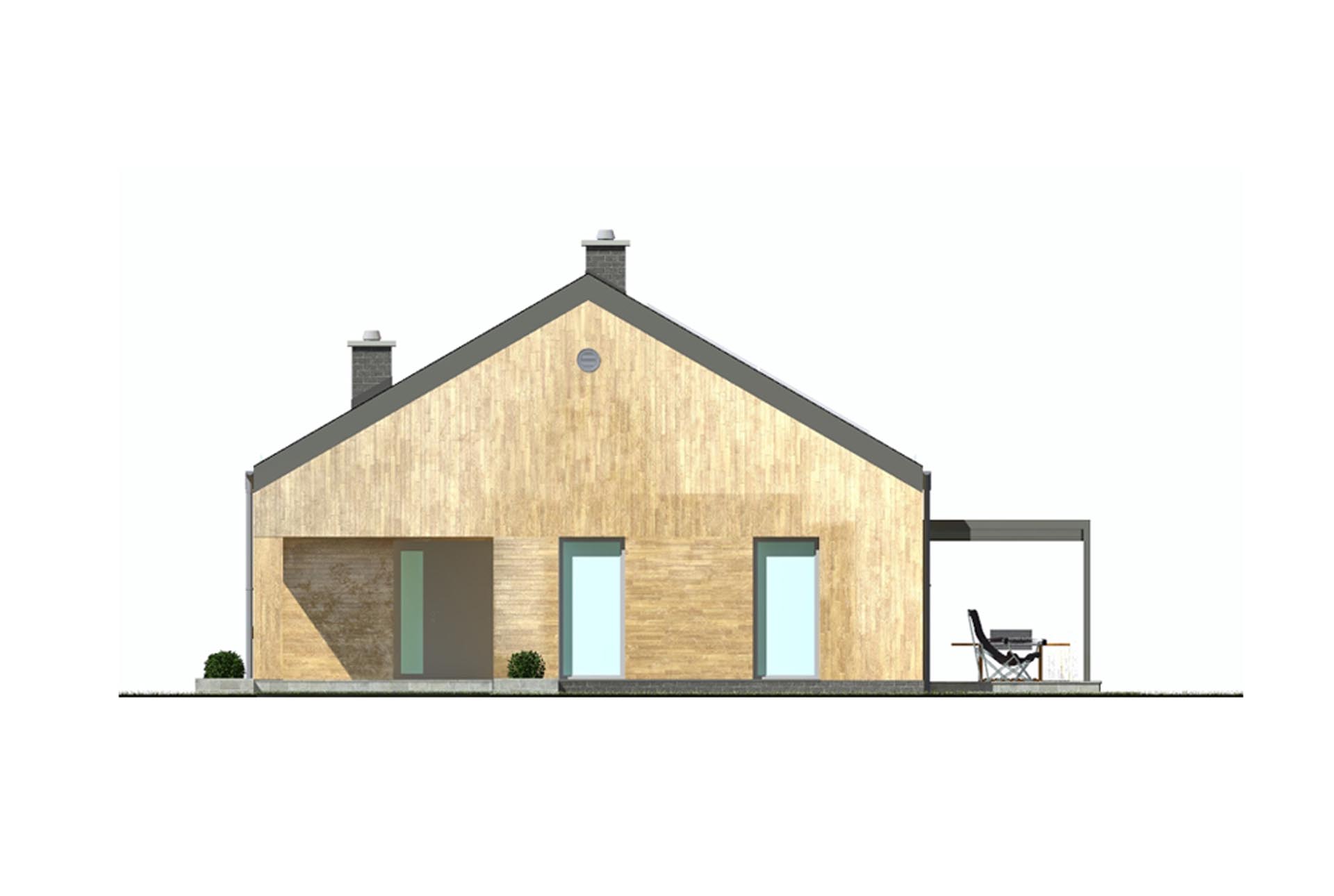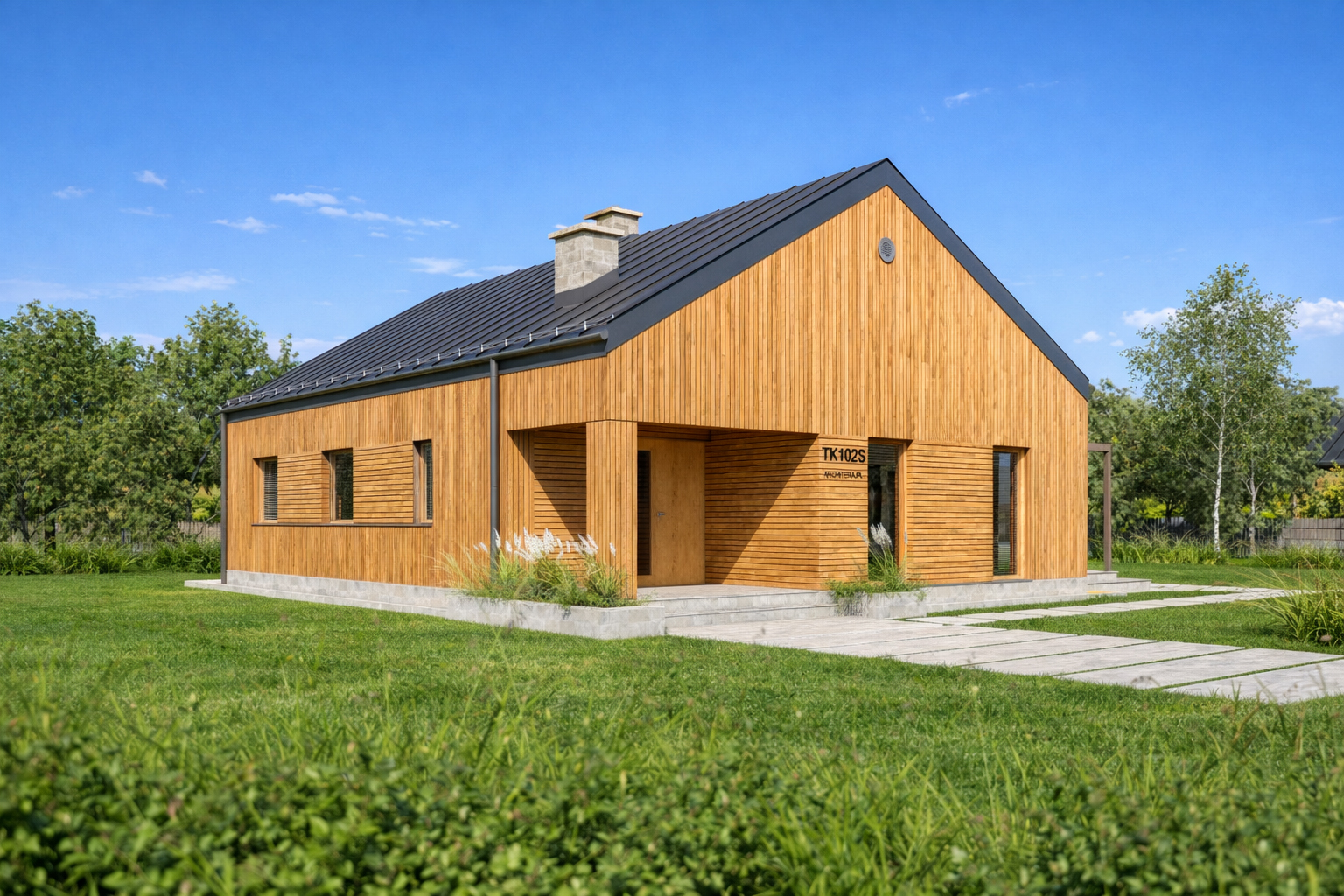 TK102sd minimalistyczny i wygodny dom parterowy zaprojektowany w formie nowoczesnej stodoły, w którym funkcjonalny układ pomieszczeń pozwoli wygodnie mieszkać czteroosobowej rodzinie. Bryła budynku oraz zastosowane rozwiązania konstrukcyjne i techniczne zapewniają niskie koszty budowy i użytkowania. Znajdziemy tu trzy wygodne pokoje, dwie łazienki i wygodną otwartą przestrzeń dzienną z kominkiem w salonie i jadalni. Otwarta kuchnia z wyspą nie tylko pomieści wszelkie konieczne sprzęty ale zapewni także doskonały widok na ogród. TK102sd jest domem w konstrukcji drewnianej szkieletowej.