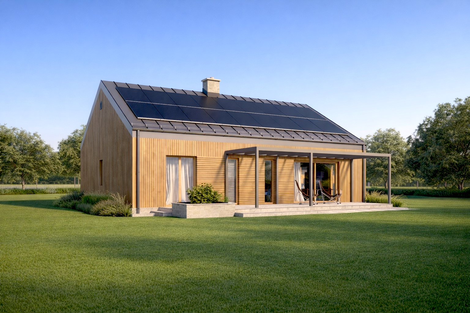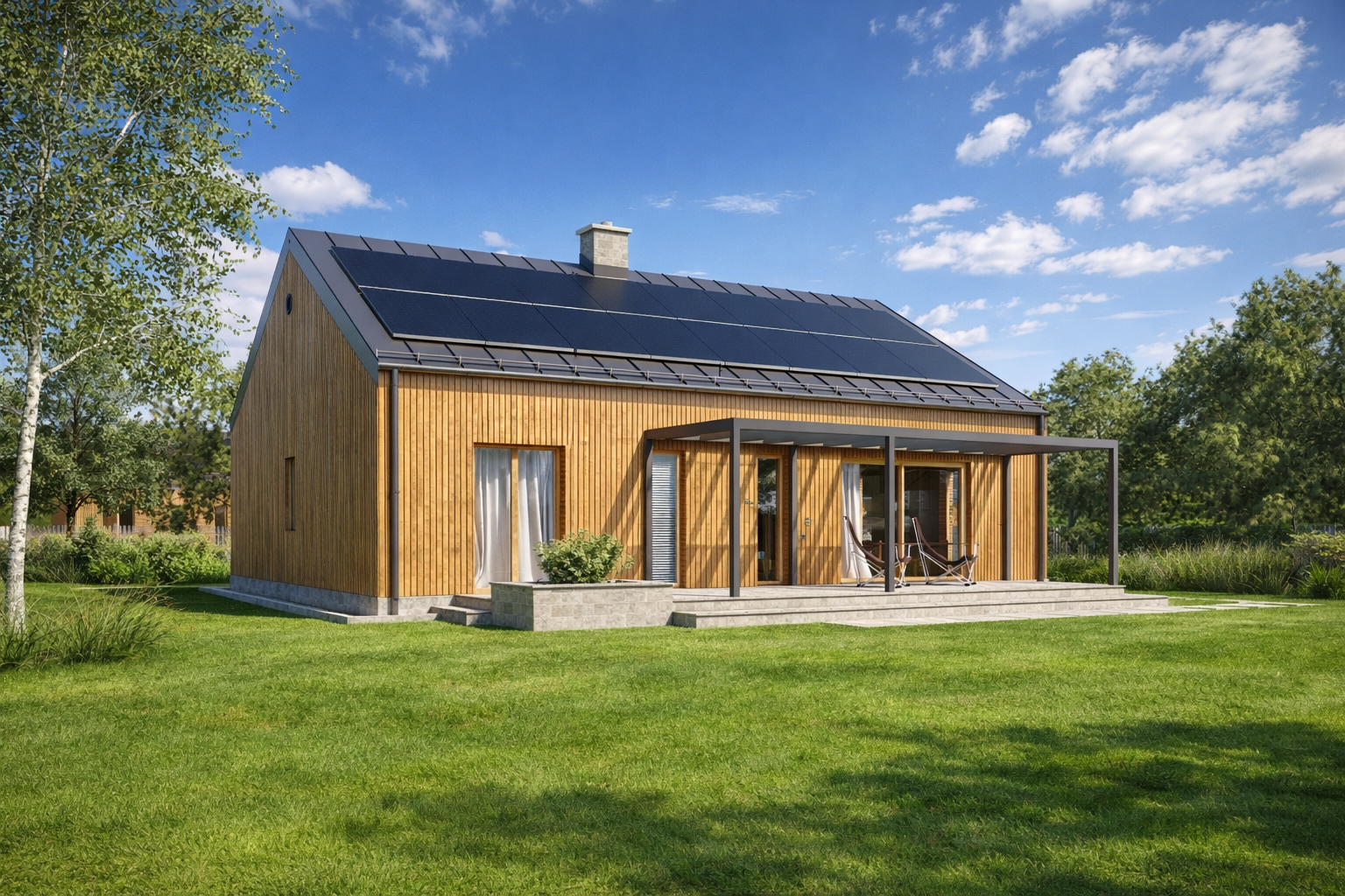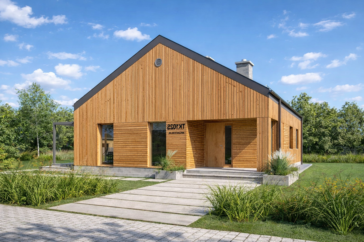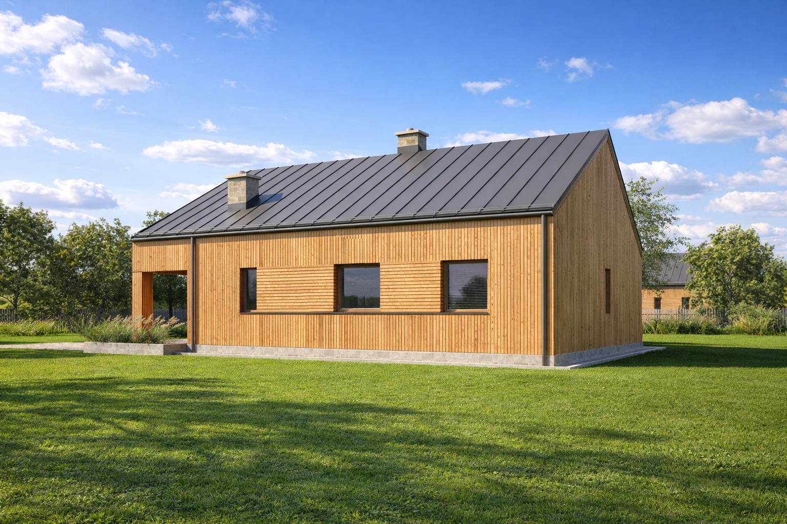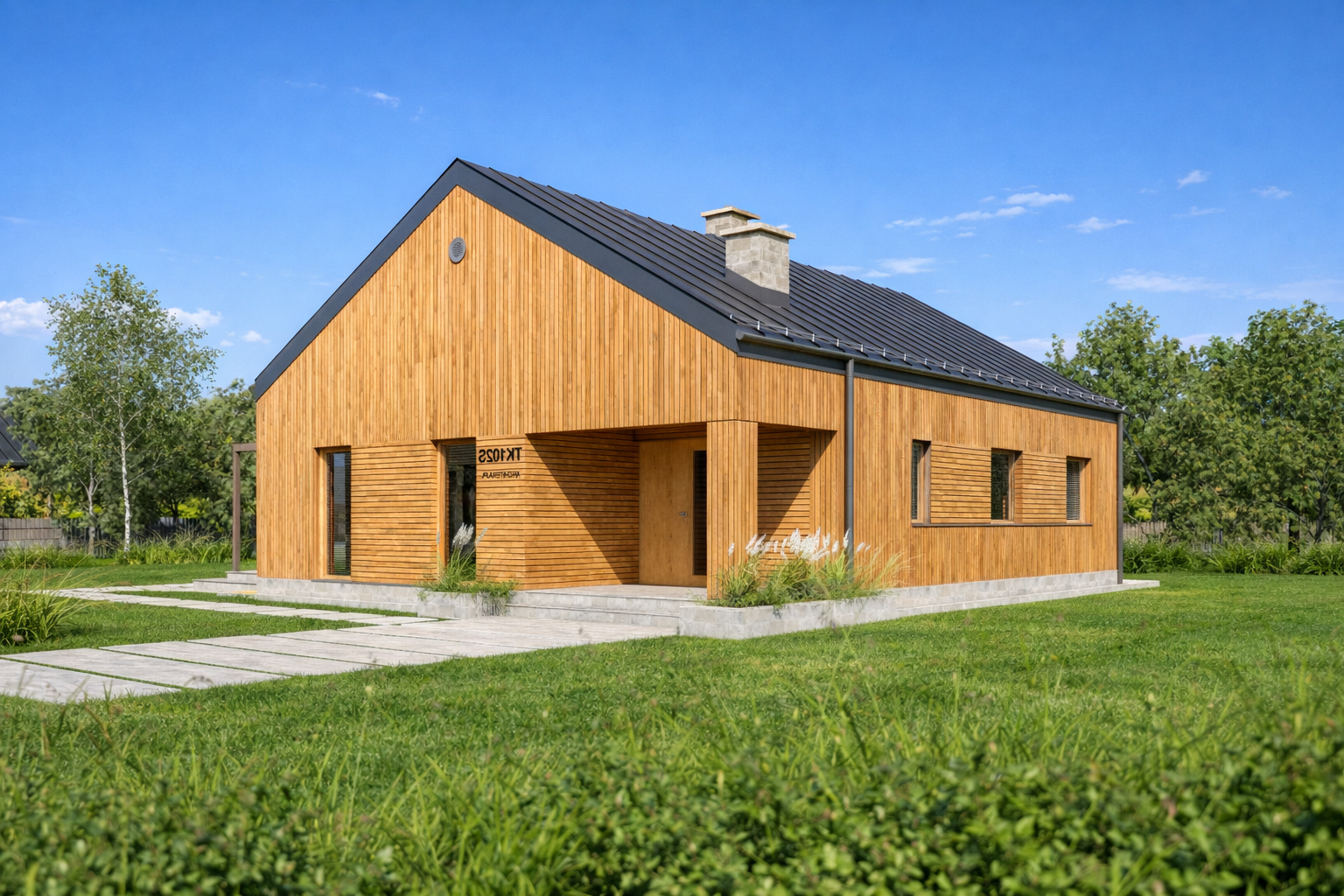 TK102sdl minimalistyczny i wygodny dom parterowy zaprojektowany w formie nowoczesnej stodoły, w którym funkcjonalny układ pomieszczeń pozwoli wygodnie mieszkać czteroosobowej rodzinie. Bryła budynku oraz zastosowane rozwiązania konstrukcyjne i techniczne zapewniają niskie koszty budowy i użytkowania. Znajdziemy tu trzy wygodne pokoje, dwie łazienki i wygodną otwartą przestrzeń dzienną z kominkiem w salonie i jadalni. Otwarta kuchnia z wyspą nie tylko pomieści wszelkie konieczne sprzęty ale zapewni także doskonały widok na ogród. TK102sd jest domem w konstrukcji drewnianej szkieletowej.