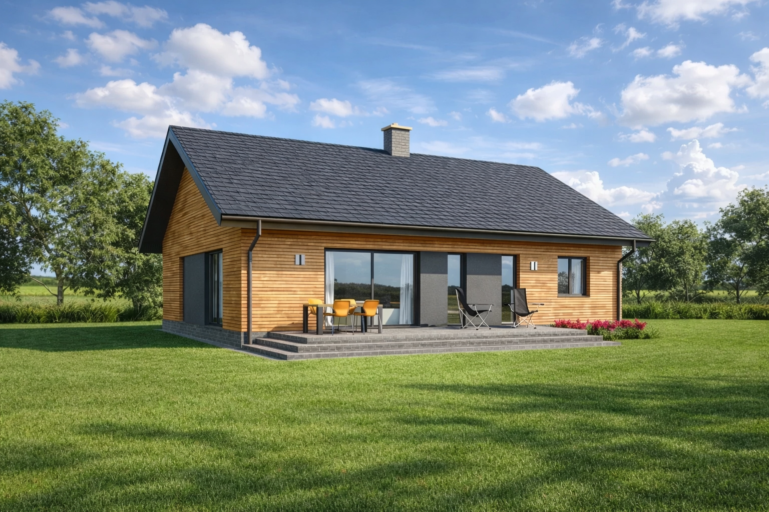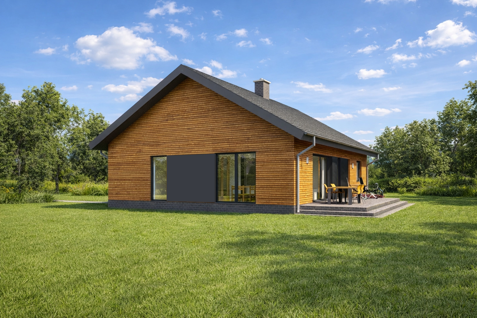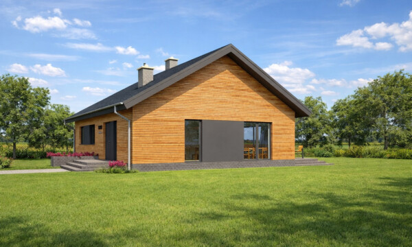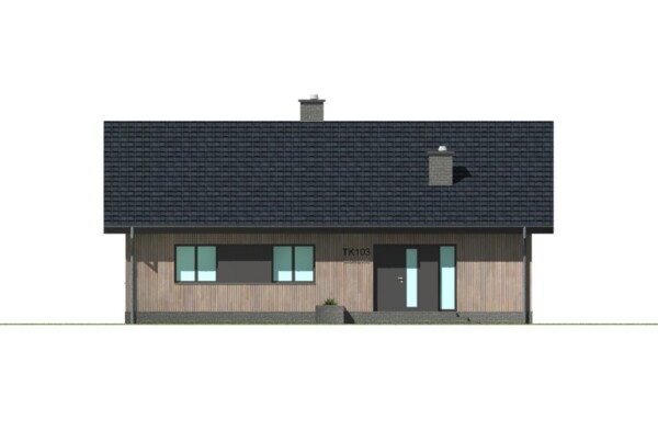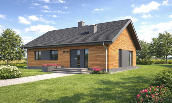 Prostota, wygoda i ekonomia użytkowania to główne cechy jakie ma spełnić ten parterowy dom. Na 106 metrach kwadratowych zaprojektowaliśmy wygodny salon z dużą jadalnią, sypialnię z odrębną garderobą, dwie łazienki, dwa wygodne pokoje i kuchnię która może być otwarta lub zamknięta w zależności od potrzeb. Pomieszczenie techniczne pomieści wszelkie niezbędne urządzenia grzewcze i techniczne dla obsługi domu. Bryła budynku oraz zastosowane rozwiązania konstrukcyjne zapewnią niskie koszty budowy. TK103 jest domem w konstrukcji drewnianej szkieletowej.