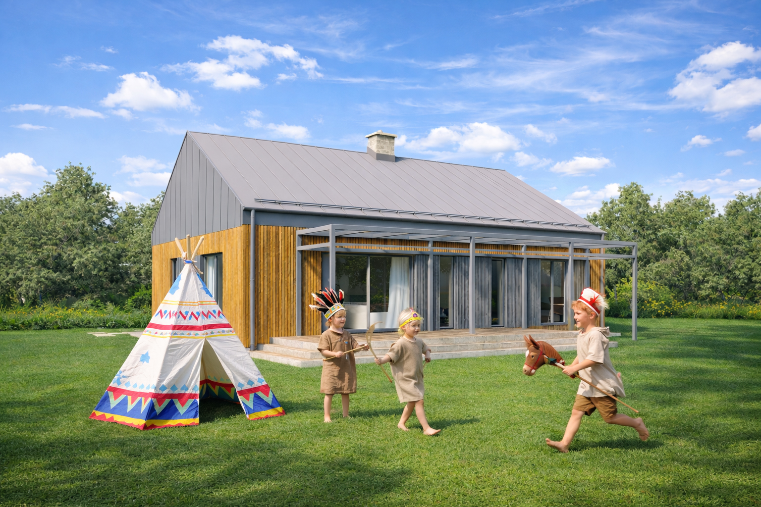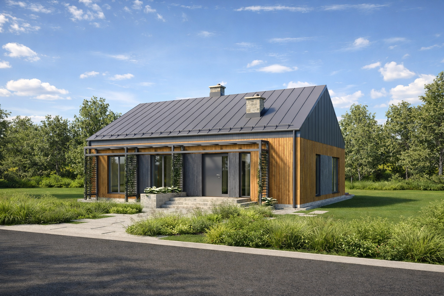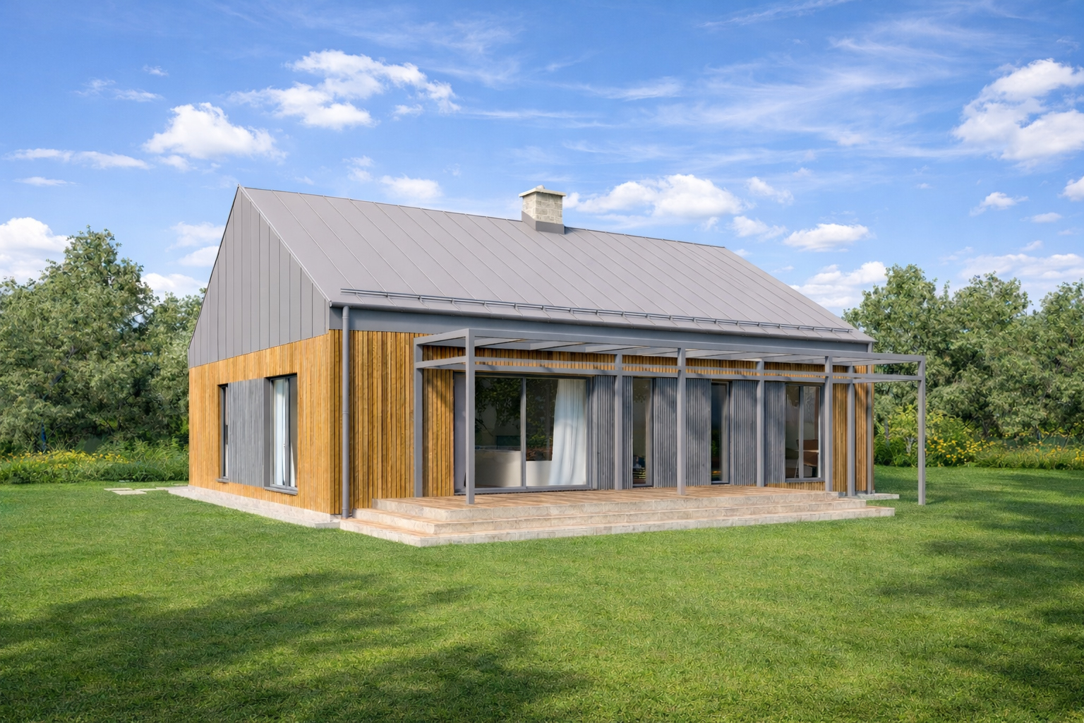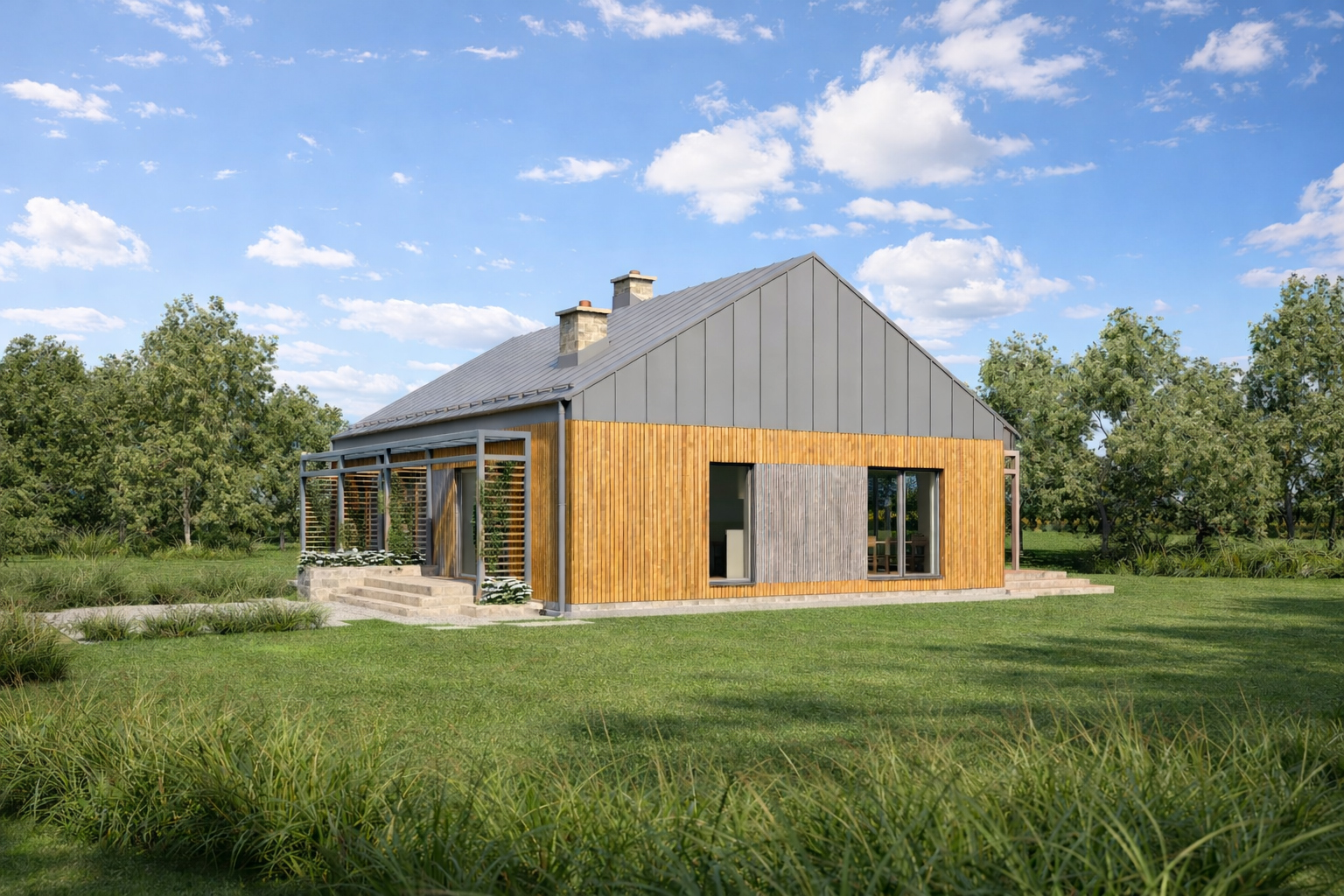 Prostota, wygoda i ekonomia użytkowania to główne cechy jakie ma spełnić ten parterowy dom. Na 106 metrach kwadratowych zaprojektowaliśmy wygodny salon z dużą jadalnią, sypialnię z odrębną garderobą, dwie łazienki, dwa wygodne pokoje i kuchnię która może być otwarta lub zamknięta w zależności od potrzeb. Pomieszczenie techniczne pomieści wszelkie niezbędne urządzenia grzewcze i techniczne dla obsługi domu. Bryła budynku oraz zastosowane rozwiązania konstrukcyjne zapewnią niskie koszty budowy. TK103 jest domem w konstrukcji drewnianej szkieletowej.