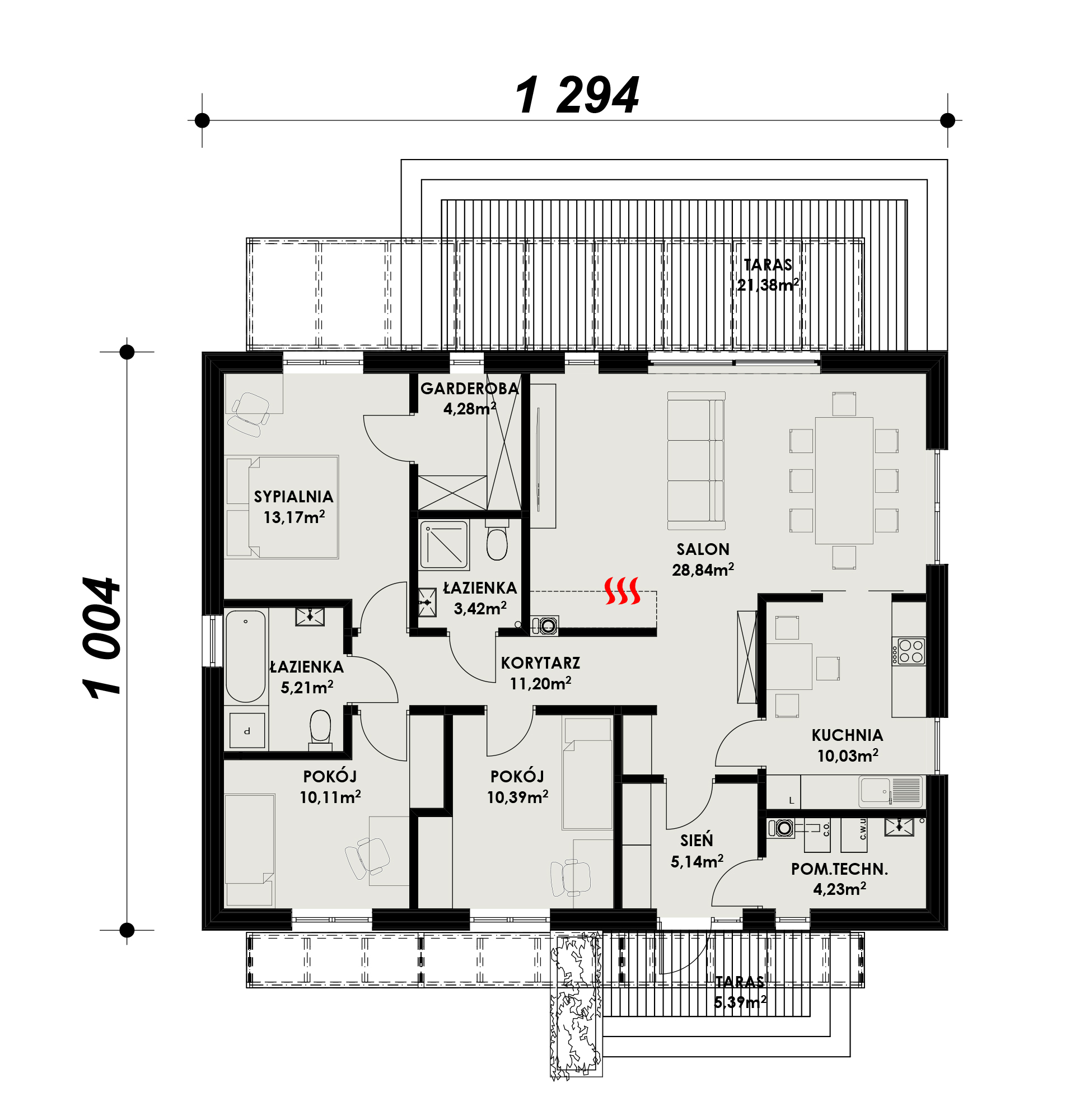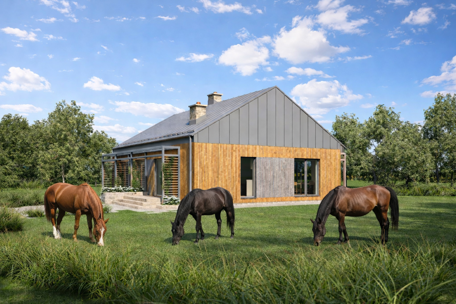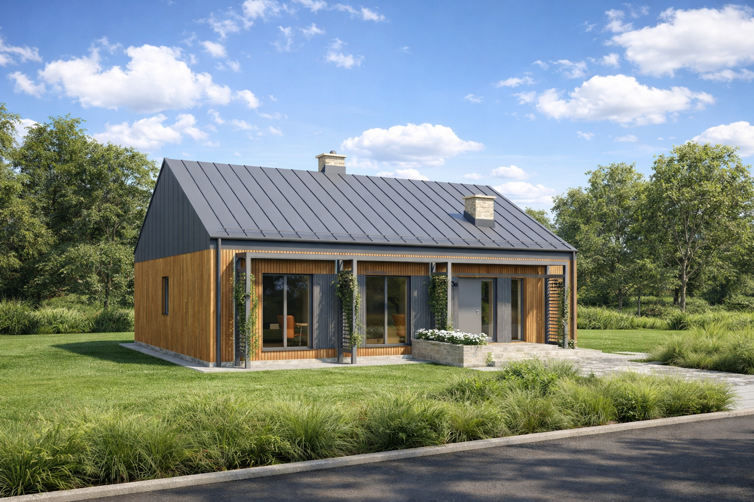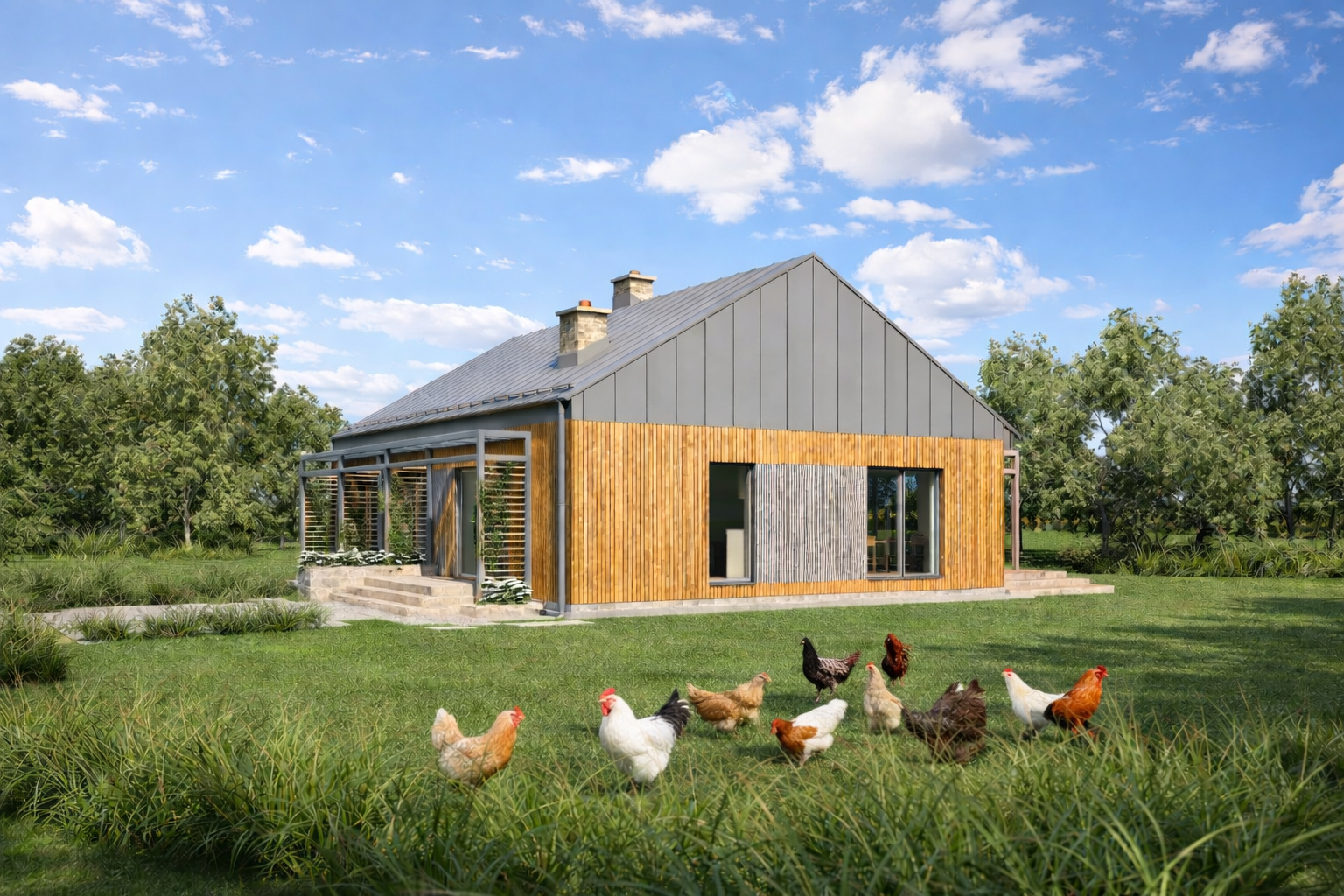 Prostota, wygoda i ekonomia użytkowania to główne cechy jakie ma spełnić ten parterowy dom. Na 106 metrach kwadratowych zaprojektowaliśmy wygodny salon z dużą jadalnią, sypialnię z odrębną garderobą, dwie łazienki, dwa wygodne pokoje i kuchnię która może być otwarta lub zamknięta w zależności od potrzeb. Pomieszczenie techniczne pomieści wszelkie niezbędne urządzenia grzewcze i techniczne dla obsługi domu. Bryła budynku oraz zastosowane rozwiązania konstrukcyjne zapewnią niskie koszty budowy. TK103 jest domem w konstrukcji drewnianej szkieletowej.