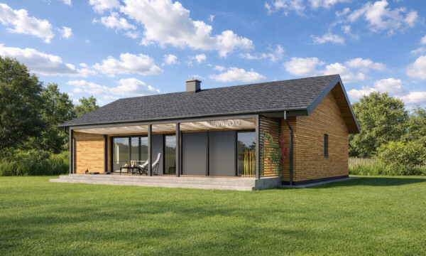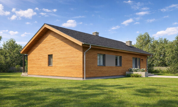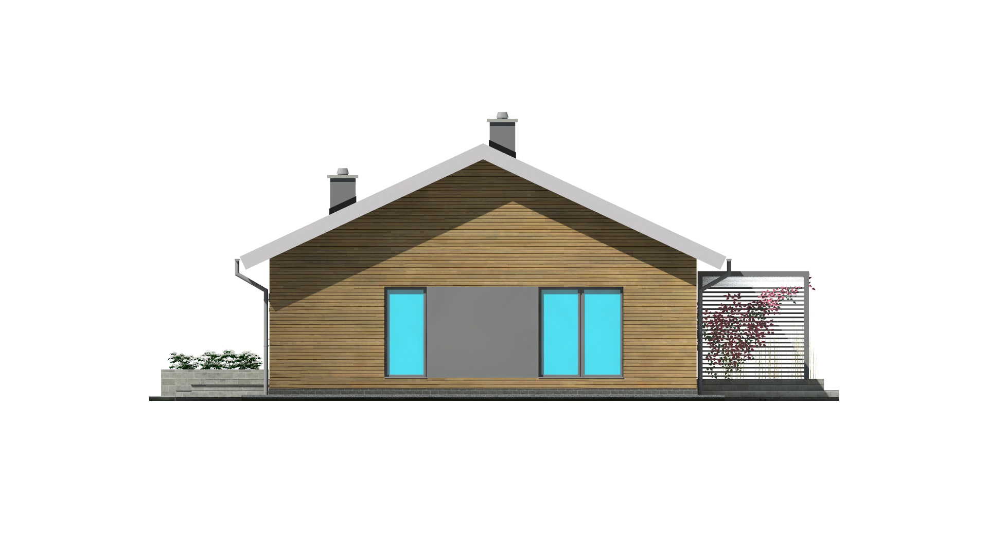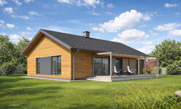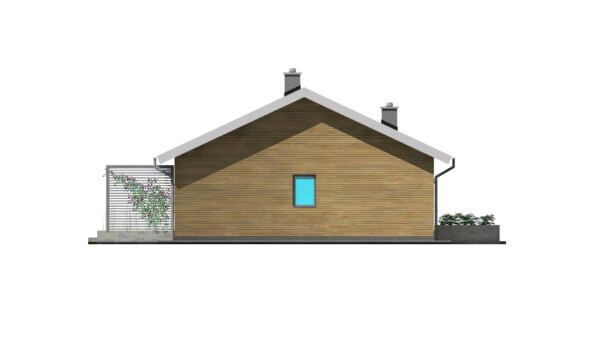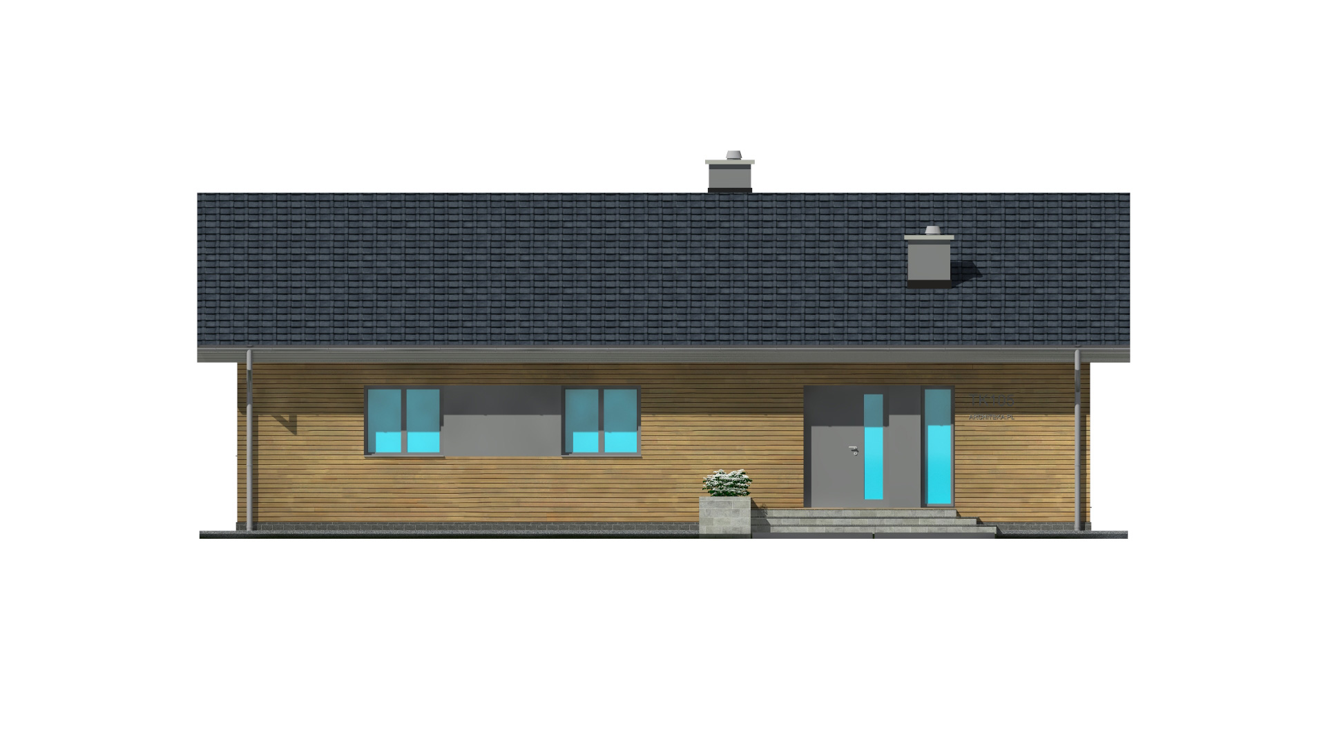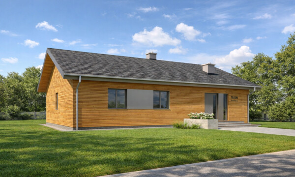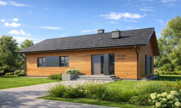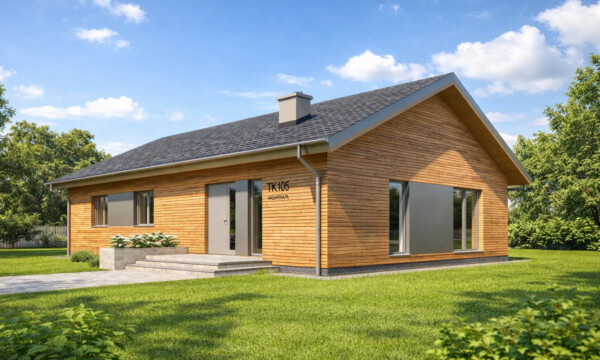 TK105 to projekt domu parterowego o zwartej bryle i funkcjonalnej przestrzeni wewnętrznej. Prosta konstrukcja budynku zapewnia niskie koszty realizacji i użytkowania budynku. W układzie funkcjonalnym domu istnieje wyraźny podział na część dzienną i nocną, dzięki czemu pomimo niewielkiej powierzchni mieszkańcy mogą jednocześnie, swobodnie użytkować każdą z nich. Szeroko otwarta na widok zewnętrzny strefa dzienna łączy w sobie funkcję salonu, jadalni i kuchni. Odpowiednia ilość przeszkleń zapewnia dużą ilość naturalnego światła oraz podnosi walory estetyczne wnętrza. Atutem kuchni w projekcie TK105 jest możliwość wydzielenia lub otwarcia przestrzeni dzięki zastosowanym szerokim drzwiom przesuwnym. Zaprojektowana w drugiej części domu strefa prywatna obejmuje dwa pokoje dla dzieci, sypialnię rodziców z własną łazienką oraz garderobę i łazienkę wspólną. Ponadto wygospodarowano miejsce na pralnię oraz wc dla gości w części dziennej. Pomieszczenie techniczne może służyć jako miejsce dla pompy ciepła i rekuperatora lub stanowić kotłownię na paliwo stałe lub gazowe. TK105 jest domem w konstrukcji drewnianej szkieletowej.