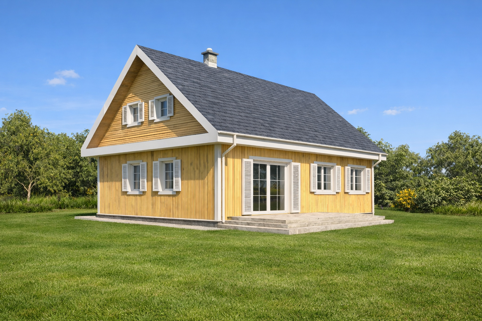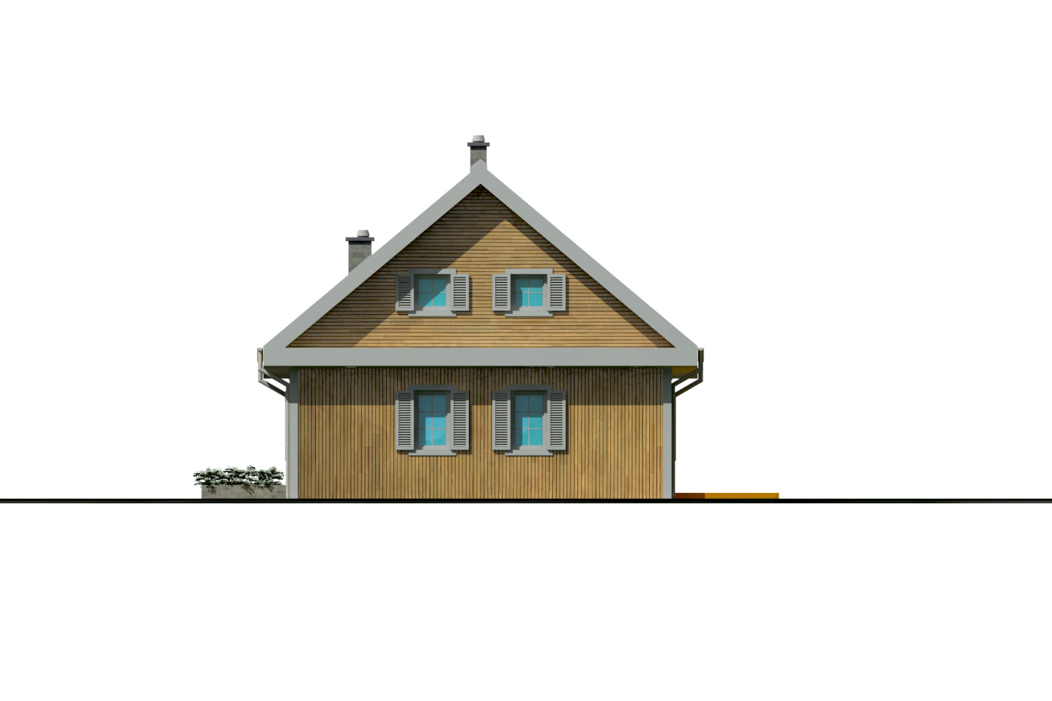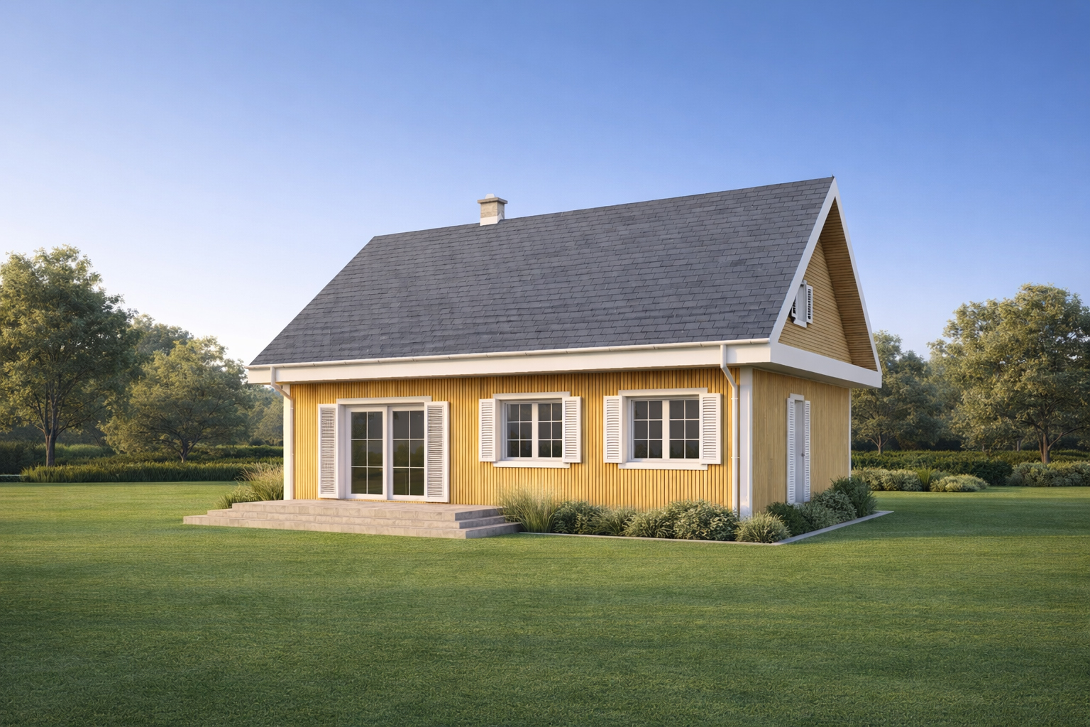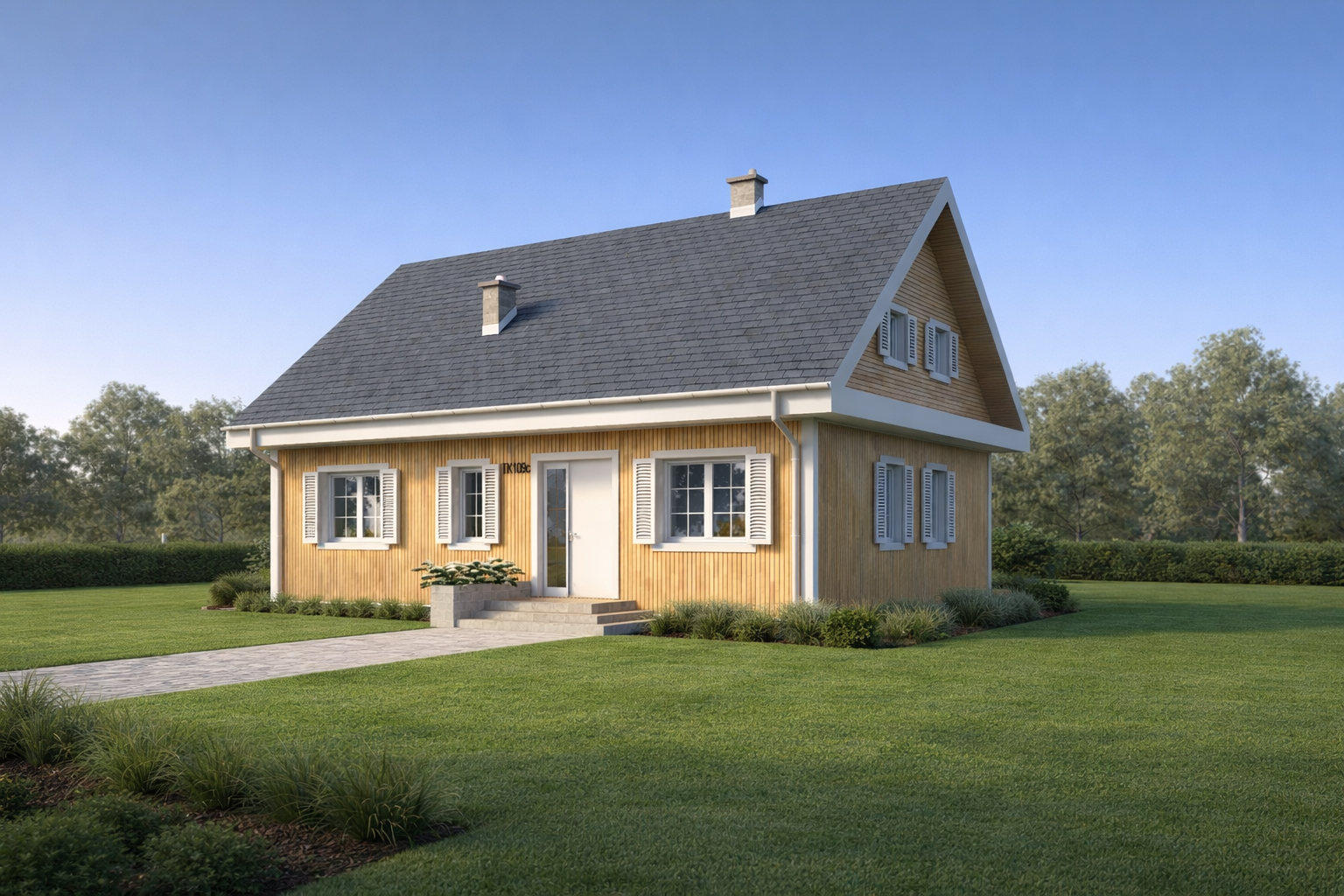 Projekt został stworzony z myślą o komforcie czteroosobowej rodziny. Zwarta bryła, prosty dwuspadowy dach oraz przemyślany układ pomieszczeń sprawiają, że jest to tani w budowie i eksploatacji dom całoroczny, który doskonale sprawdzi się zarówno w mieście, jak i na działce podmiejskiej.