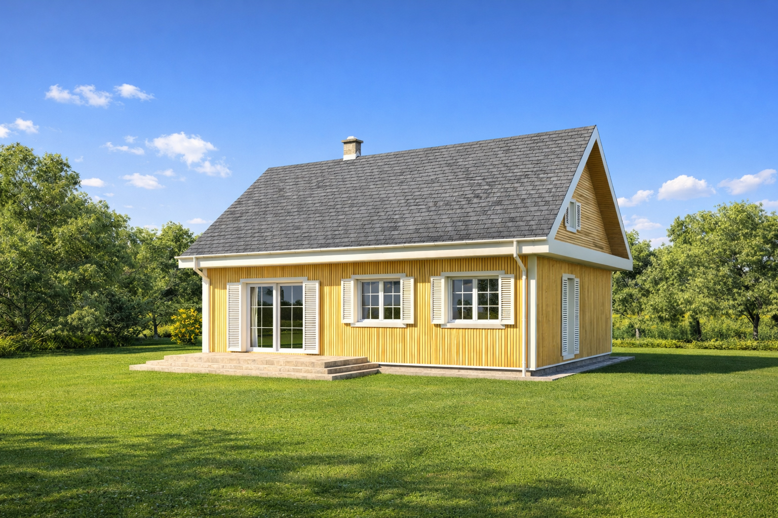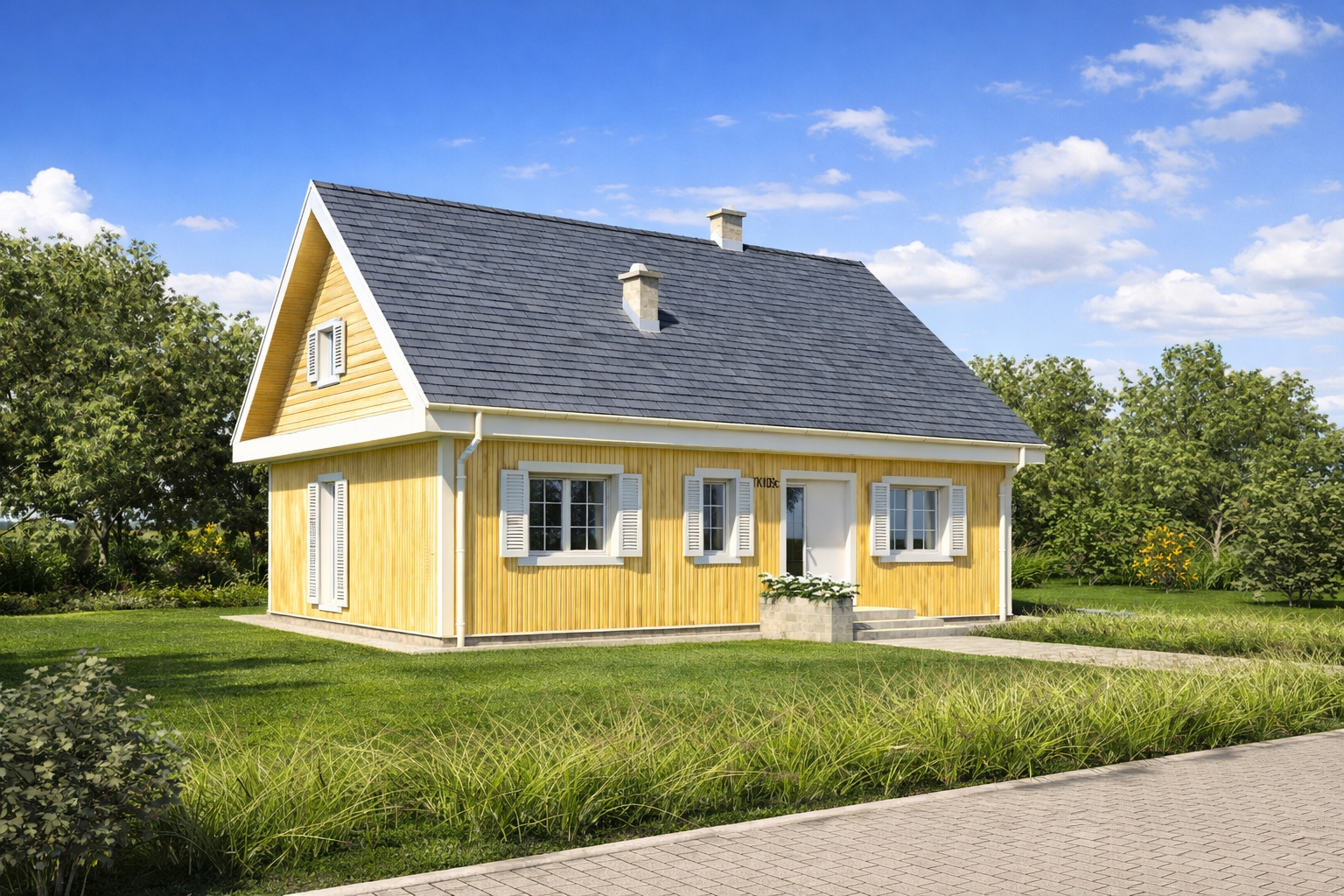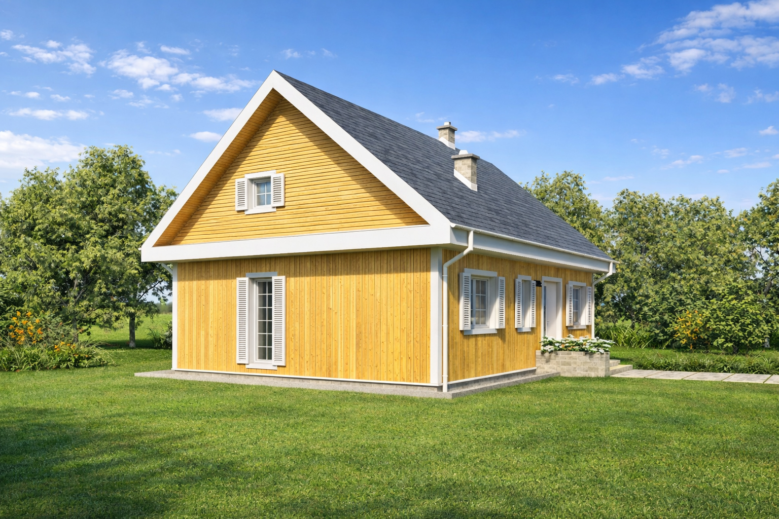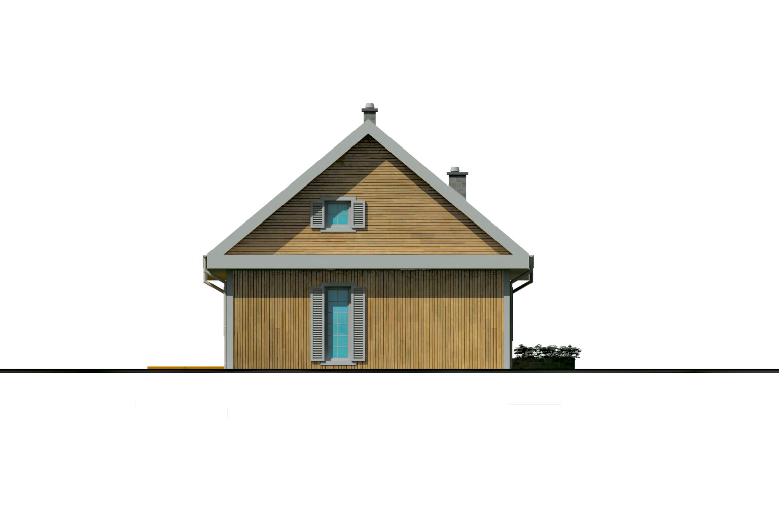 Projekt został stworzony z myślą o komforcie czteroosobowej rodziny. Zwarta bryła, prosty dwuspadowy dach oraz przemyślany układ pomieszczeń sprawiają, że jest to tani w budowie i eksploatacji dom całoroczny, który doskonale sprawdzi się zarówno w mieście, jak i na działce podmiejskiej.