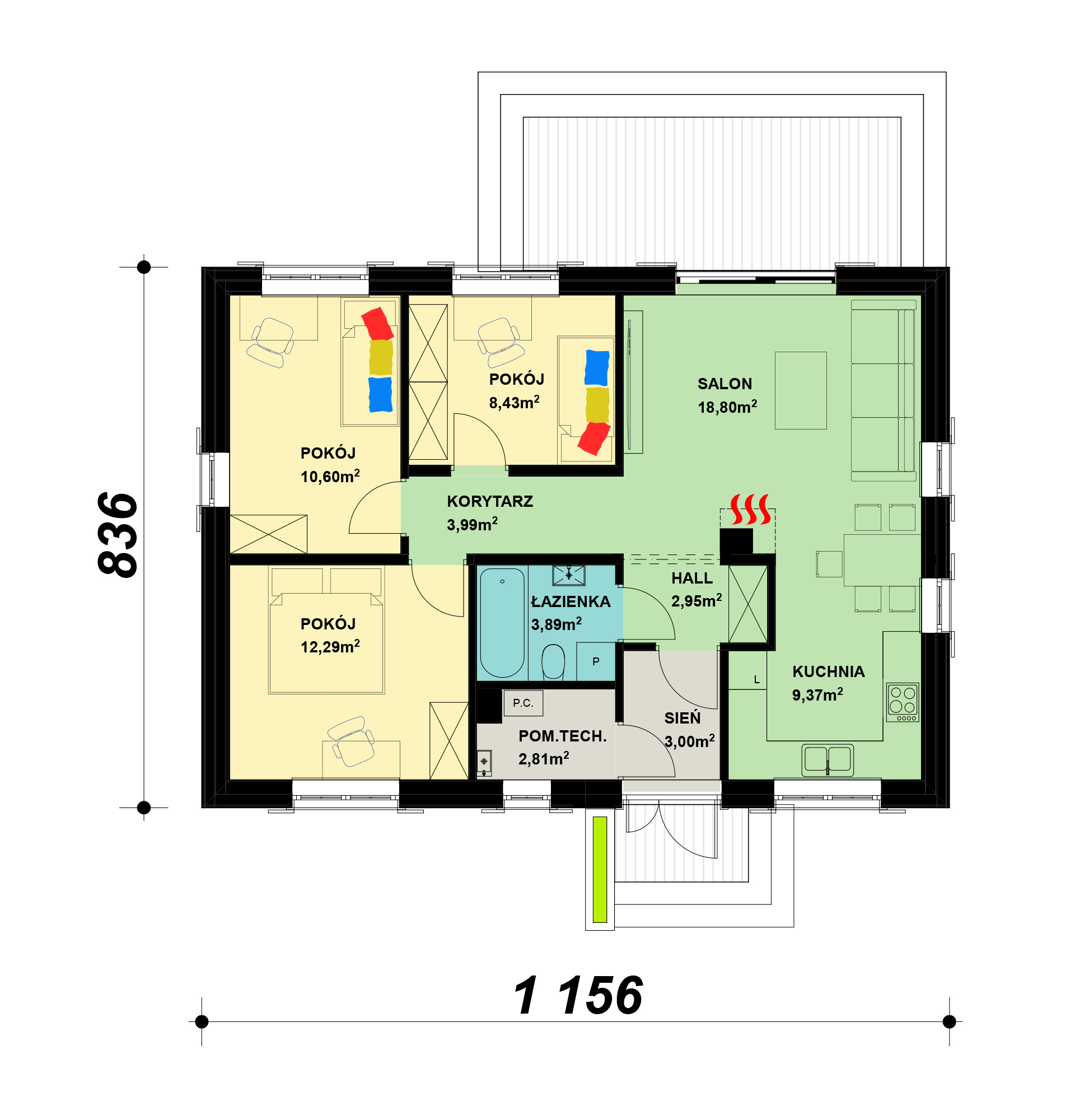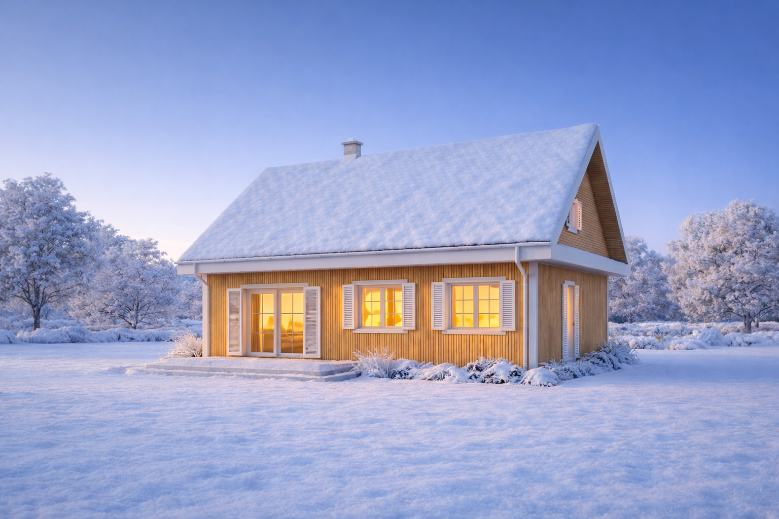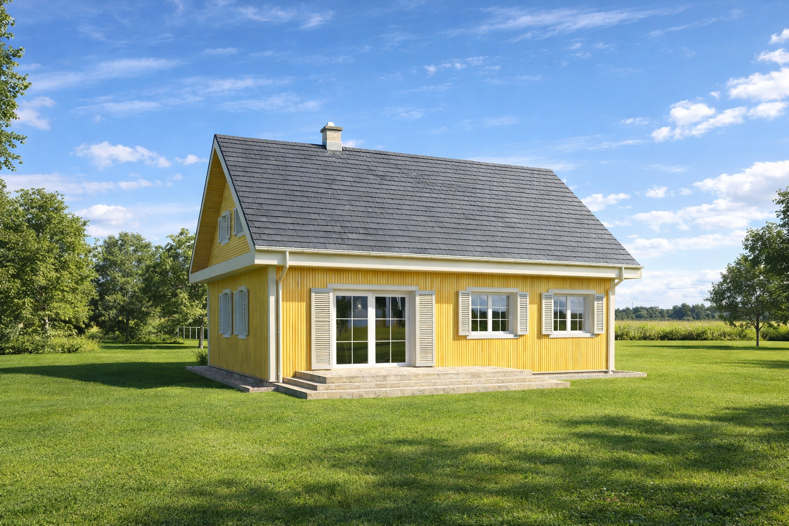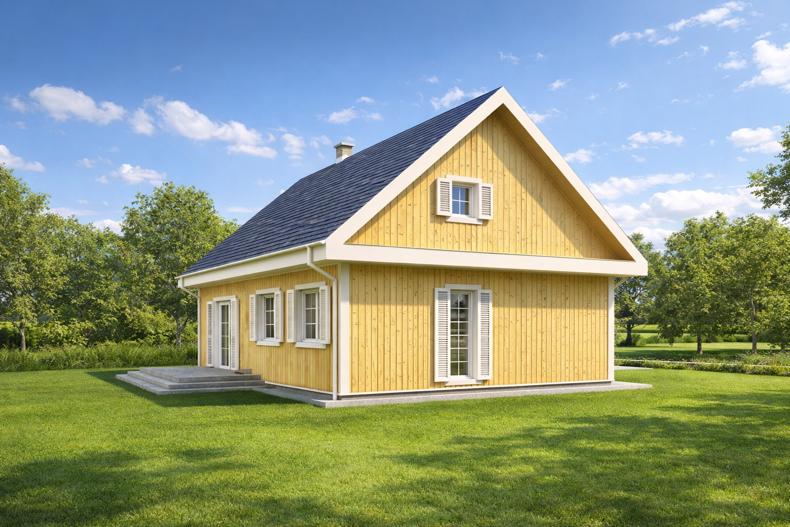 Projekt został stworzony z myślą o komforcie czteroosobowej rodziny. Zwarta bryła, prosty dwuspadowy dach oraz przemyślany układ pomieszczeń sprawiają, że jest to tani w budowie i eksploatacji dom całoroczny, który doskonale sprawdzi się zarówno w mieście, jak i na działce podmiejskiej.
