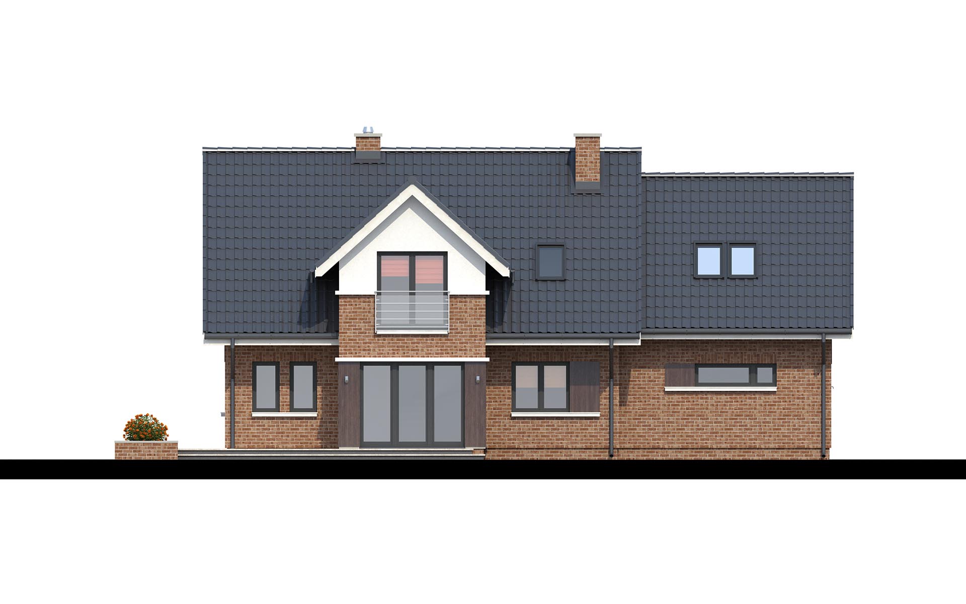 Dom jednorodzinny z poddaszem użytkowym, odpowiedni dla rodziny 4-6 osobowej. Na parterze atrakcyjna strefa dzienna z kominkiem i jadalnią, która dzięki dużym przeszkleniom otwiera się na ogród . Kuchnia częściowo otwarta na salon dzięki podwójnym drzwiom przesuwnym. Na poddaszu aż cztery sypialnie, łazienka i garderoba. Bogaty program funkcjonalny na niewielkiej powierzchni zadecydował , iż jest bardzo popularny projekt wśród rodzin wielodzietnych.