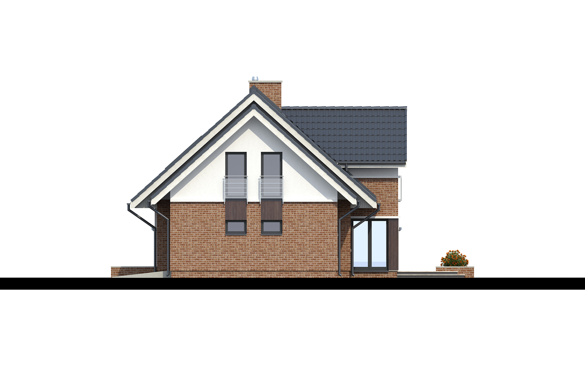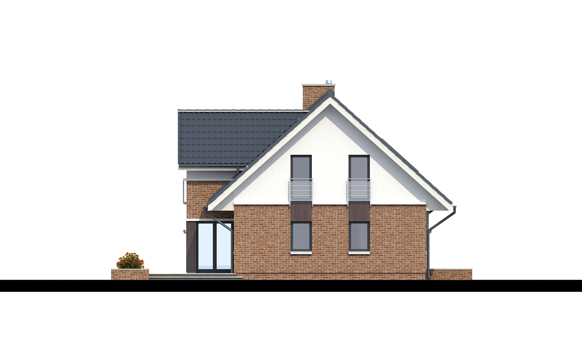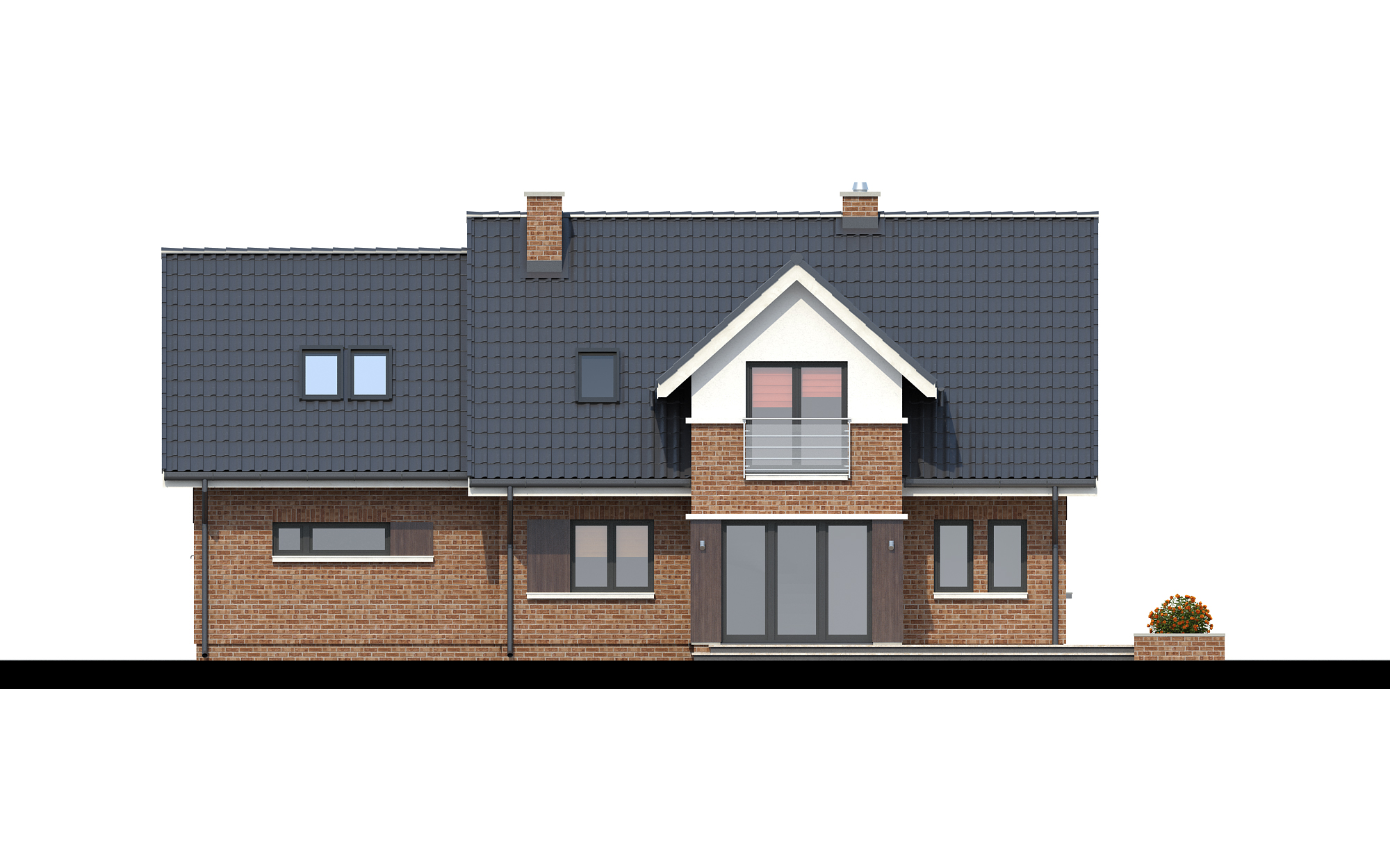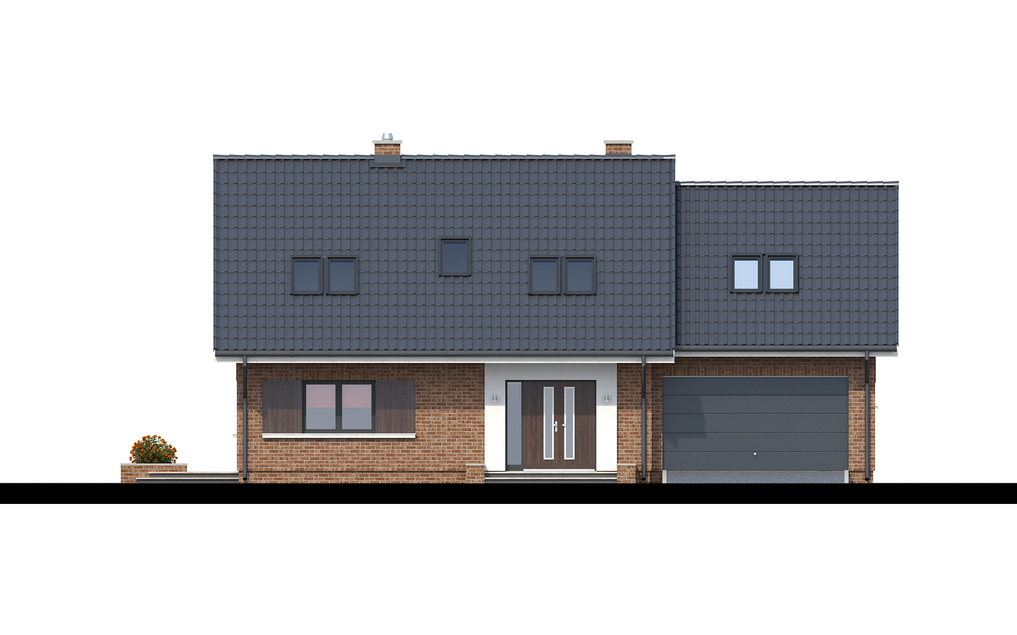 Dom jednorodzinny z poddaszem użytkowym, odpowiedni dla rodziny 4-6 osobowej. Na parterze atrakcyjna strefa dzienna z kominkiem i jadalnią, która dzięki dużym przeszkleniom otwiera się na ogród . Kuchnia częściowo otwarta na salon dzięki podwójnym drzwiom przesuwnym. Na poddaszu aż cztery sypialnie, łazienka i garderoba. Bogaty program funkcjonalny na niewielkiej powierzchni zadecydował , iż jest bardzo popularny projekt wśród rodzin wielodzietnych.