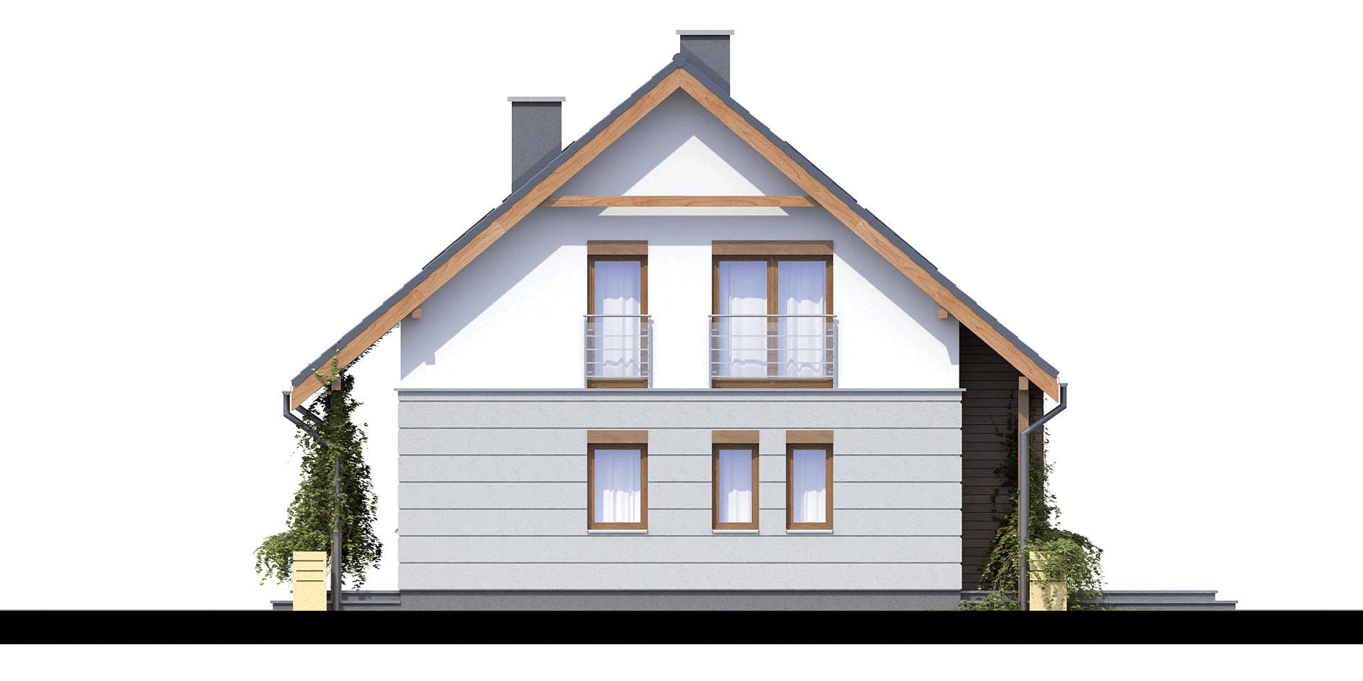 Funkcjonalny, nieduży dom dla rodziny 4-5 osobowej. Na parterze liczne pomieszczenia pomocnicze, jak: pralnia, spiżarnia przy kuchni czy pomieszczenie gospodarcze dostępne z ogrodu, które znacznie ułatwi życie domownikom. W przypadku zapotrzebowania na dodatkowy pokój można zrezygnować z pralni i pomieszczenia gospodarczego, a w ich miejscu stworzyć np. gabinet. Na piętrze znajdują się trzy ustawne sypialnie oraz dwie duże łazienki.