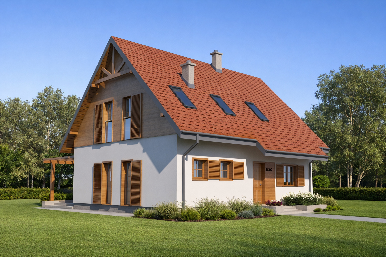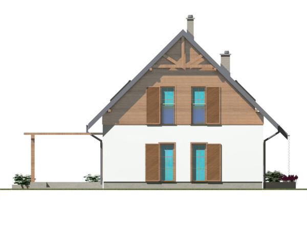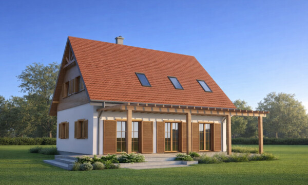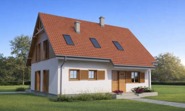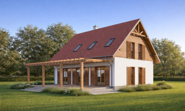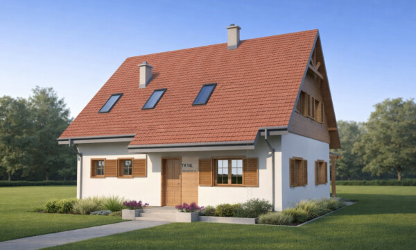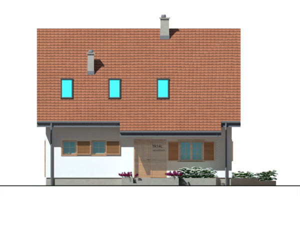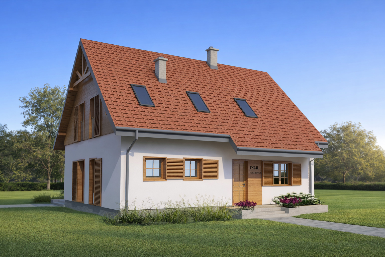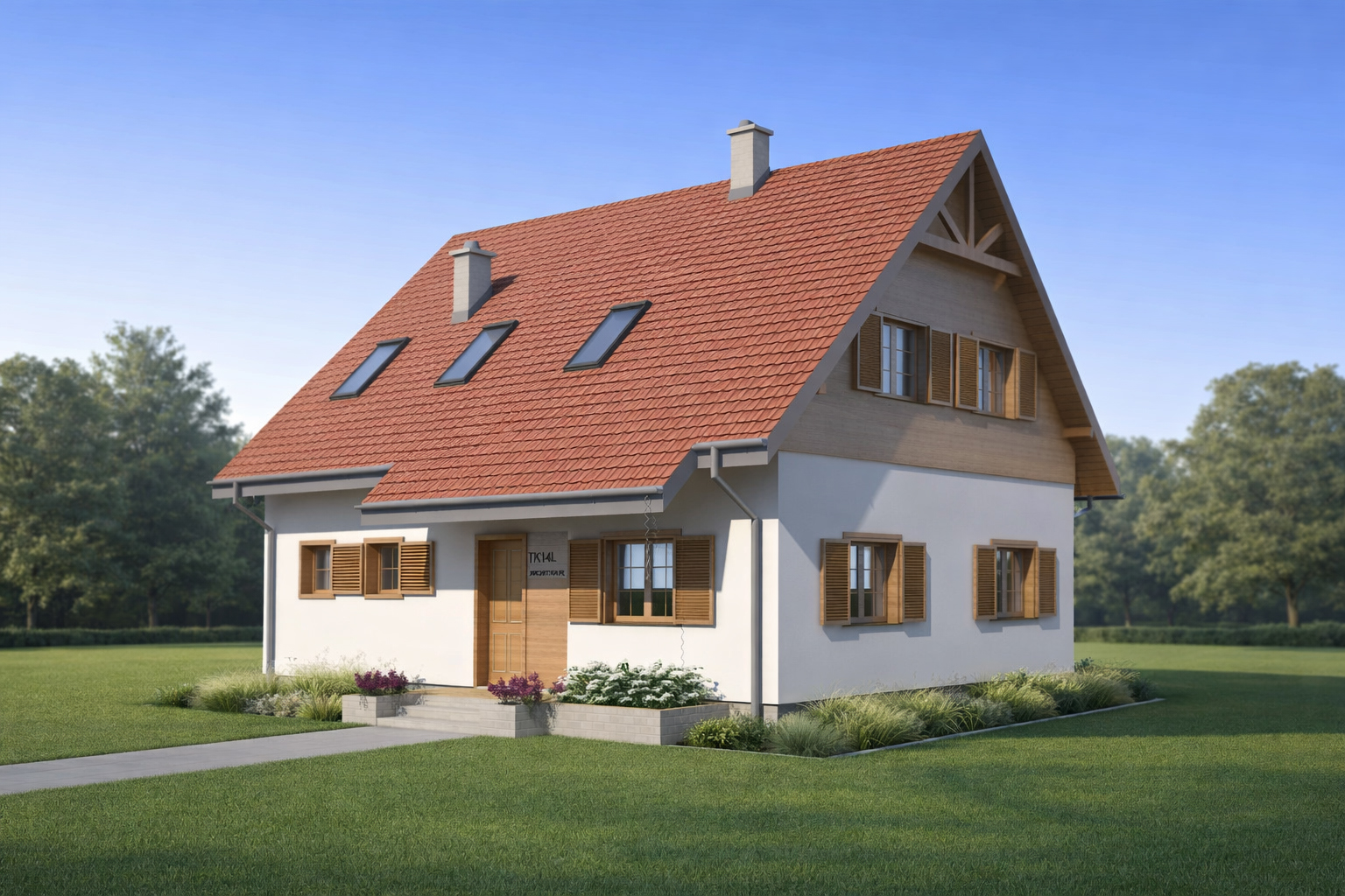 TK 14L to tradycyjny dom z poddaszem użytkowym oferujący atrakcyjne i funkcjonalne wnętrza. Na parterze znajdzie się przestronna i otwarta przestrzeń dzienna z kominkiem i miejscem na obszerny jadalniany stół. Wygodna doświetlona kuchnia z możliwością zamknięcia pomieści wszelkie sprzęty AGD oraz miejsce na stół śniadaniowy. Na parterze znajdziemy też miejsce na pokój dla gości lub gabinet oraz wygodną łazienkę. W części technicznej wygodne pomieszczenie techniczne, które zmieści dowolne źródło ogrzewania. Duży taras od strony ogrodu przekryty pergolą i otoczony zielenią pozwoli cieszyć się ciepłymi letnimi wieczorami. Na poddaszu dwa obszerne pokoje, duża łazienka z wanną oraz pomieszczenie na pralnię.