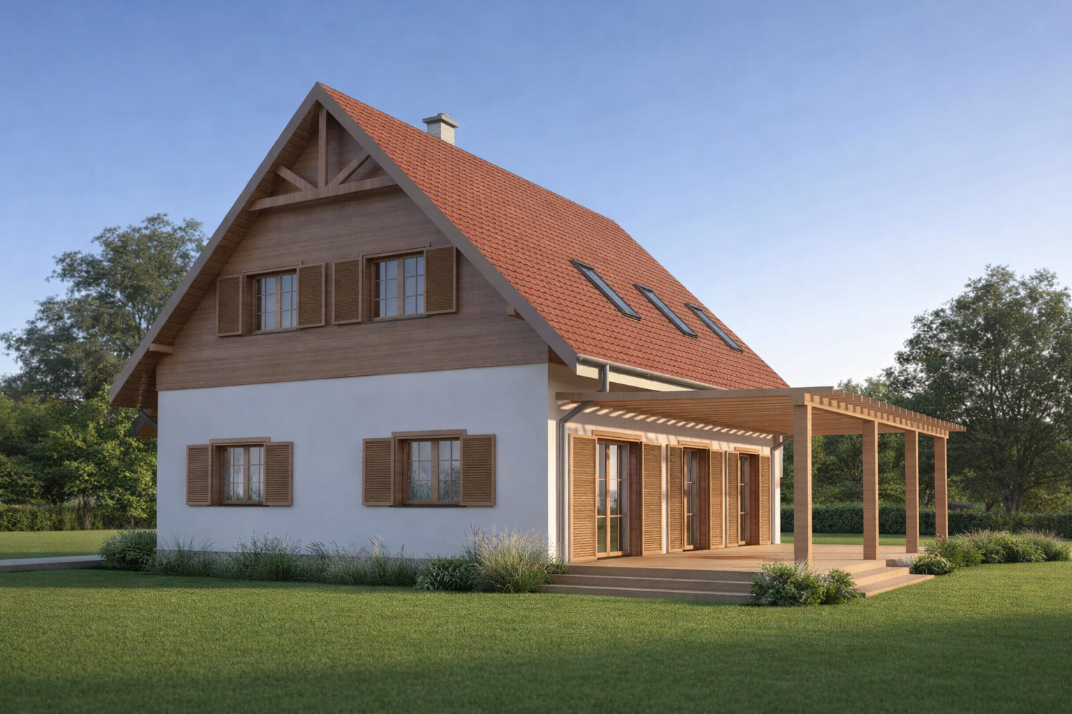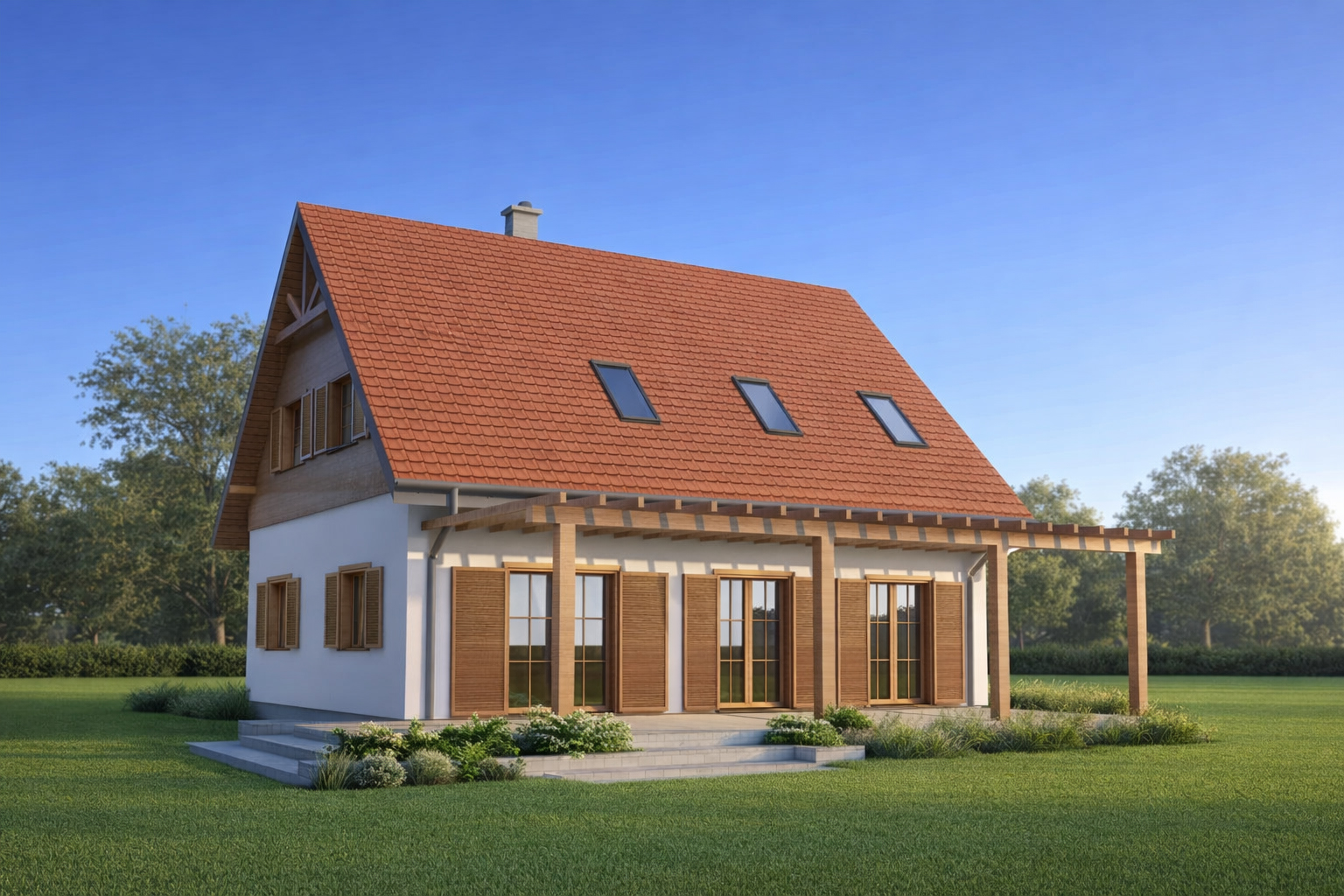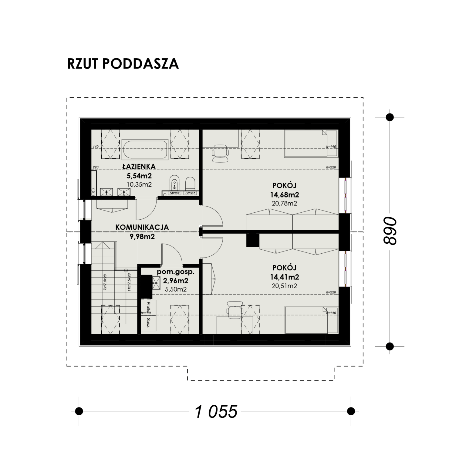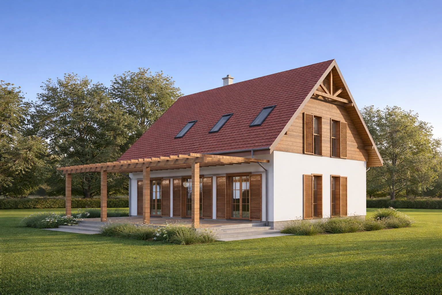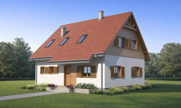 TK 14L to tradycyjny dom z poddaszem użytkowym oferujący atrakcyjne i funkcjonalne wnętrza. Na parterze znajdzie się przestronna i otwarta przestrzeń dzienna z kominkiem i miejscem na obszerny jadalniany stół. Wygodna doświetlona kuchnia z możliwością zamknięcia pomieści wszelkie sprzęty AGD oraz miejsce na stół śniadaniowy. Na parterze znajdziemy też miejsce na pokój dla gości lub gabinet oraz wygodną łazienkę. W części technicznej wygodne pomieszczenie techniczne, które zmieści dowolne źródło ogrzewania. Duży taras od strony ogrodu przekryty pergolą i otoczony zielenią pozwoli cieszyć się ciepłymi letnimi wieczorami. Na poddaszu dwa obszerne pokoje, duża łazienka z wanną oraz pomieszczenie na pralnię.