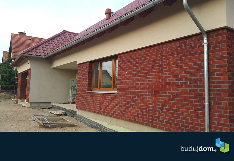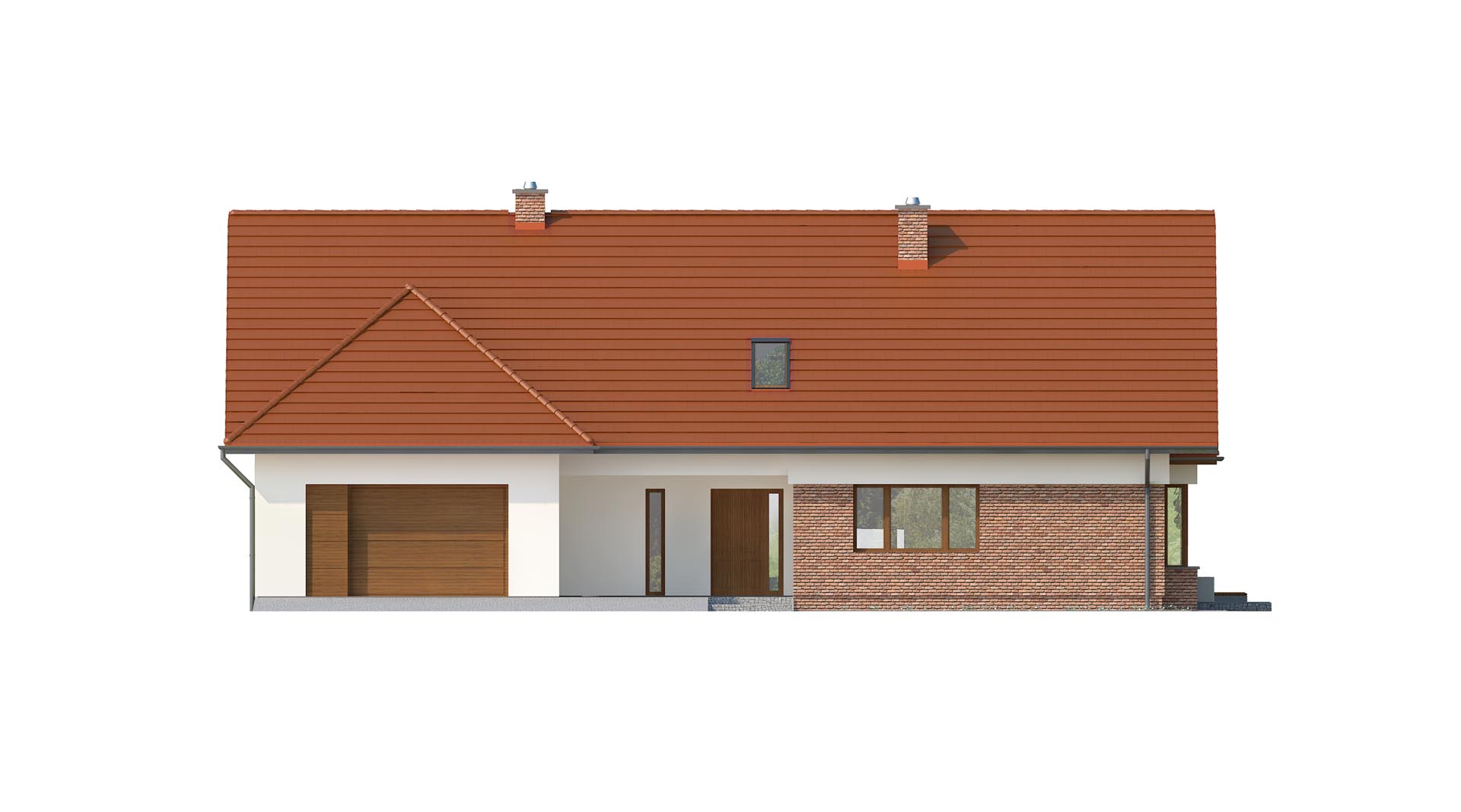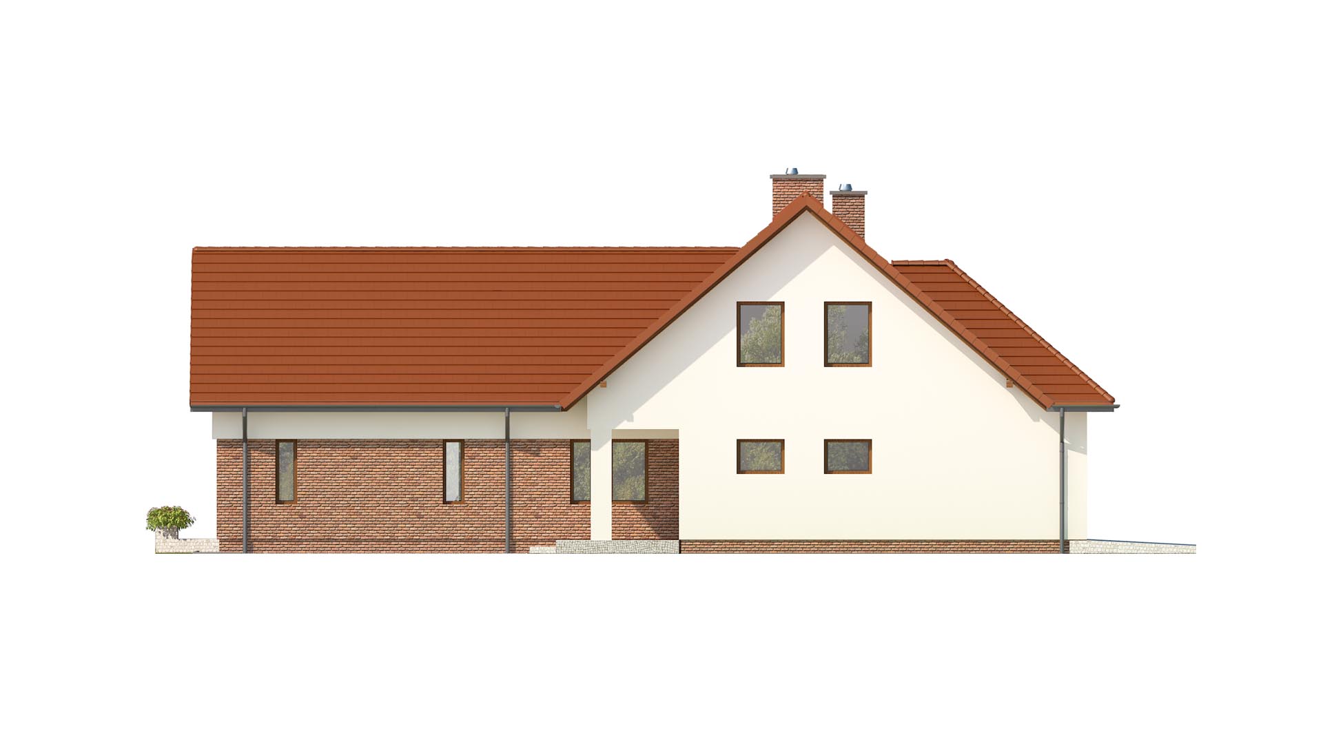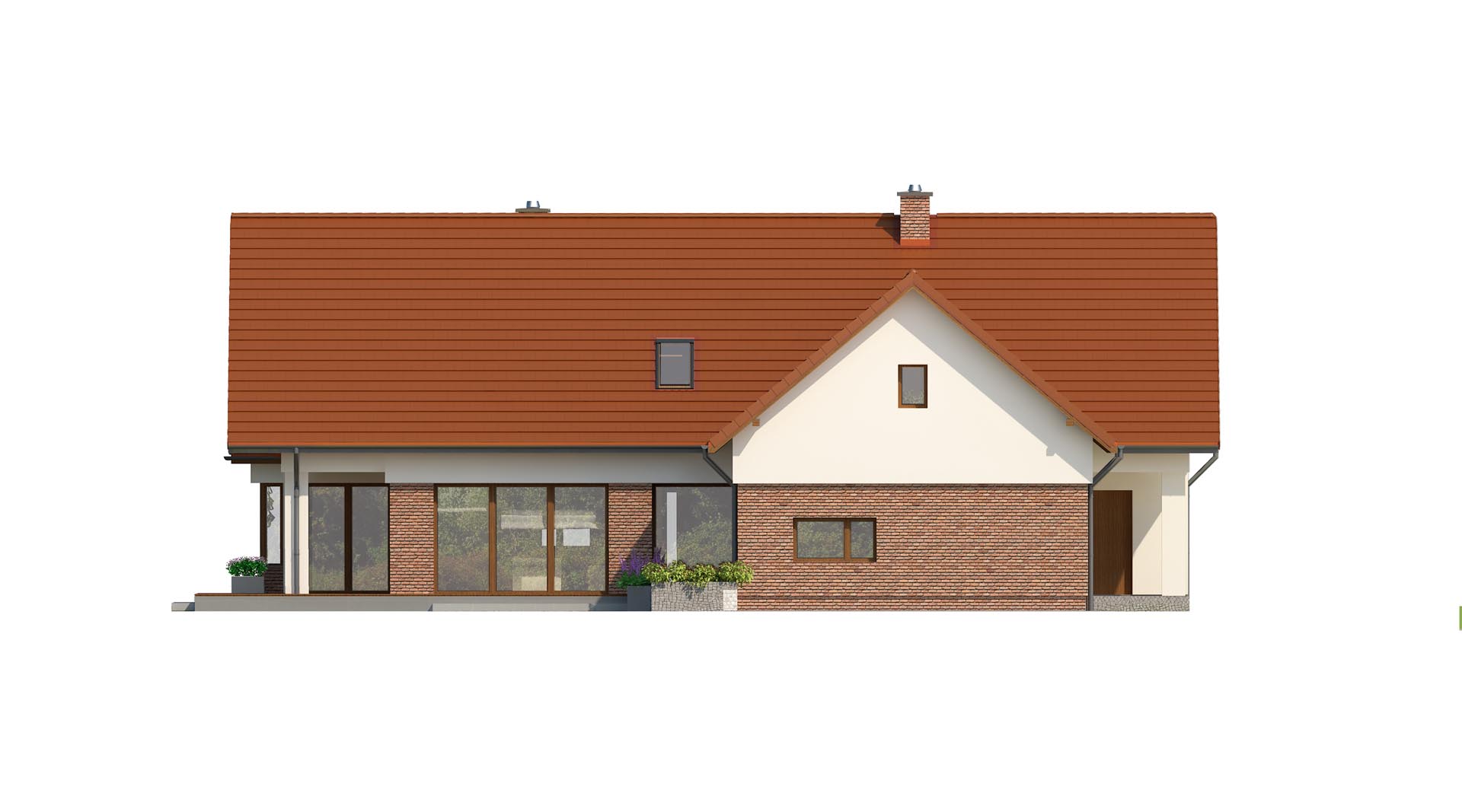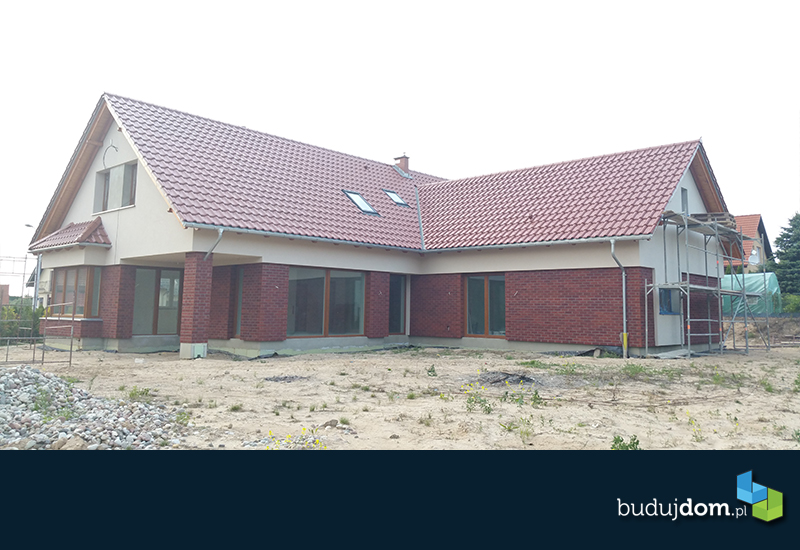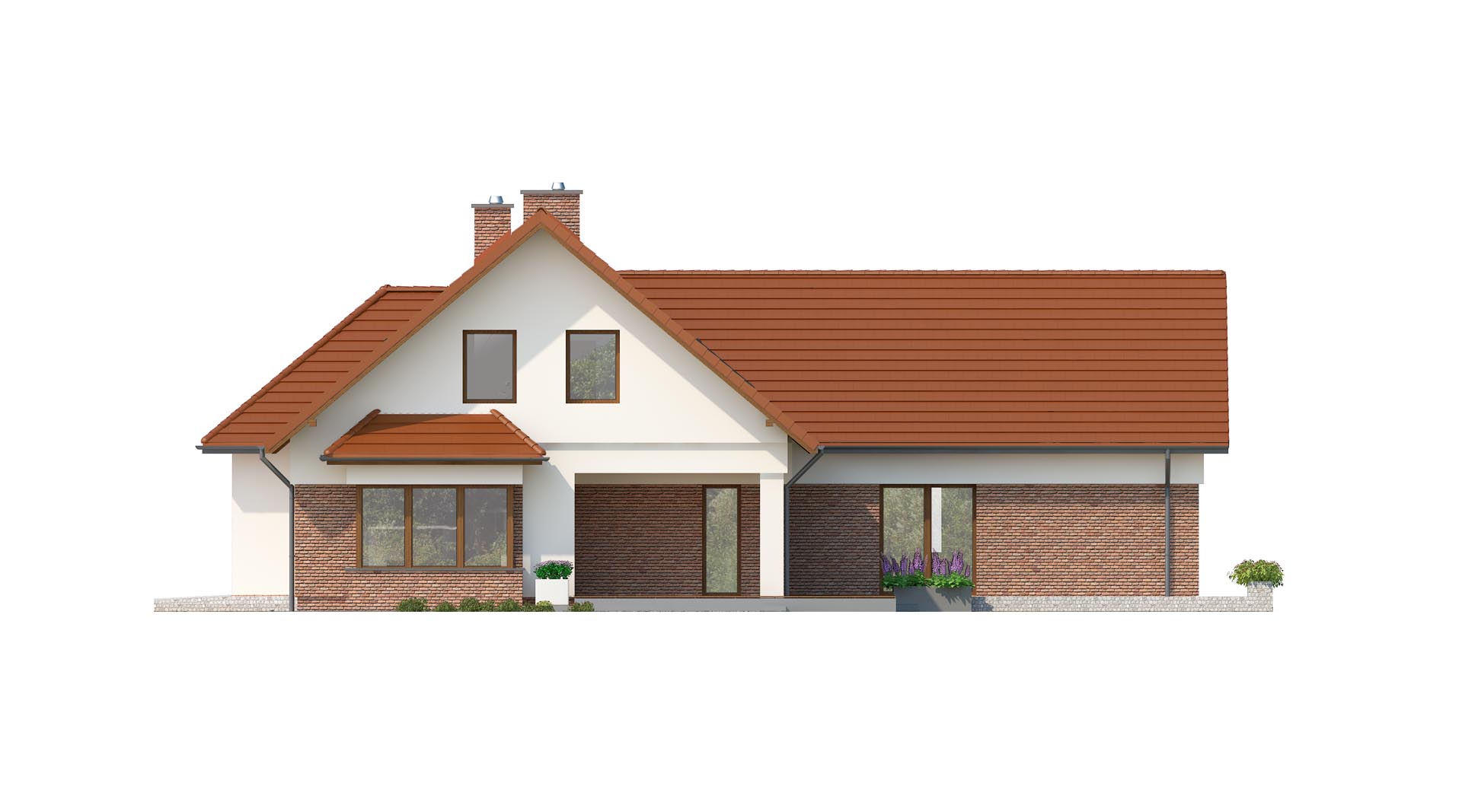 Wygodny dom jednorodzinny. Ze względu na umieszczenie dwóch sypialni na parterze dom może być wykańczany w dwóch etapach, najpierw parter, później poddasze. W rozległej strefie dziennej znalazł się wygodny salon z kominkiem, jadalnia łącząca kuchnię z salonem z możliwością wyjścia na zadaszony taras. Niewątpliwą zaletą wizualną jak i funkcjonalną jadalni jest przeszklony wykusz, w którym można urządzić wygodne siedzisko.