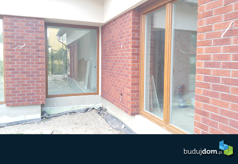 Na osi wejściowej do domu umieszczono duże okno, które już od progu pozwala nam ujrzeć zieleń ogrodu. Dodatkowo oś ta podkreślona została tym samym materiałem posadzki przed drzwiami wejściowymi, w domu oraz jako przedłużenie w formie tarasu. Zabieg ten pozwala połączyć wizualnie wnętrze domu z ogrodem.