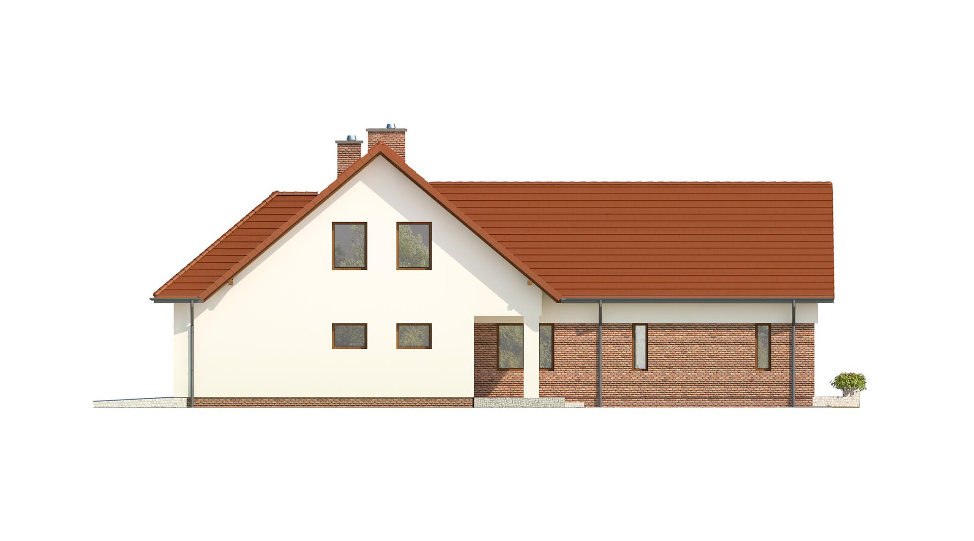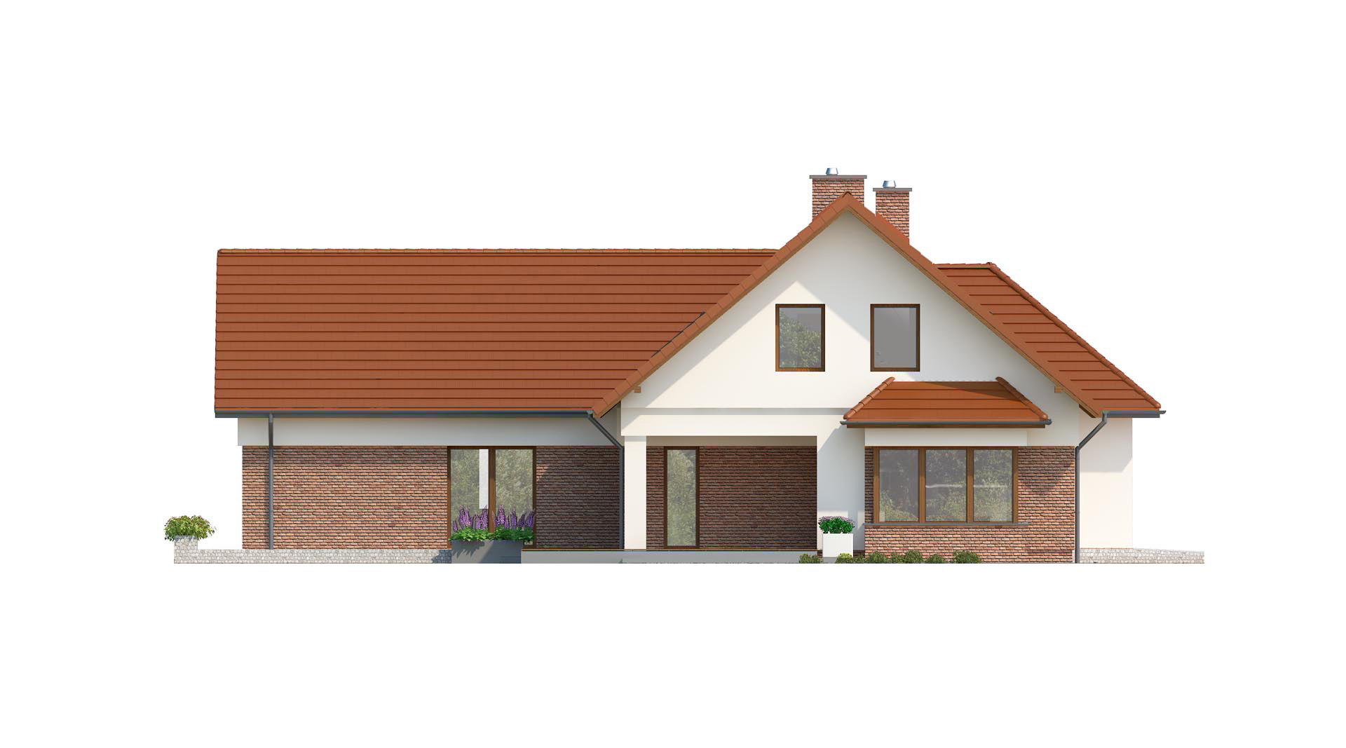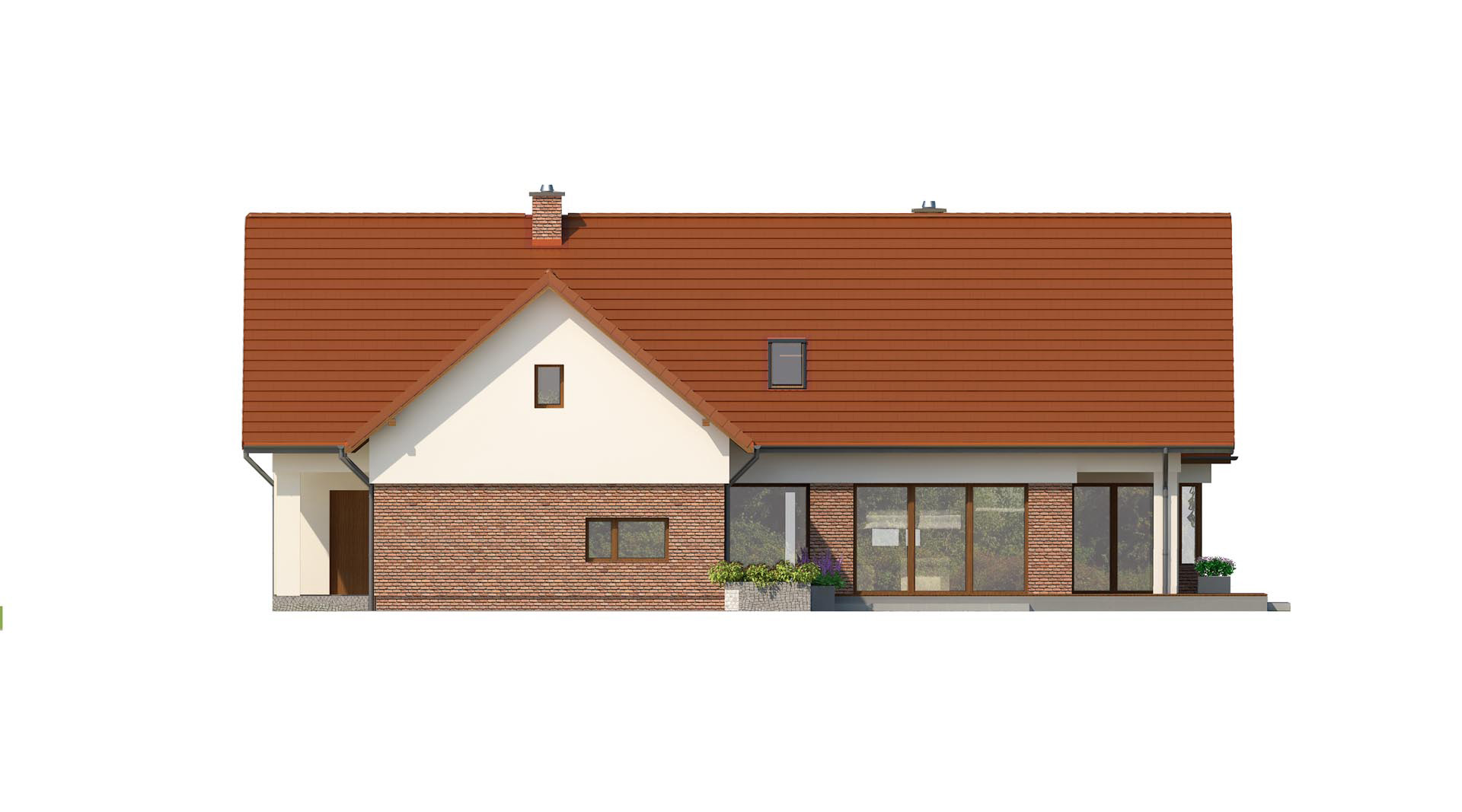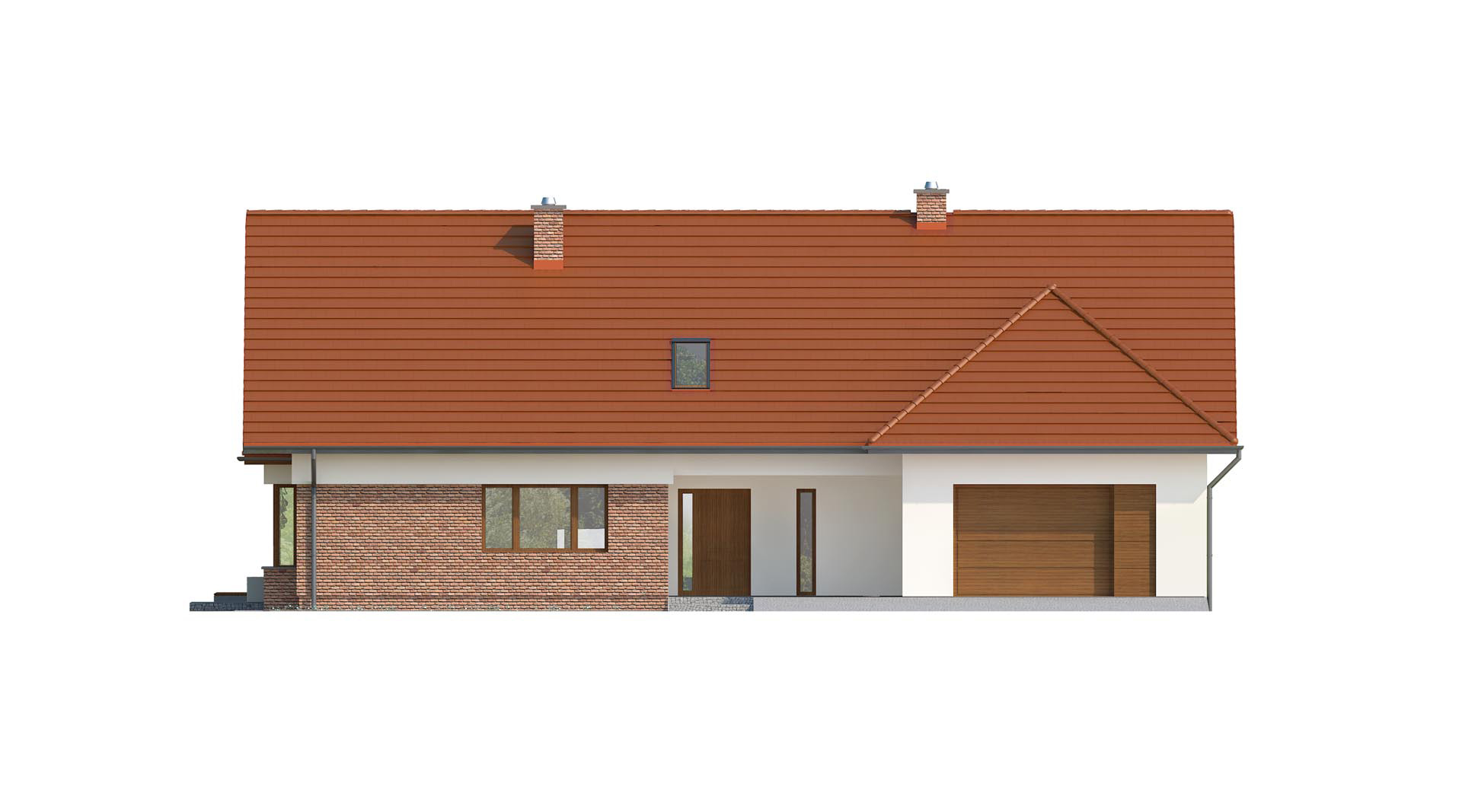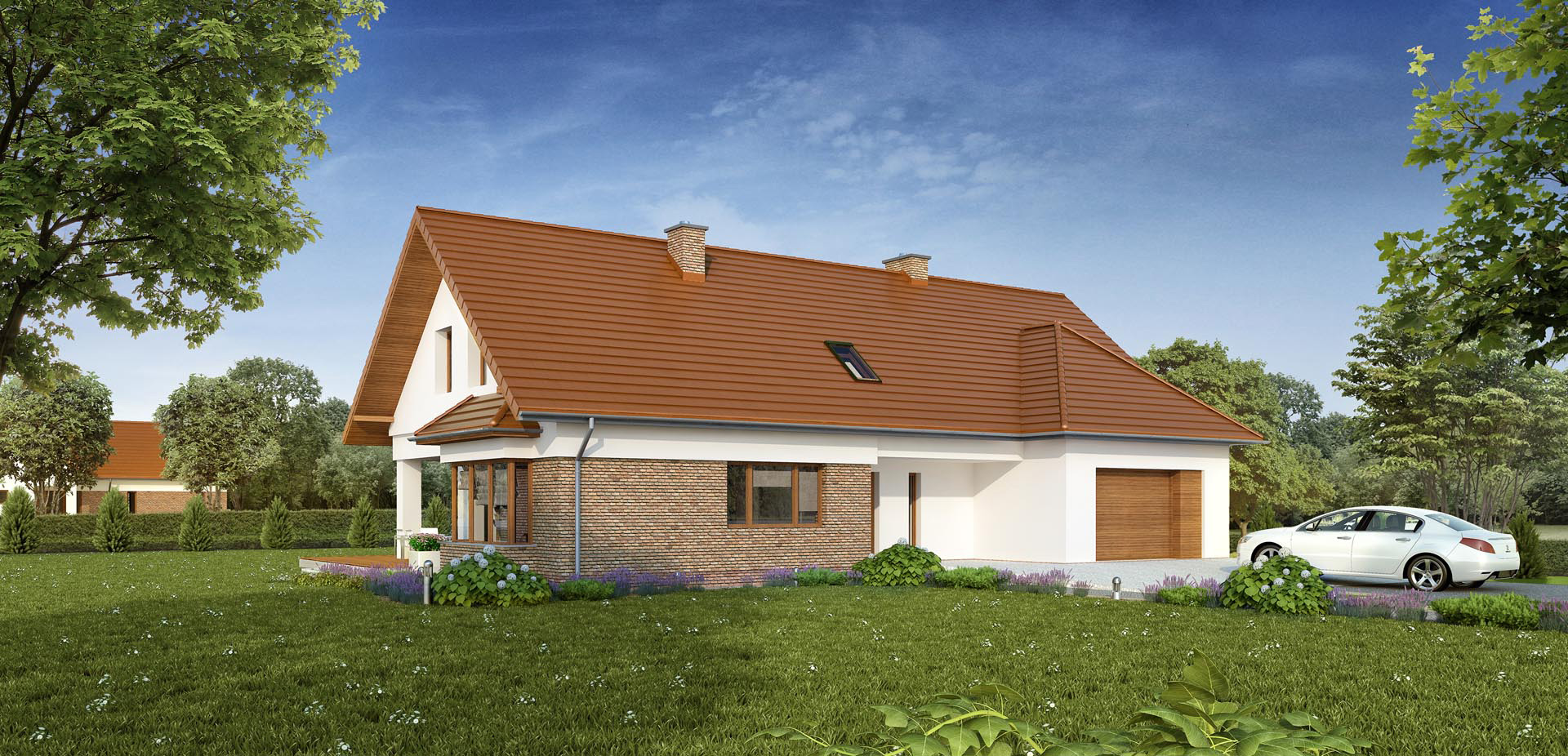 Wygodny dom jednorodzinny. Ze względu na umieszczenie dwóch sypialni na parterze dom może być wykańczany w dwóch etapach, najpierw parter, później poddasze. W rozległej strefie dziennej znalazł się wygodny salon z kominkiem, jadalnia łącząca kuchnię z salonem z możliwością wyjścia na zadaszony taras. Niewątpliwą zaletą wizualną jak i funkcjonalną jadalni jest przeszklony wykusz, w którym można urządzić wygodne siedzisko.