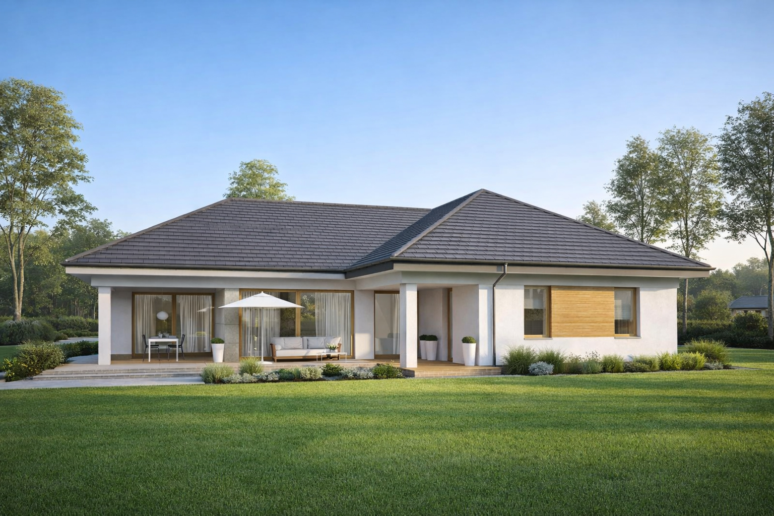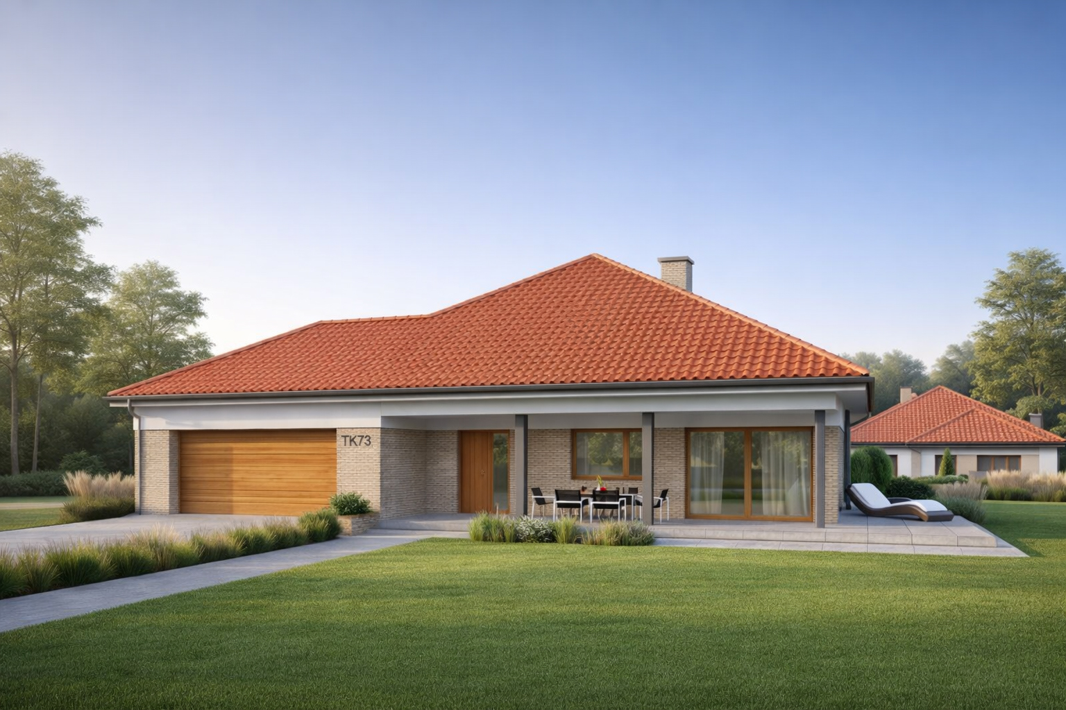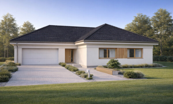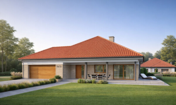 TK178 to rozłożysty, wygodny dom parterowy o powierzchni 152,5m2. Znajdziemy tu aż cztery sypialnie, wygodna garderobę i dwie łazienki. Otwarta strefa dzienna z przestronnym salonem i jadalnią gwarantują poczucie swobody przestrzennej. Duże drzwi tarasowe salonu i jadalni otwierają dom na ogród, a zadaszony taras pomieści nawet ośmioosobowy stół. W części technicznej jest zintegrowany z kotłownią węzeł sanitarny. Przestronny garaż na dwa samochody pomieści dodatkowo rowery lub sprzęt ogrodniczy.