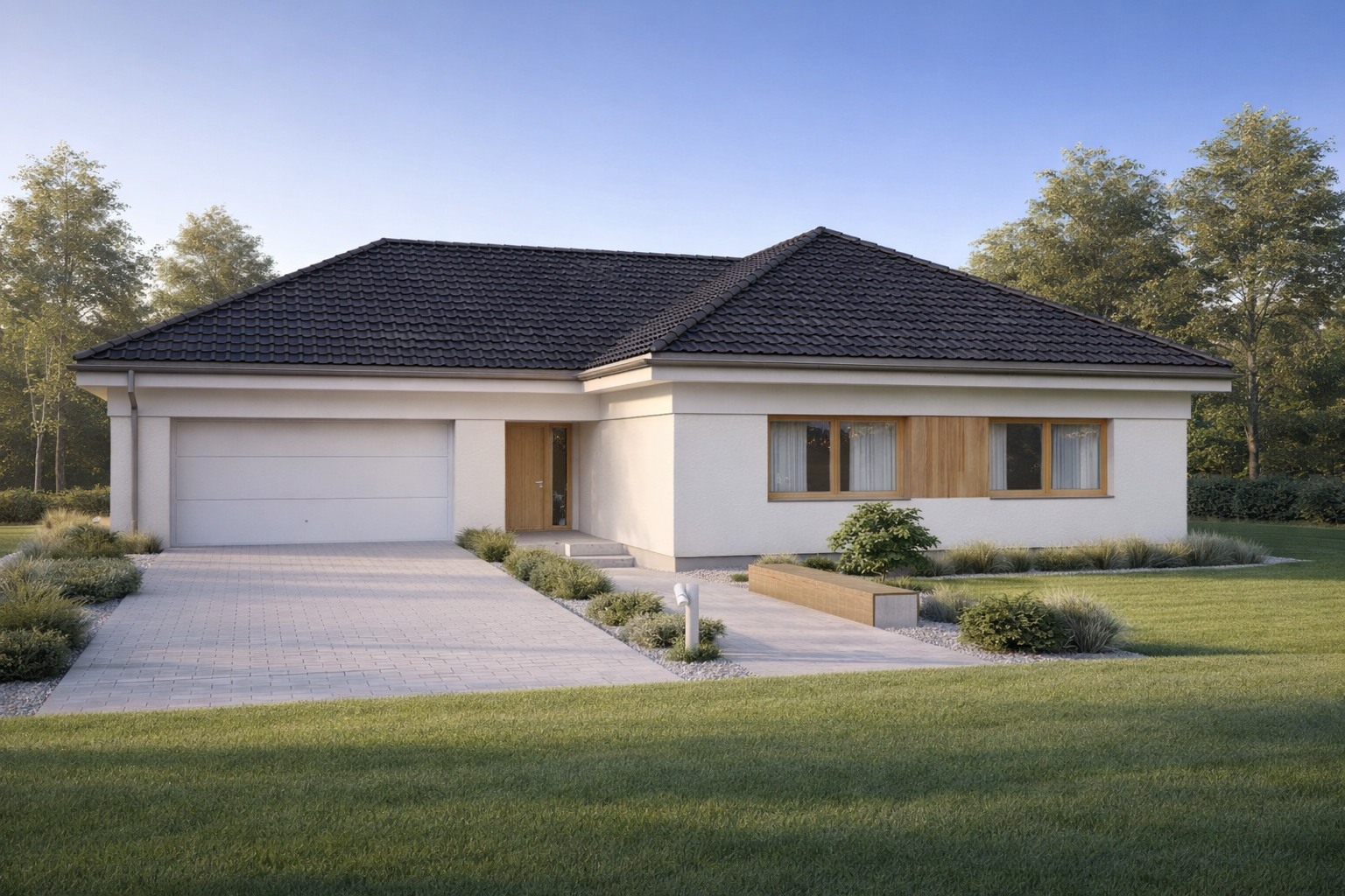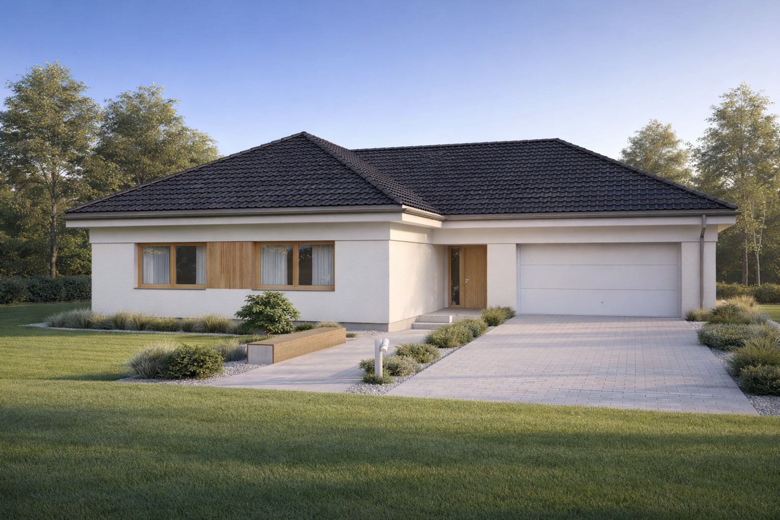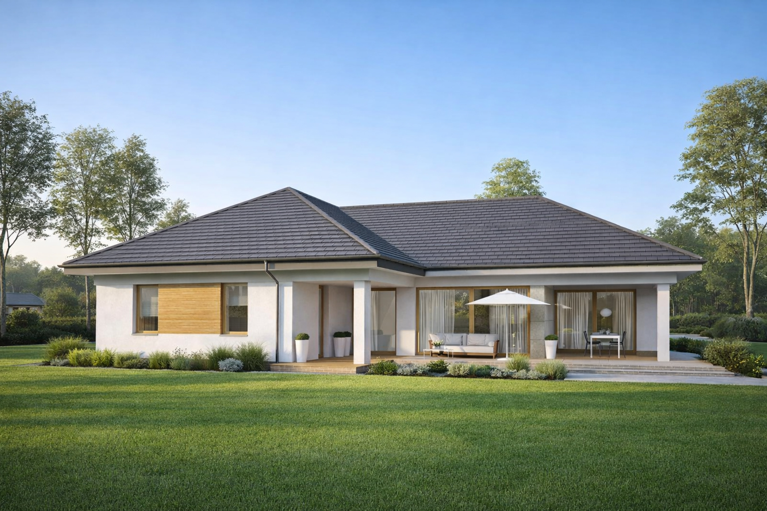 TK178 to rozłożysty, wygodny dom parterowy o powierzchni 152,5m2. Znajdziemy tu aż cztery sypialnie, wygodna garderobę i dwie łazienki. Otwarta strefa dzienna z przestronnym salonem i jadalnią gwarantują poczucie swobody przestrzennej. Duże drzwi tarasowe salonu i jadalni otwierają dom na ogród, a zadaszony taras pomieści nawet ośmioosobowy stół. W części technicznej jest zintegrowany z kotłownią węzeł sanitarny. Przestronny garaż na dwa samochody pomieści dodatkowo rowery lub sprzęt ogrodniczy.