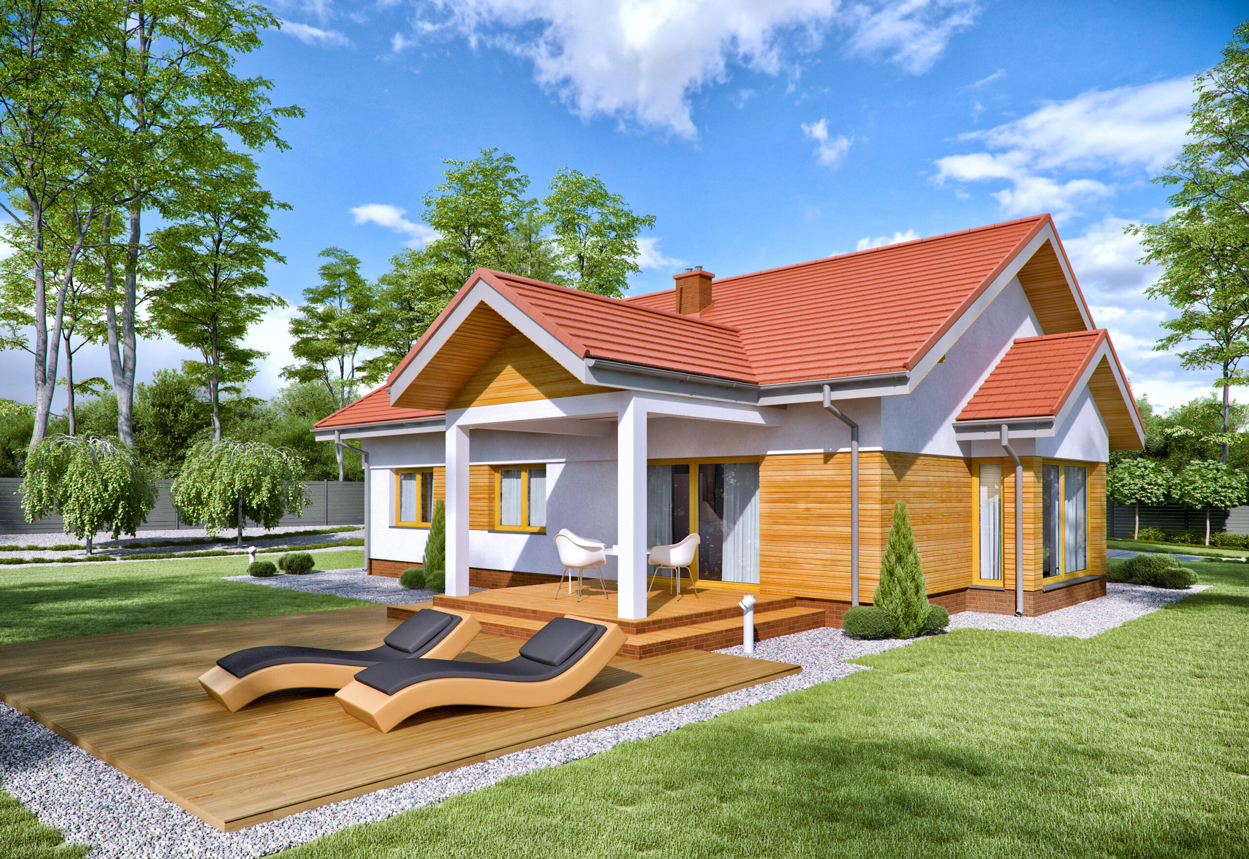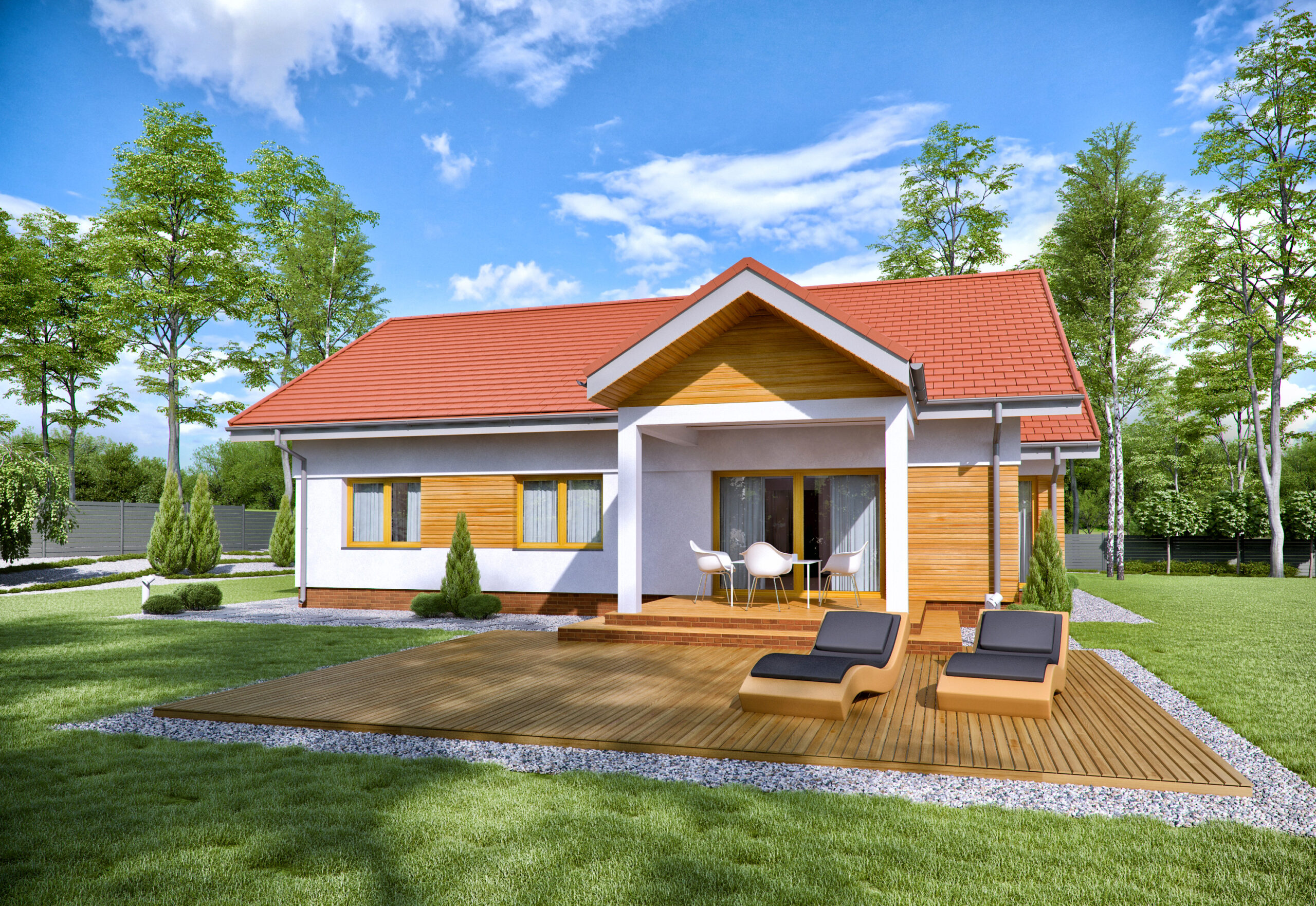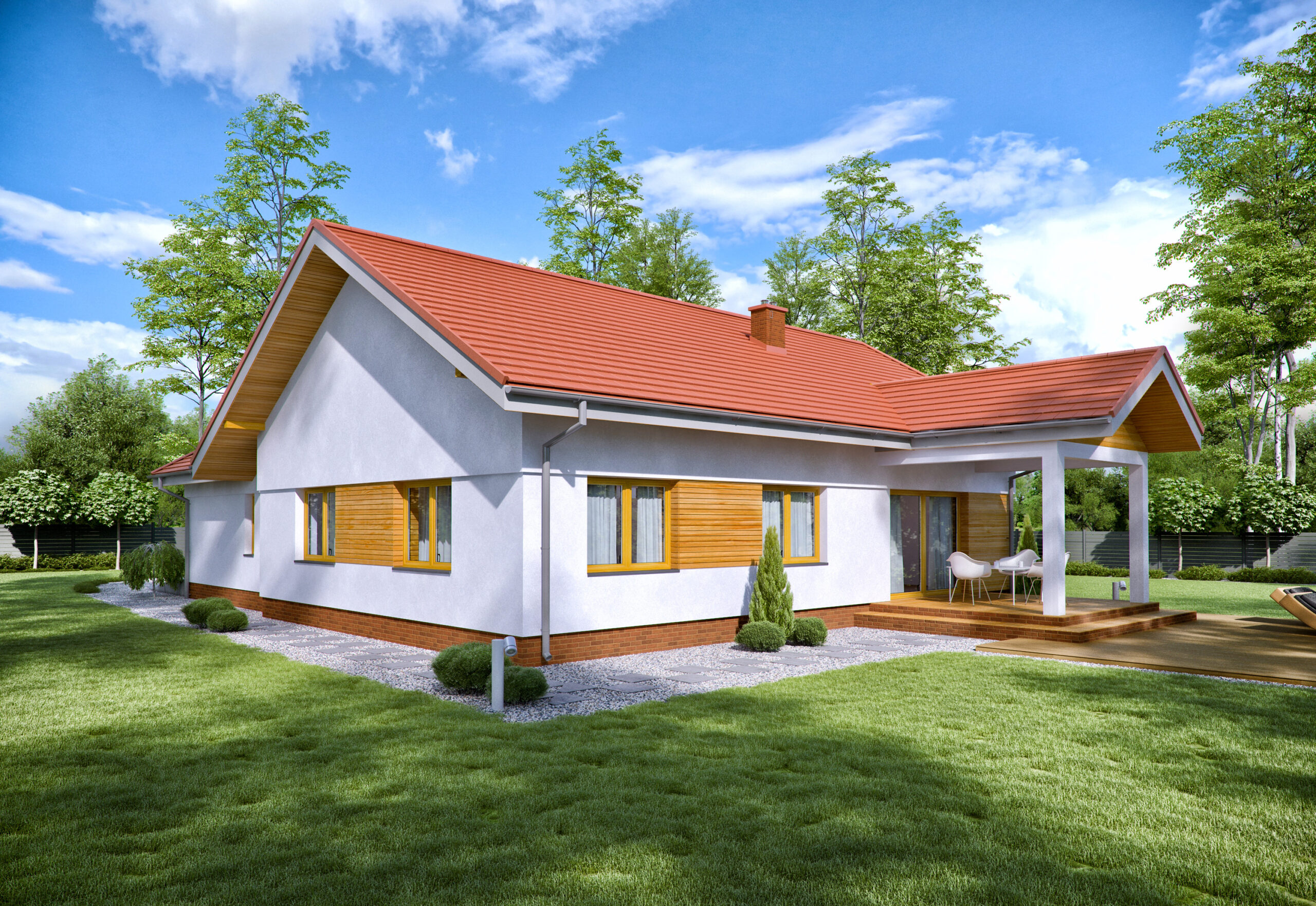 TK201GL to atrakcyjny dom parterowy dla czteroosobowej rodziny. Na 103m2 powierzchni mieszczą się pokoje dla dzieci, wygodna sypialnia dla rodziców oraz ponad dwudziestometrowy wygodny salon z kominkiem. Kuchnia z jadalnią tworzą otwartą część wspólną. Istnieje możliwość wydzielenia kuchni poprzez wybudowanie ścianki działowej. Na zadaszonym tarasie zmieści się stół dla sześciu osób i miejsce na leżaki. Przestronna kotłownia daje możliwość wyboru dowolnego źródła ogrzewania, może także służyć za dodatkowy schowek. W garażu zmieści się duży samochód osobowy i zostanie miejsce na motocykl lub rowery. Dom jest prosty w budowie, a jego konstrukcja pozwala na dowolne przestawanie ścian działowych. Takie rozwiązanie oraz forma budynku znacząco wpływa na energooszczędność oraz niskie koszty budowy i utrzymania.