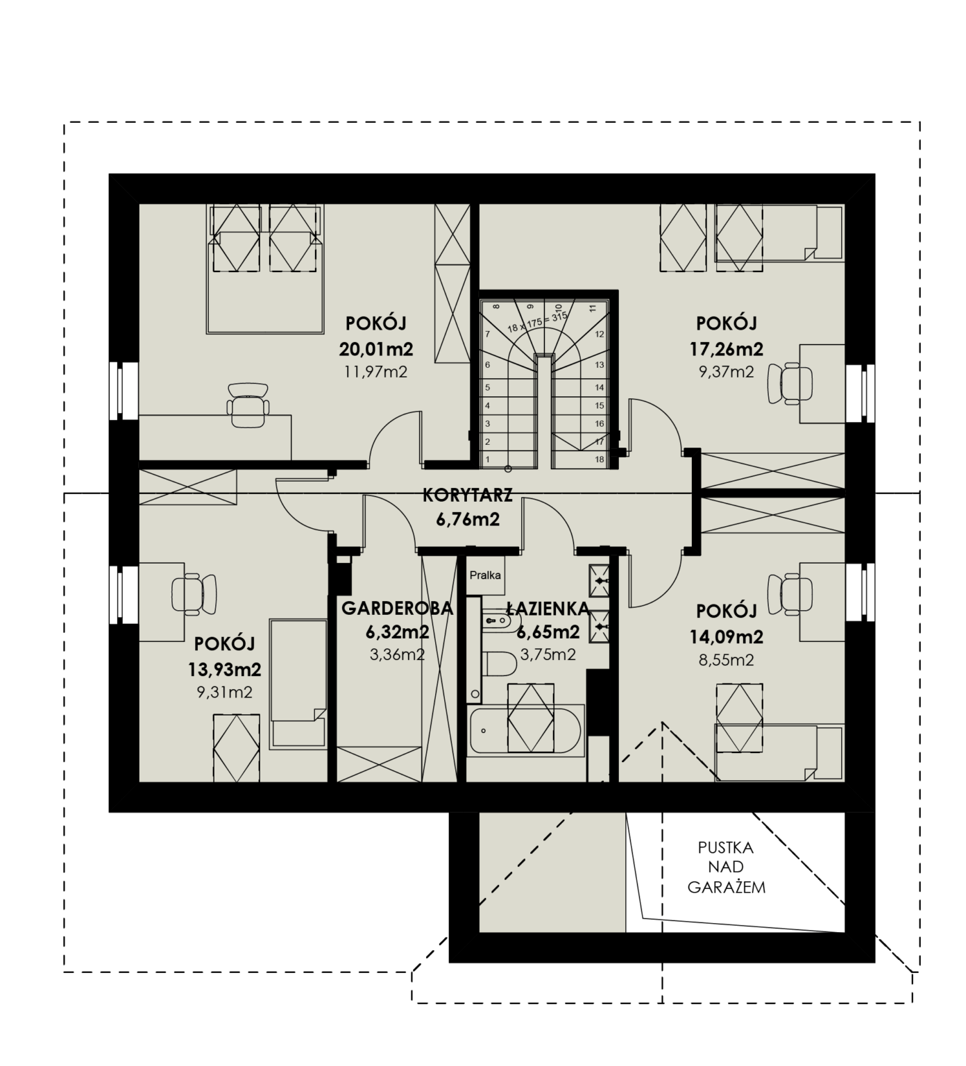Dom TK26L dzięki bardzo funkcjonalnie rozplanowanemu wnętrzu charakteryzuje się dużą ilością pokoi przy stosunkowo małej powierzchni użytkowej. Dzięki temu doskonale sprawdzi się jako dom wielopokoleniowy, gdzie na parterze w pokoju z łazienką będą mogli zamieszkać np. seniorzy. W powiększonej kotłowni zmieści się każdy kocioł, niezależnie od zastosowanej technologii ogrzewania. Na poddaszu zaprojektowano aż 4 pokoje, łazienkę i garderobę.