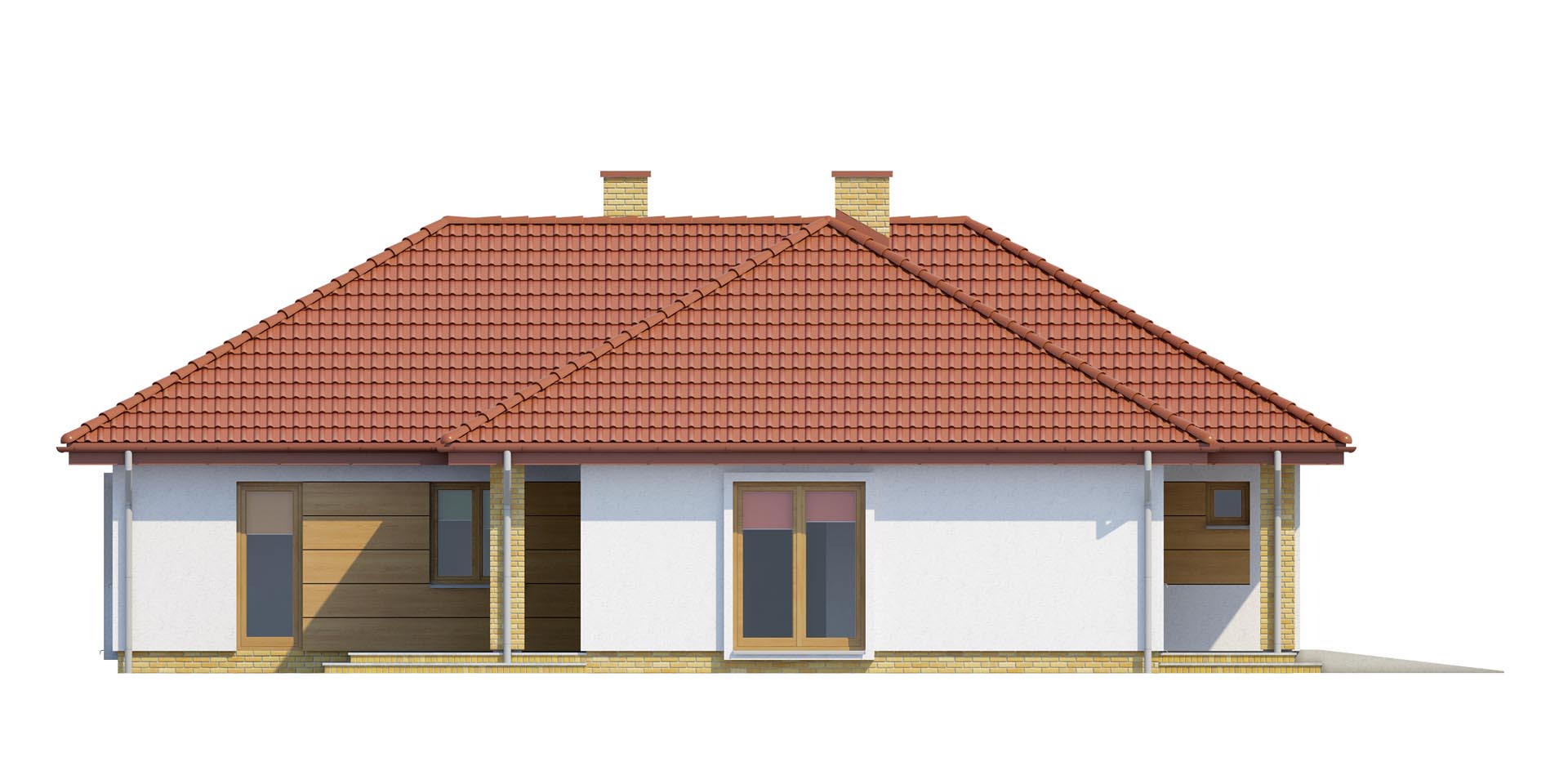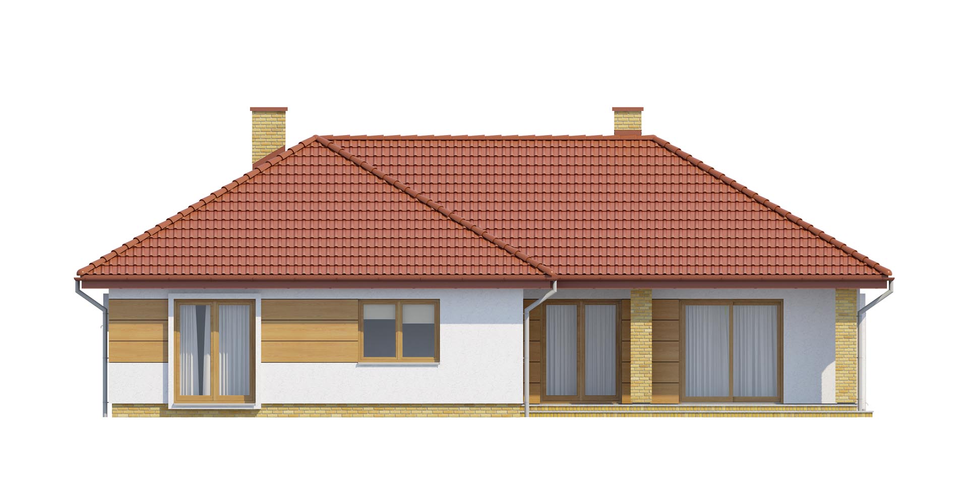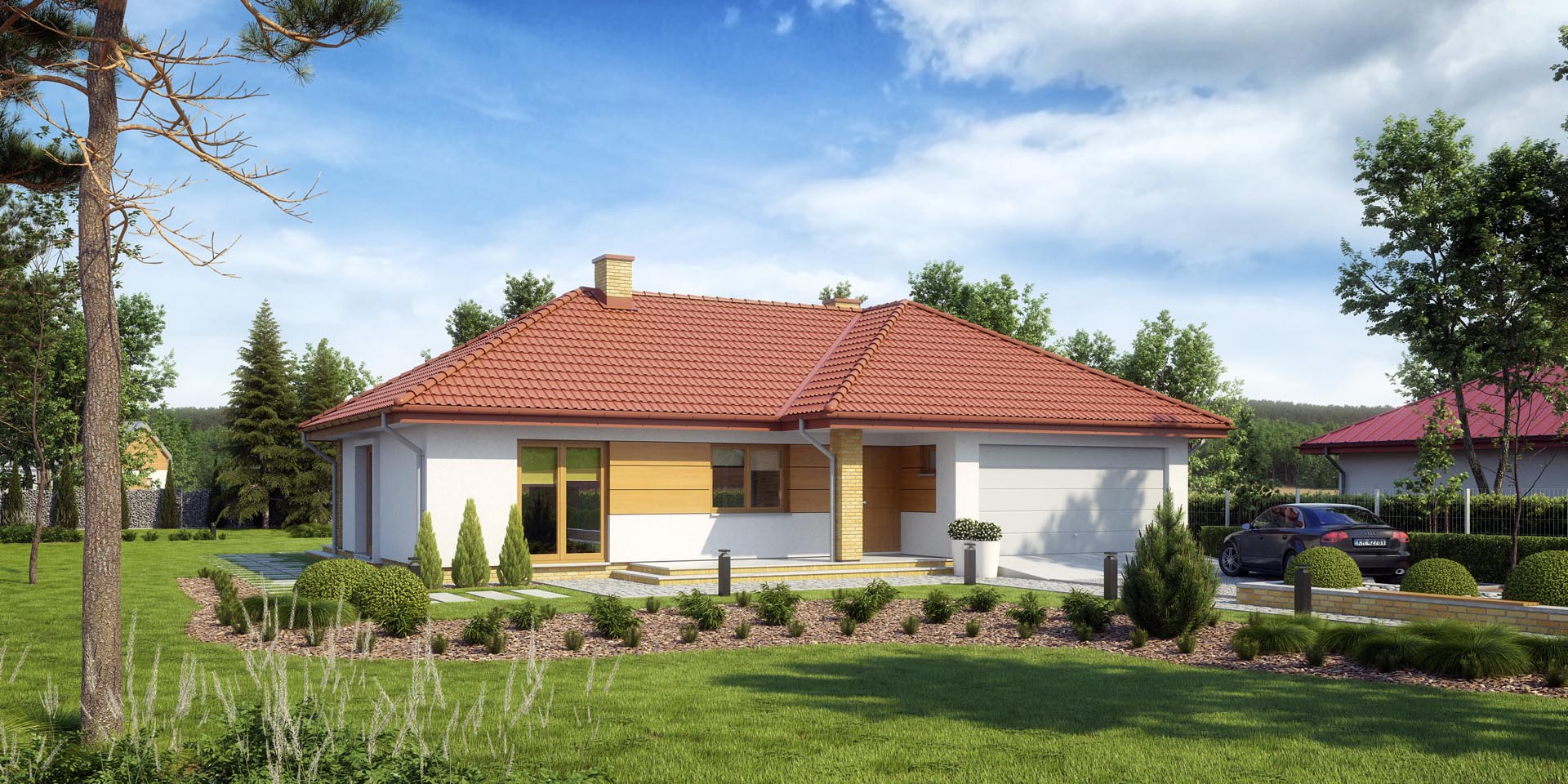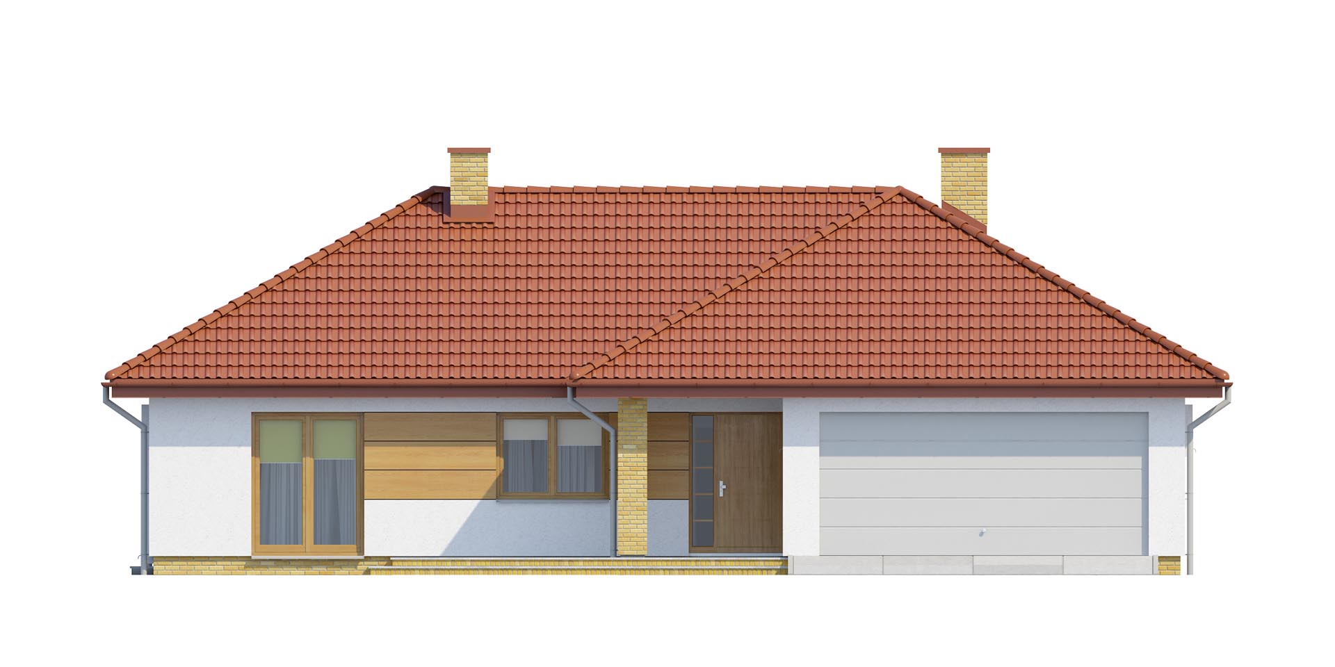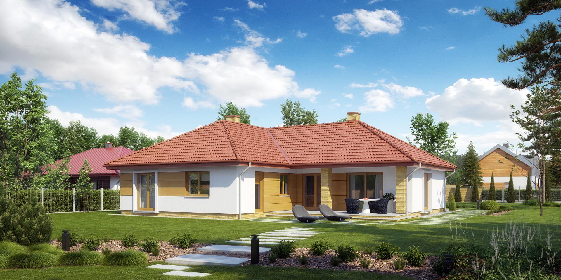 Rozłożysty dom parterowy o nowoczesnym wyglądzie doskonale sprawdzi się dla rodziny 4-osobowej. Dom posiada trzy sypialnie oraz duży pokój połączony z jadalnią. Kuchnia jest częściowo otwarta na jadalnię z możliwością zamknięcia. Niewątpliwą zaletą domu jest duży zadaszony taras od strony ogrodu.