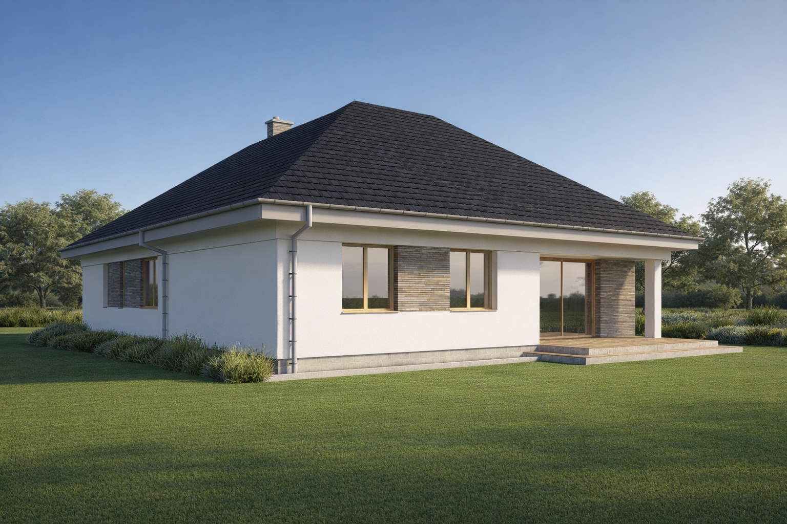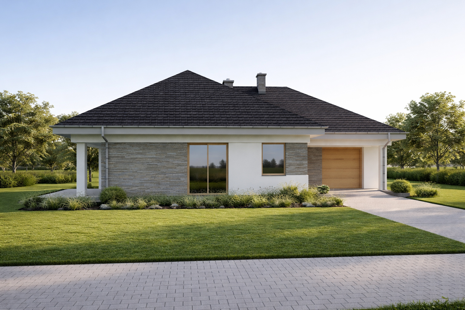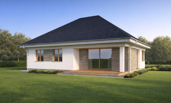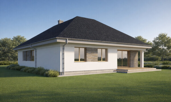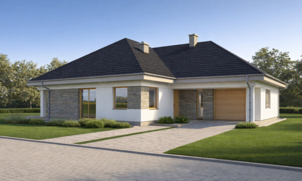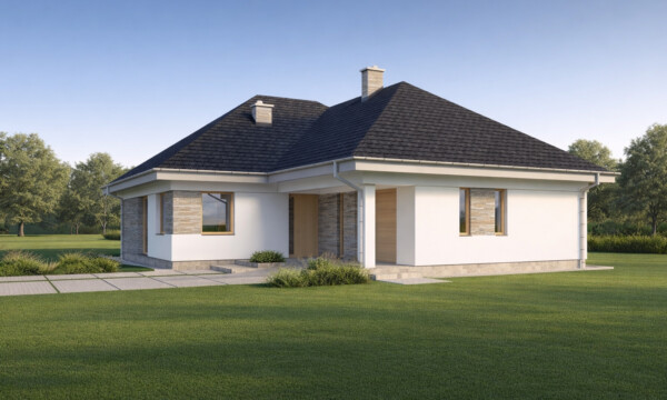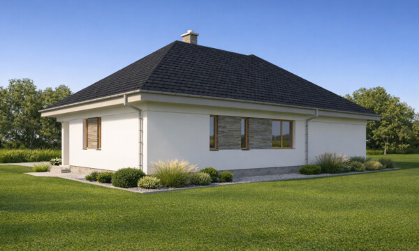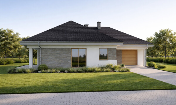 Kompaktowy i wygodny dom parterowy dla czteroosobowej rodziny. Spodoba się osobom ceniącym oprócz walorów wizualnych również funkcjonalność pomieszczeń. Dom mieści trzy wygodne sypialnie, w tym największa jest z własną łazienką i wygodną garderobą. Pojemny jednostanowiskowy garaż jest połączony z obszerną kotłownią, która może także posłużyć za spiżarnię. W części sypialnej domu wydzielono małe pomieszczenie gospodarcze które może pełnić rolę pralni lub schowka. TK333_35L to wariant popularnego projektu TK333L ze zmienionym nachyleniem połaci dachowych na kąt 35 stopni