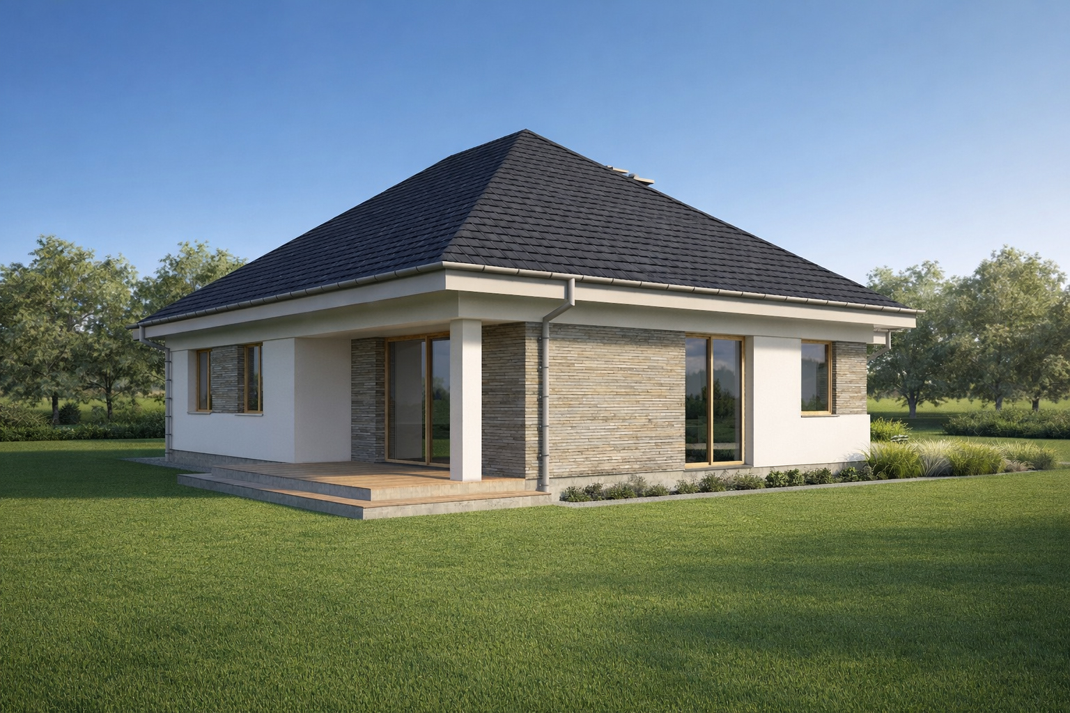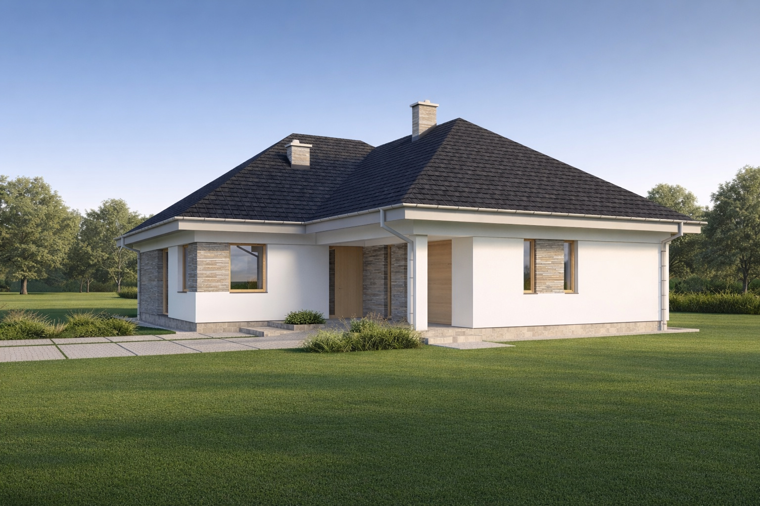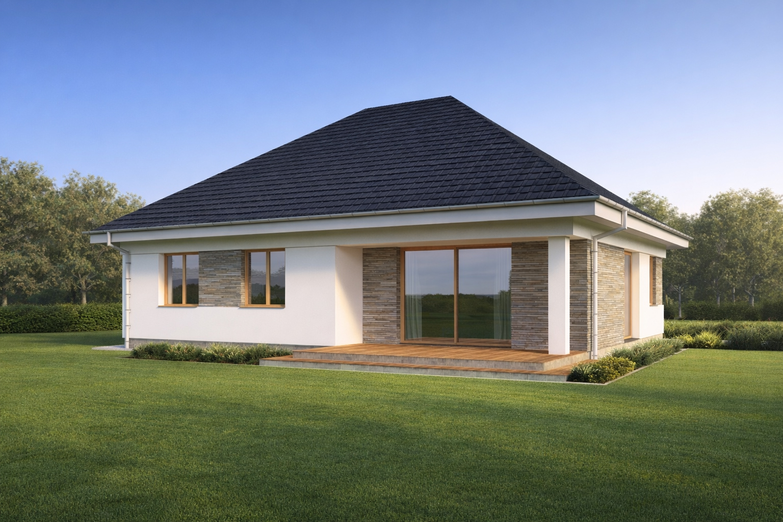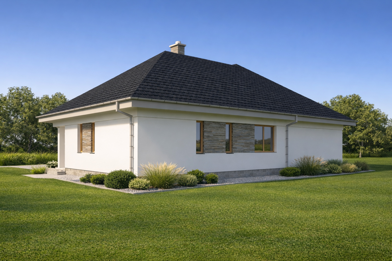 Kompaktowy i wygodny dom parterowy dla czteroosobowej rodziny. Spodoba się osobom ceniącym oprócz walorów wizualnych również funkcjonalność pomieszczeń. Dom mieści trzy wygodne sypialnie, w tym największa jest z własną łazienką i wygodną garderobą. Pojemny jednostanowiskowy garaż jest połączony z obszerną kotłownią, która może także posłużyć za spiżarnię. W części sypialnej domu wydzielono małe pomieszczenie gospodarcze które może pełnić rolę pralni lub schowka. TK333_35L to wariant popularnego projektu TK333L ze zmienionym nachyleniem połaci dachowych na kąt 35 stopni