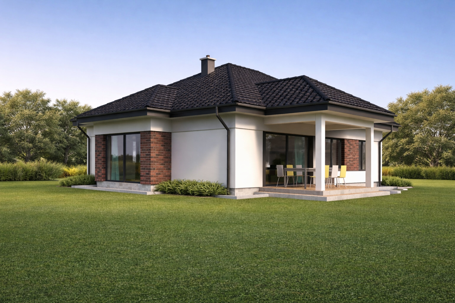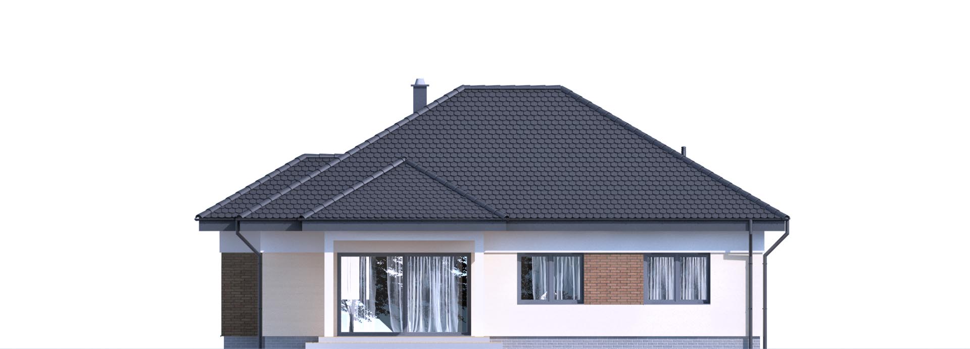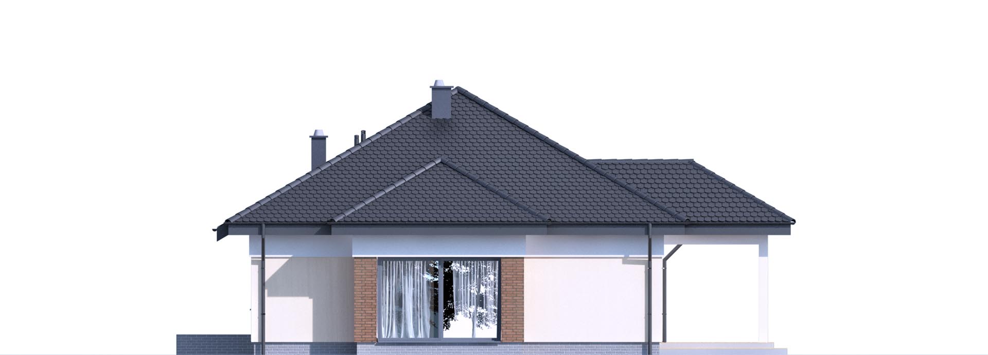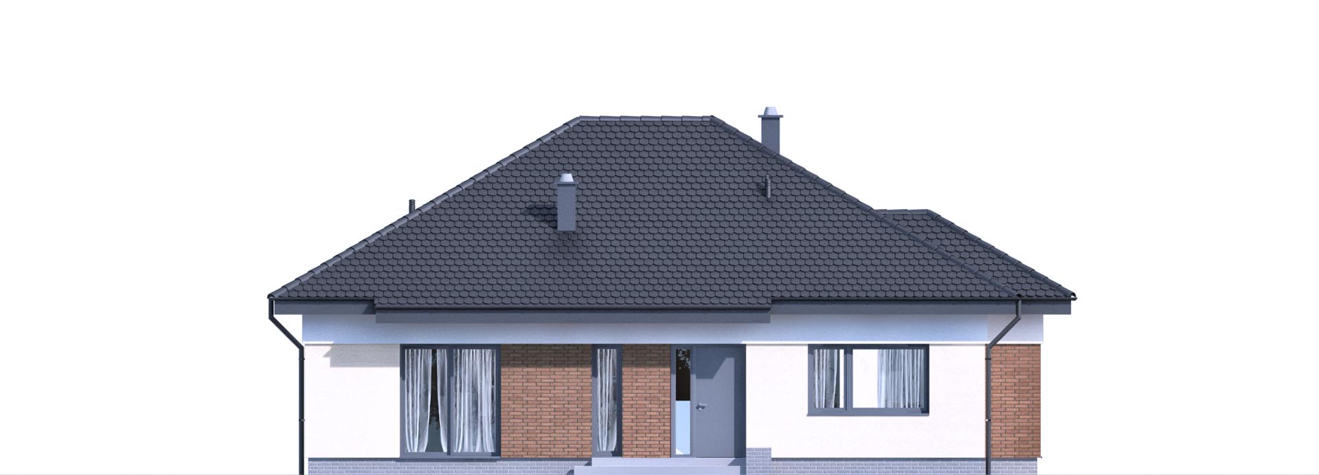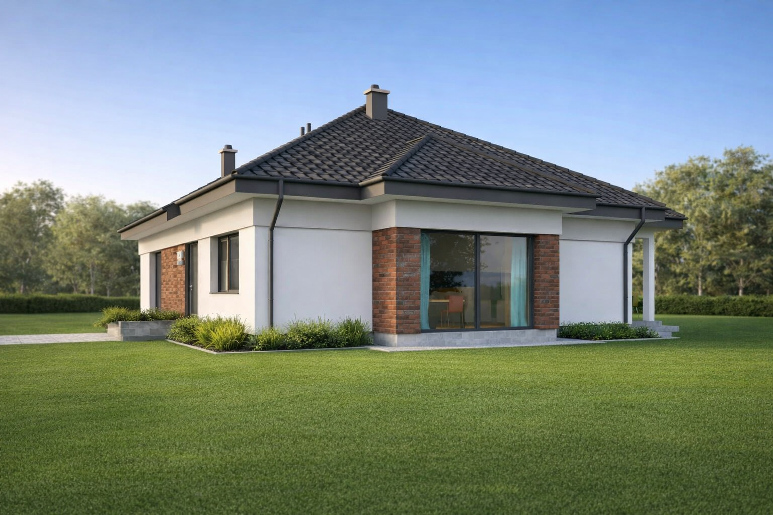 Prosty, mały dom parterowy, ekonomiczny w budowie i późniejszej eksploatacji. Trzy wygodne sypialnie doskonale sprawdzą się dla rodziny czteroosobowej. Przestrzenna część dzienna to wygodny salon z dużą jadalnią i kuchnia. W zależności od wymagań kuchnię można zamknąć ścianką działową lub zostawić otwartą. Część pomocnicza to obszerna sień z dużą szafą na ubrania, wygodna kotłownia i garderoba, która może służyć jako schowek. Konstrukcja budynku dzięki prefabrykowanym wiązarom dachowym pozwala dowolnie aranżować układ ścian wewnętrznych oraz obniża koszty wykonania stropu.