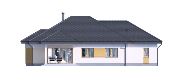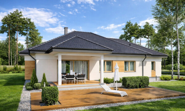 TK34g to nieduży, funkcjonalnie zaprojektowany dom parterowy. Znajdziemy tu trzy spore pokoje i duży salon otwarty na jadalnię z kominkiem i otwartą kuchnię. Konstrukcja budynku została tak zaprojektowana, by kuchnię w zależności od potrzeb domowników można było otworzyć na salon, albo zamknąć wykonując ściankę działową. Dodatkowym atutem domu jest zadaszony taras na którym zmieścimy duży stół. Przestronny garaż pomieści nie tylko samochód ale także rowery czy sprzęt ogrodowy. W budynku nie zabraknie miejsca na przechowywanie rzeczy i pomieszczenia gospodarcze, a powierzchnia kotłowni daje możliwość wybrania różnych źródeł ogrzewania. Zachęcamy do obejrzenia podobnych projektów, TK34 bez garażu i TK34g2 z garażem dwustanowiskowym.