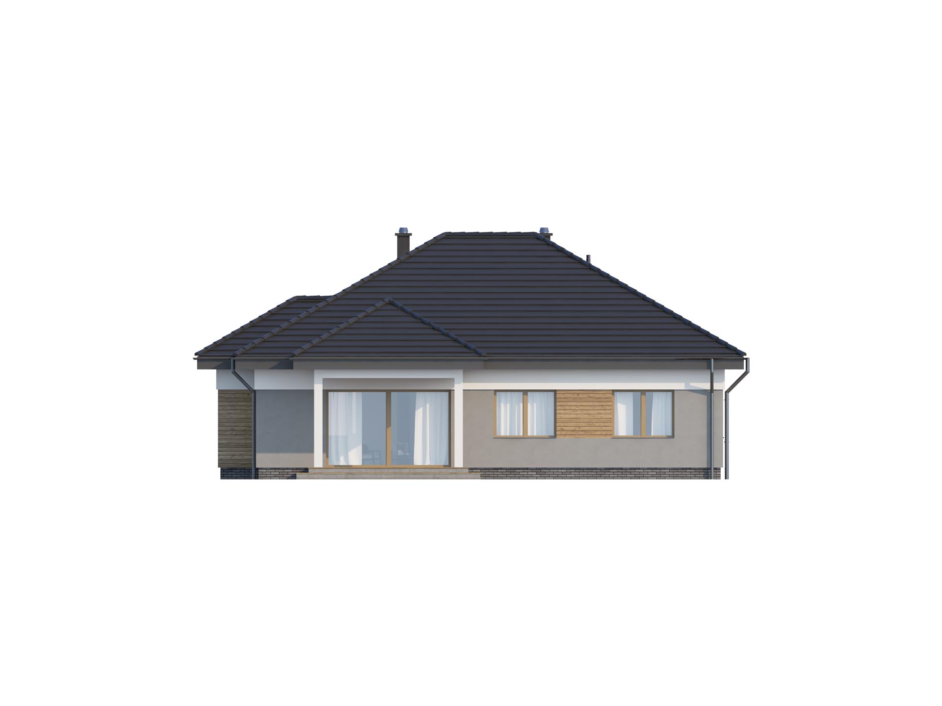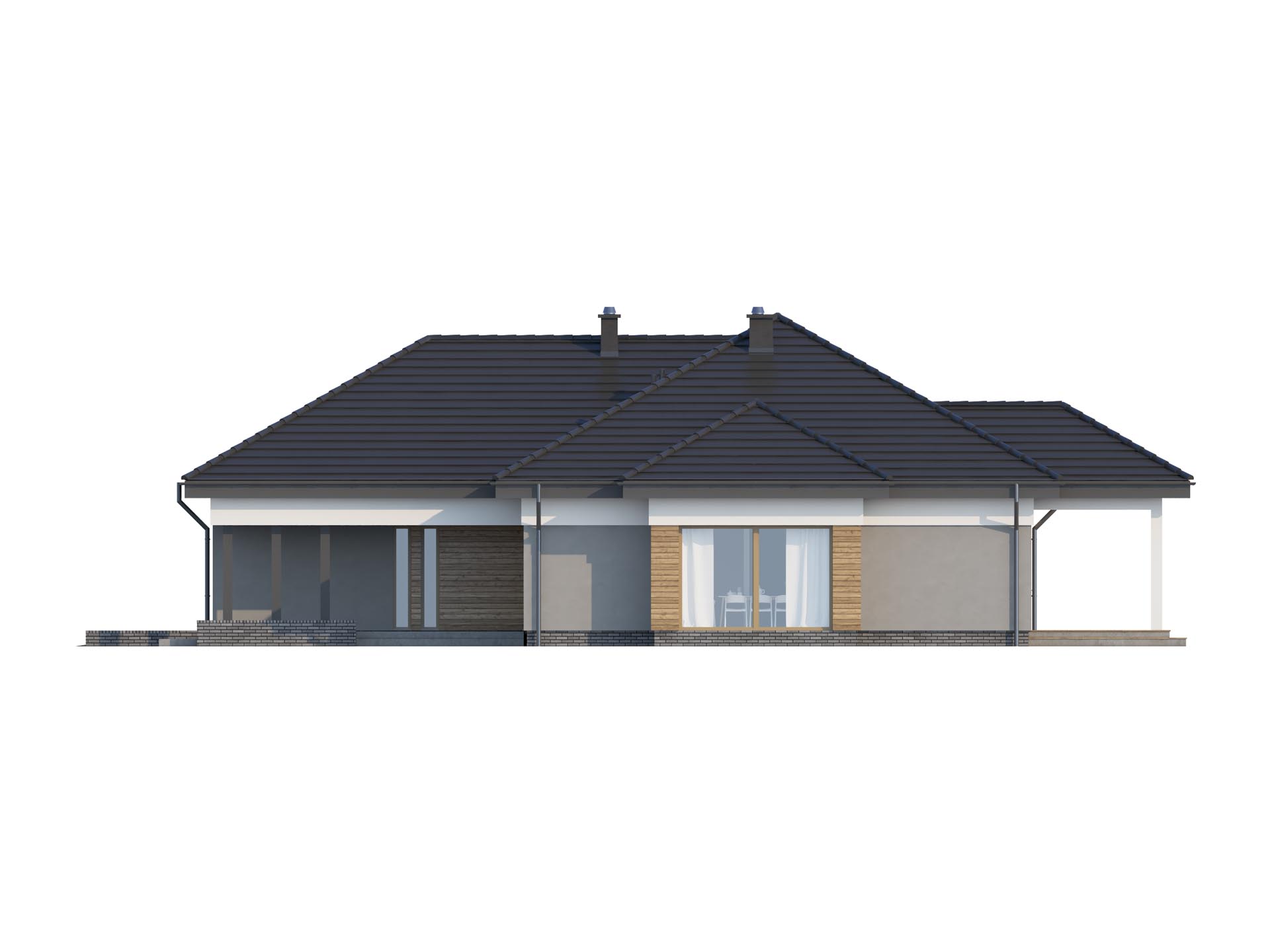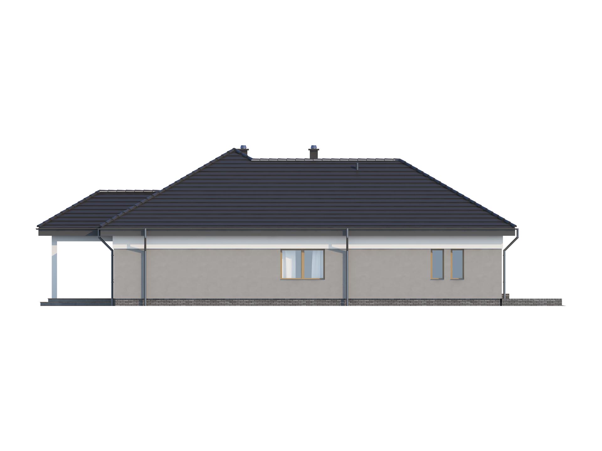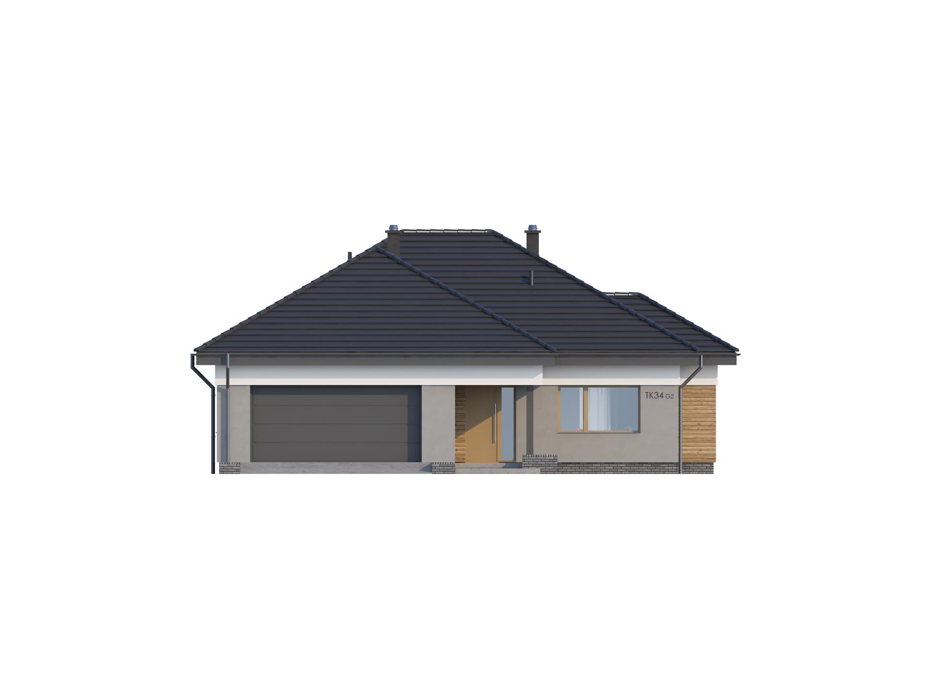 TK34g2 to nieduży, parterowy i funkcjonalnie zaprojektowany dom. Znajdziemy tu 3 pokoje i duży salon. Konstrukcja budynku została tak zaprojektowana, aby kuchnię w zależności od potrzeb domowników można było zamknąć wykonując ściankę działową albo zostawić otwartą na salon. Wydzielona jadalnia z dużym rozsuwanym oknem pozwala na dowolne ustawienie stołu. Dodatkowym atutem jest zadaszony taras, na którym ustawimy nawet ośmioosobowy stół. W budynku nie zabraknie miejsca na przechowywanie rzeczy, wydzielona garderoba zmieści zimowe ubrania i deskę do prasowania. Duża powierzchnia kotłowni daje możliwość wybrania pieca również na paliwo stałe. Zachęcamy do obejrzenia podobnych projektów TK34 i TK34A bez garażu oraz TK34G z garażem z boku.