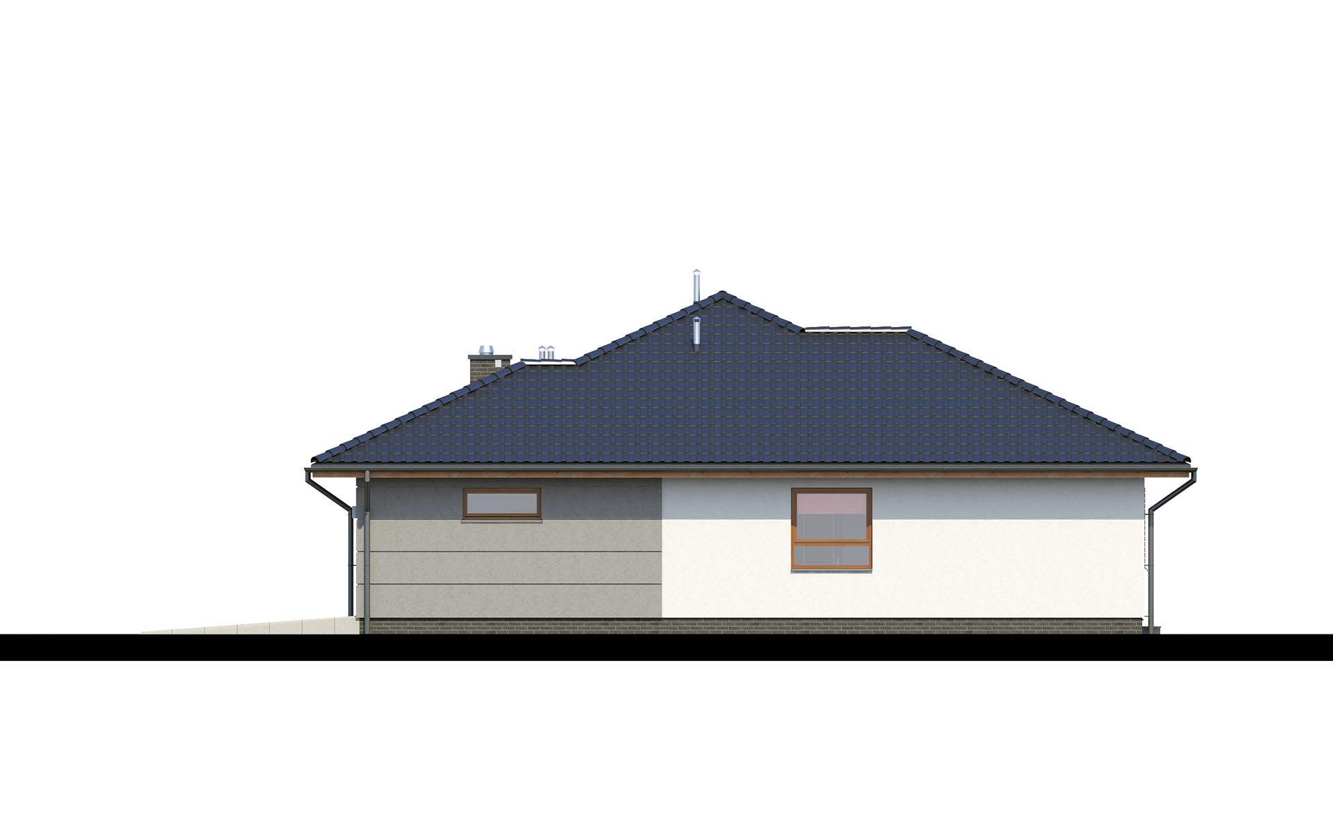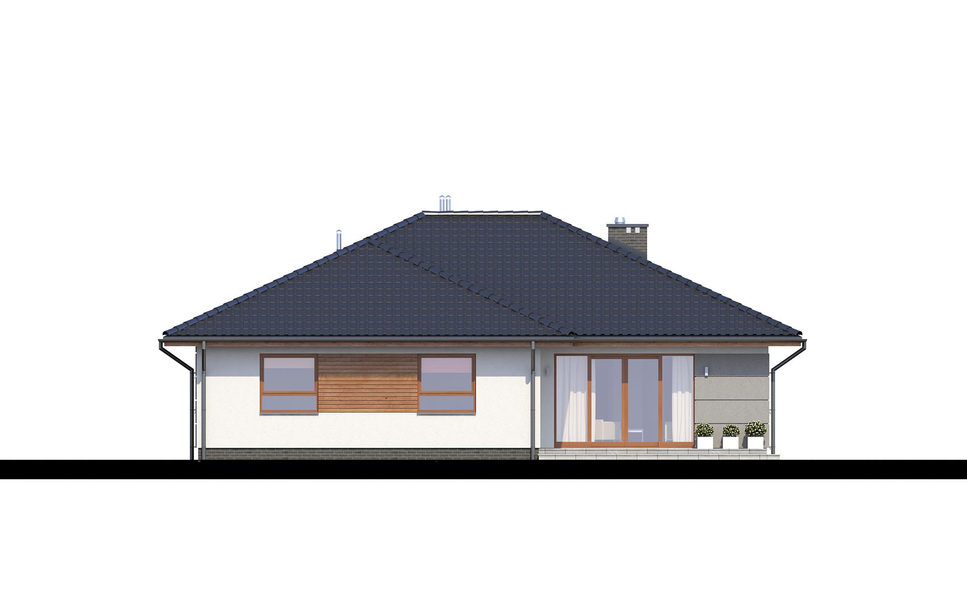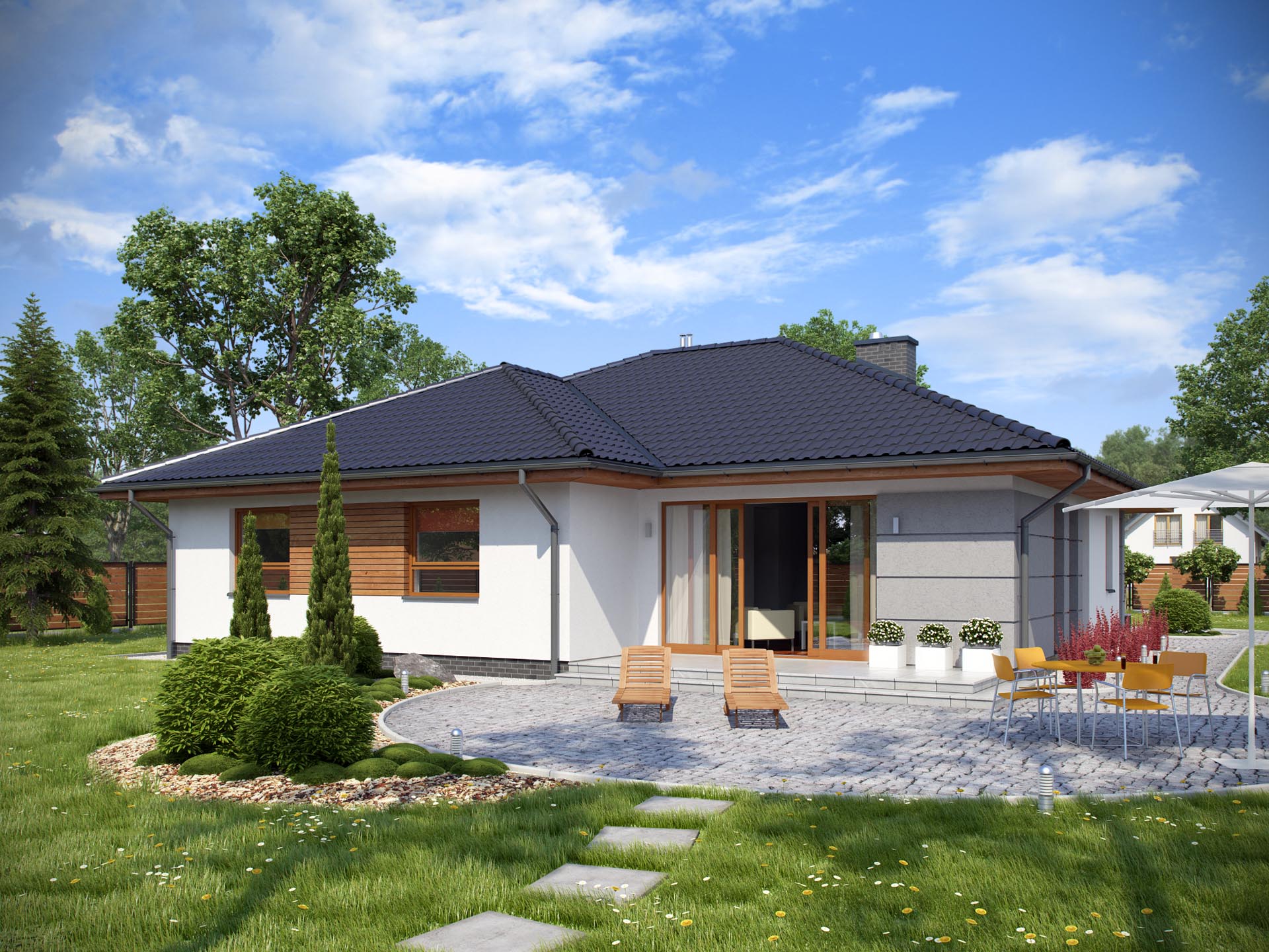 Niewielki, ale niezwykle funkcjonalny dom parterowy. Pomimo małych gabarytów doskonale sprawdzi się w użytkowaniu przez czteroosobową rodzinę. Dom posiada trzy sypialnie, dwie łazienki, salon z jadalnią oraz kuchnię. Nie zabrakło tu również garażu, pomieszczeń gospodarczych oraz dużej i wygodnej garderoby.
