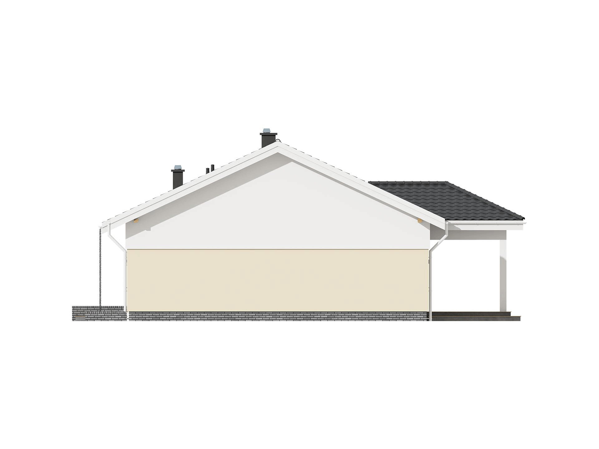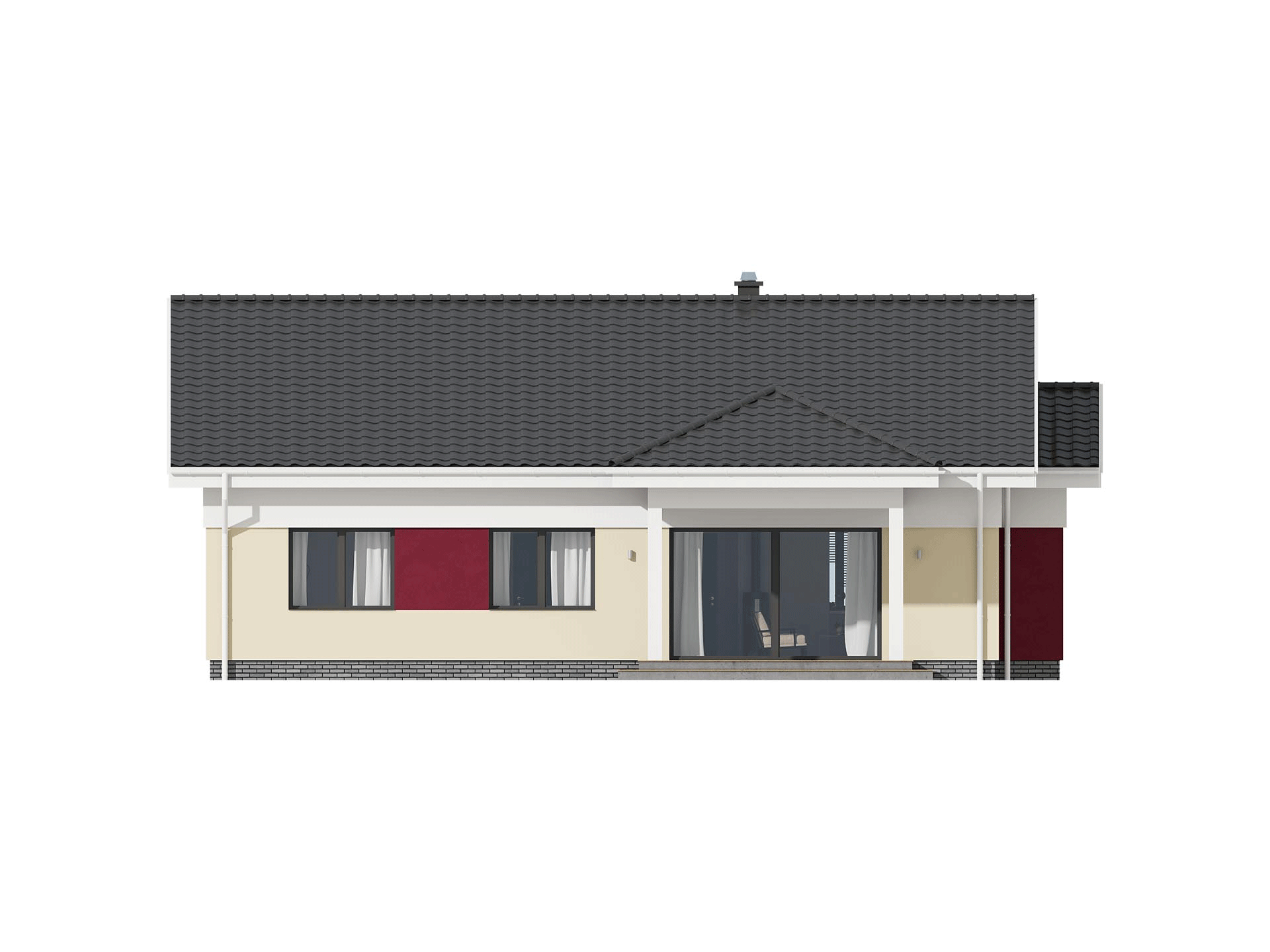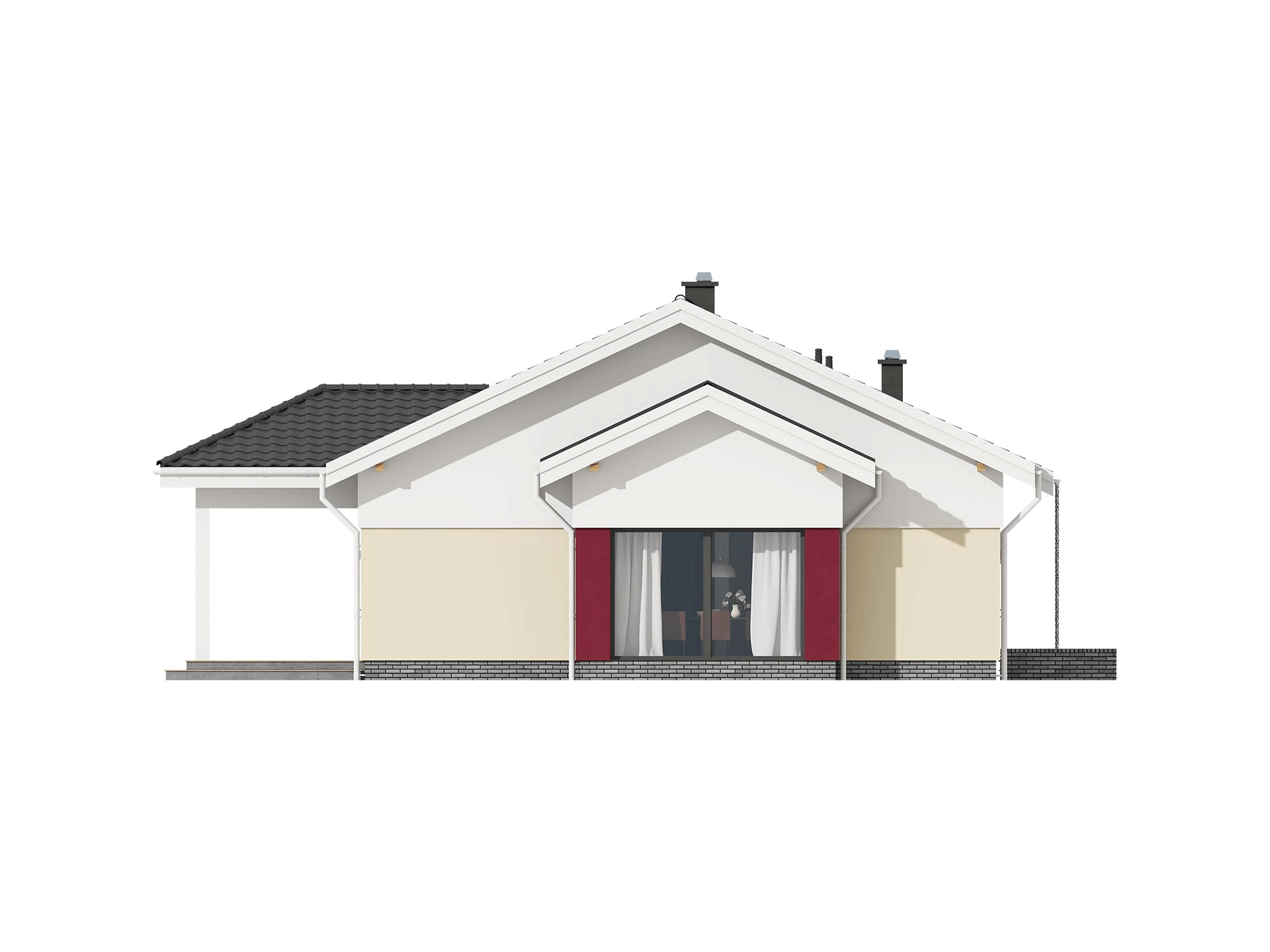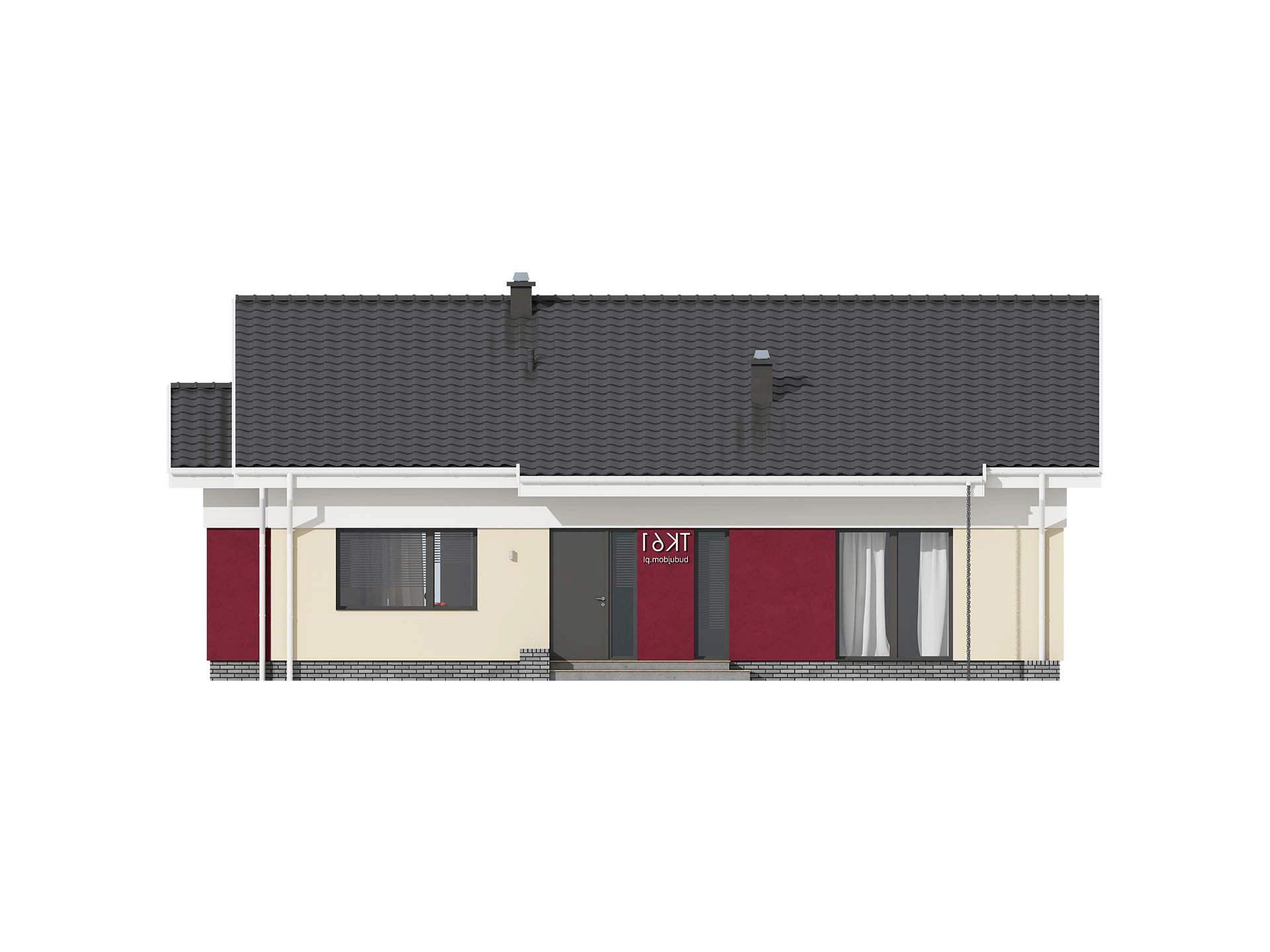 TK61L to nieduży, funkcjonalnie zaprojektowany dom parterowy. Znajdziemy tu trzy spore pokoje i duży salon otwarty na jadalnię z kominkiem i otwartą kuchnię. Konstrukcja budynku została tak zaprojektowana, by kuchnię w zależności od potrzeb domowników można było otworzyć na salon, albo zamknąć wykonując ściankę działową. Dodatkowym atutem domu jest zadaszony taras na którym zmieścimy duży stół. Powierzchnia kotłowni daje możliwość wybrania różnych źródeł ogrzewania. Zachęcamy do obejrzenia podobnych projektów, TK34G z dachem wielospadowym, TK61G z garażem i TK34g2 z garażem dwustanowiskowym.