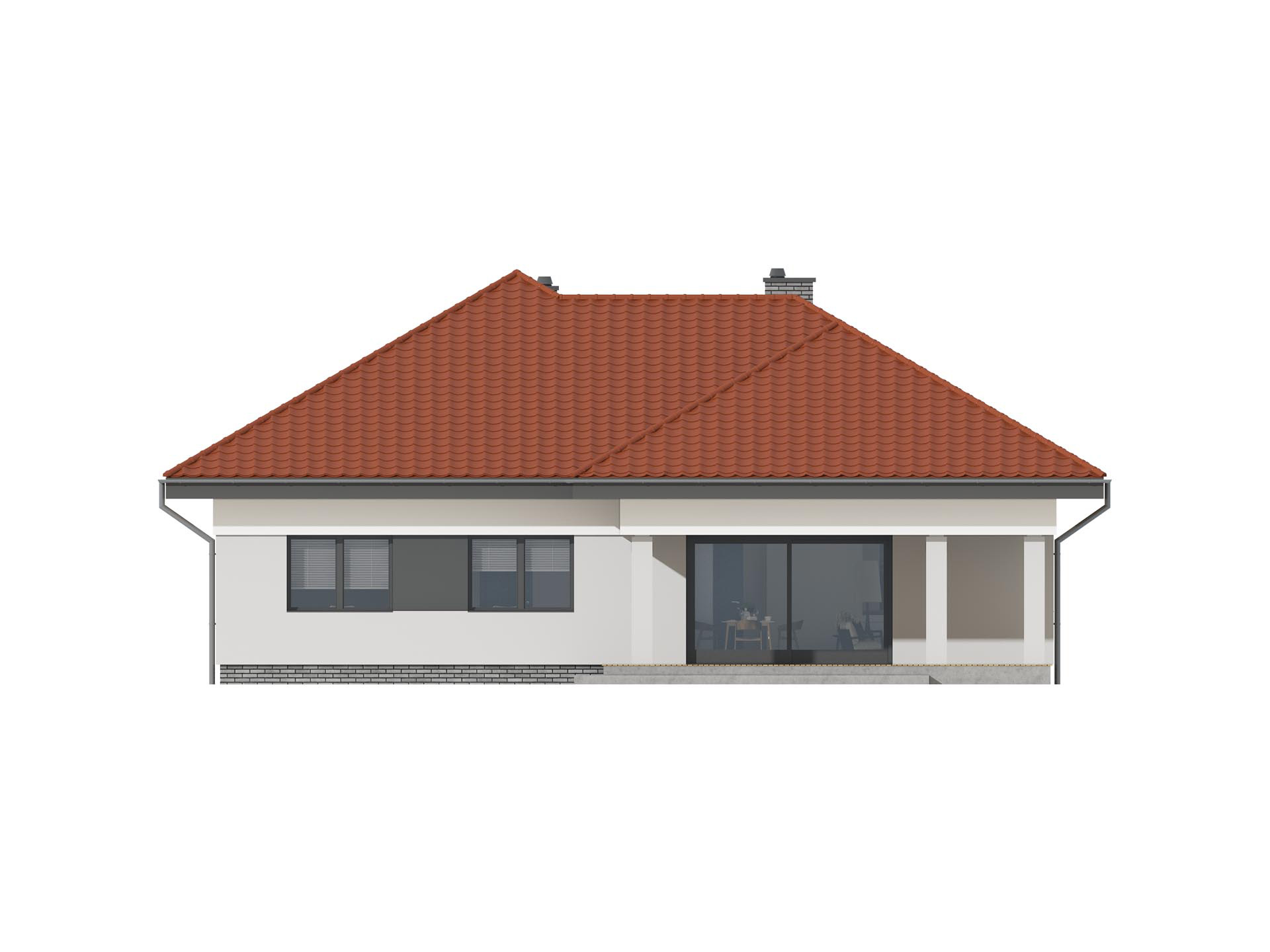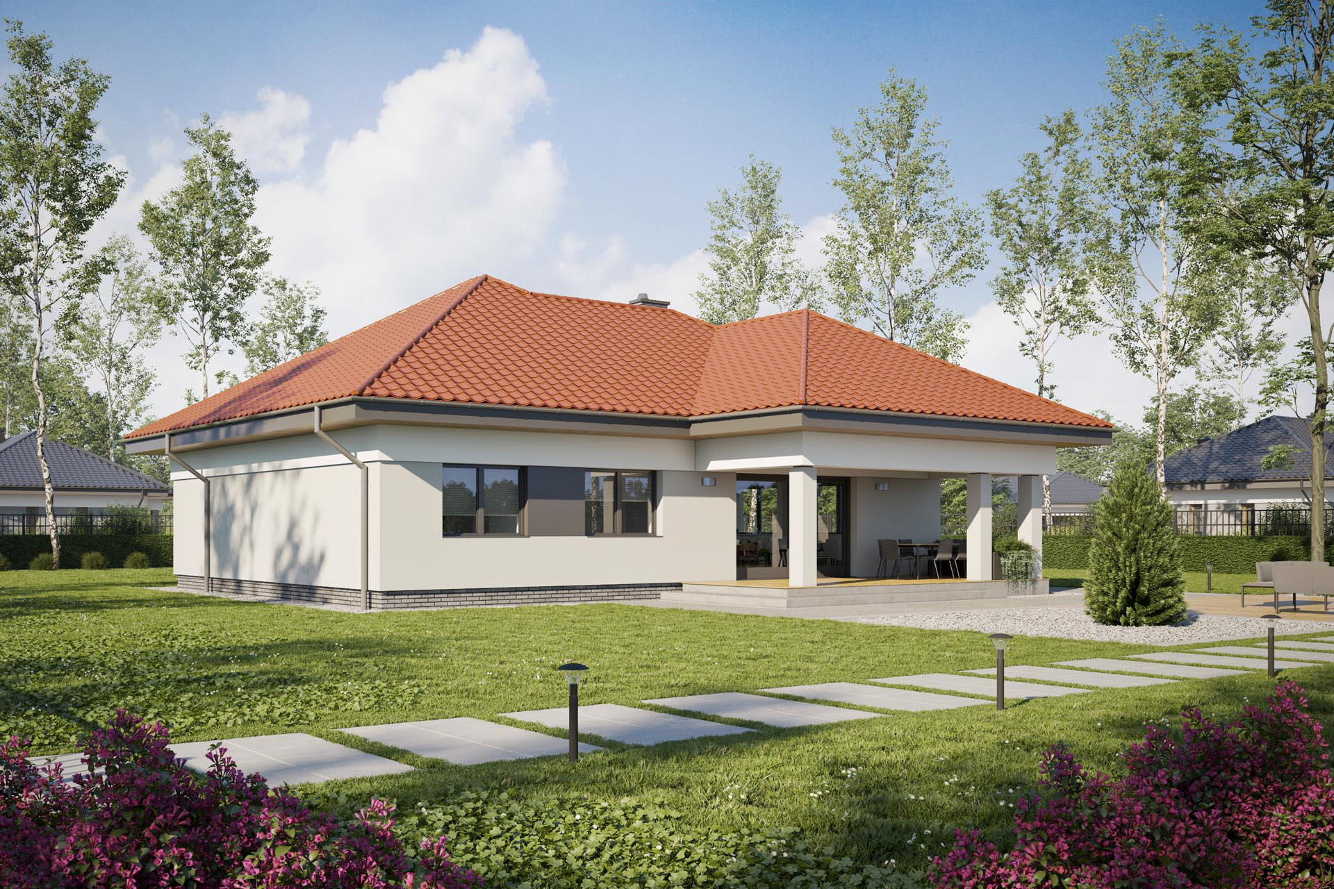 TK67L to nieduży, zwarty i bardzo funkcjonalnie zaprojektowany dom dla czteroosobowej rodziny. Znajdziemy tu trzy spore sypialnie i duży salon i dwie łazienki. Konstrukcja budynku pozwala na dowolną aranżację wnętrza bo wszystkie ściany wewnętrzne są ścianami działowymi. Wygodny zadaszony taras pozwoli cieszyć się ogrodem nawet w nieco chłodniejsze dni. Duża kotłownia pomieści każdy piec i zasobnik na opał jeśli tylko zajdzie taka potrzeba. Zachęcamy do obejrzenia podobnych projektów mniejszy TK69 i TK68 z dachem dwuspadowym.