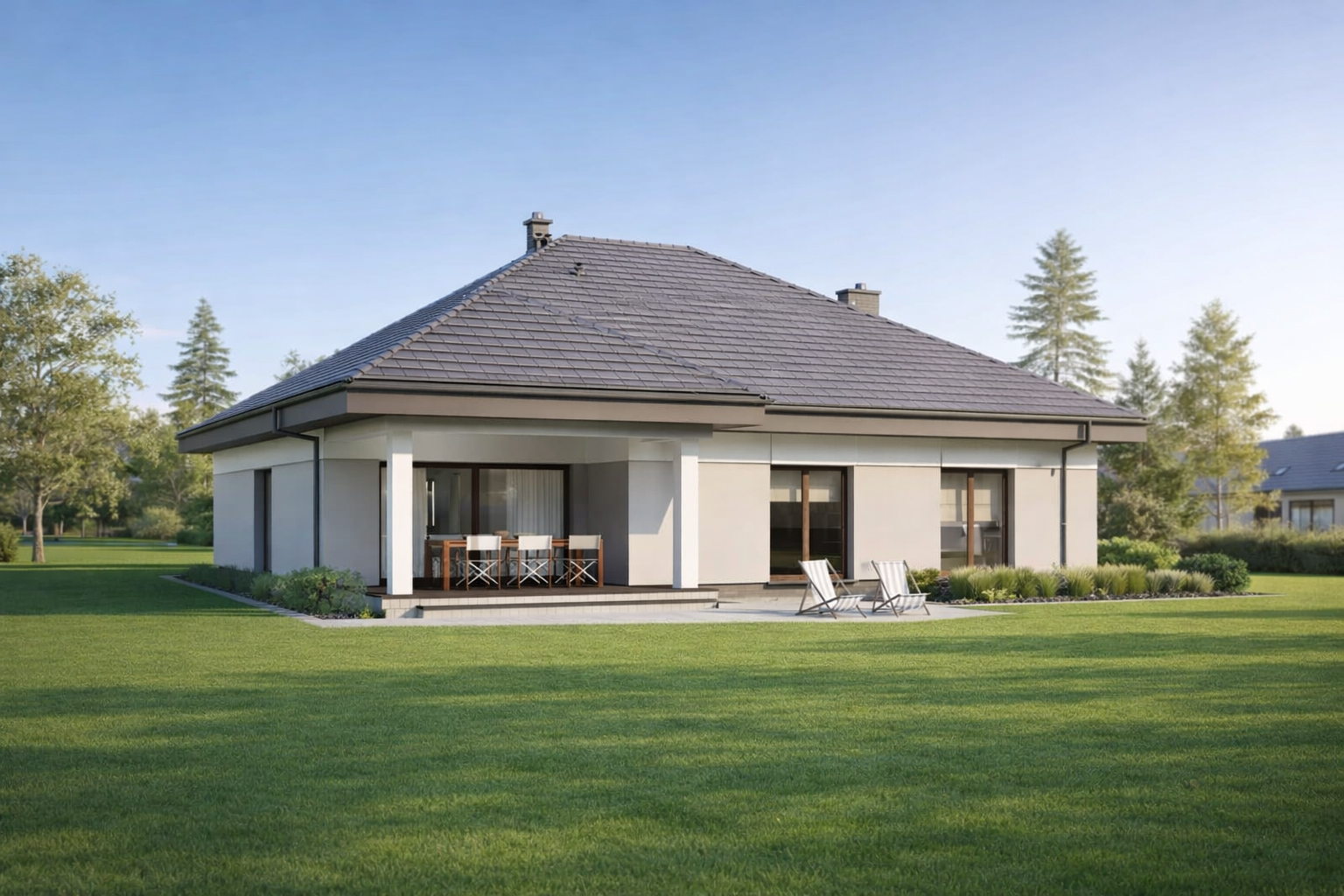 Atrakcyjny parterowy dom jednorodzinny dla czteroosobowej rodziny. W strefie nocnej zaprojektowaliśmy trzy wygodne sypialnie. Otwarty salon z jadalnią tworzy niesamowite wrażenia przestrzenne, a otwarta kuchnia pozwala domownikom na wspólne spędzanie czasu. Dla osób, które wybiorą zdecydowany podział funkcji istnieje możliwość wydzielenia kuchni. Pomieszczenie techniczne może posłużyć jako pralnia lub dodatkowy składzik, a przestronny garaż pomieści dwa samochody . W razie potrzeby można również wykorzystać jako mieszkalną powierzchnię na poddaszu. W pomieszczeniu nr 09 istnieje możliwość umieszczenia schodów.