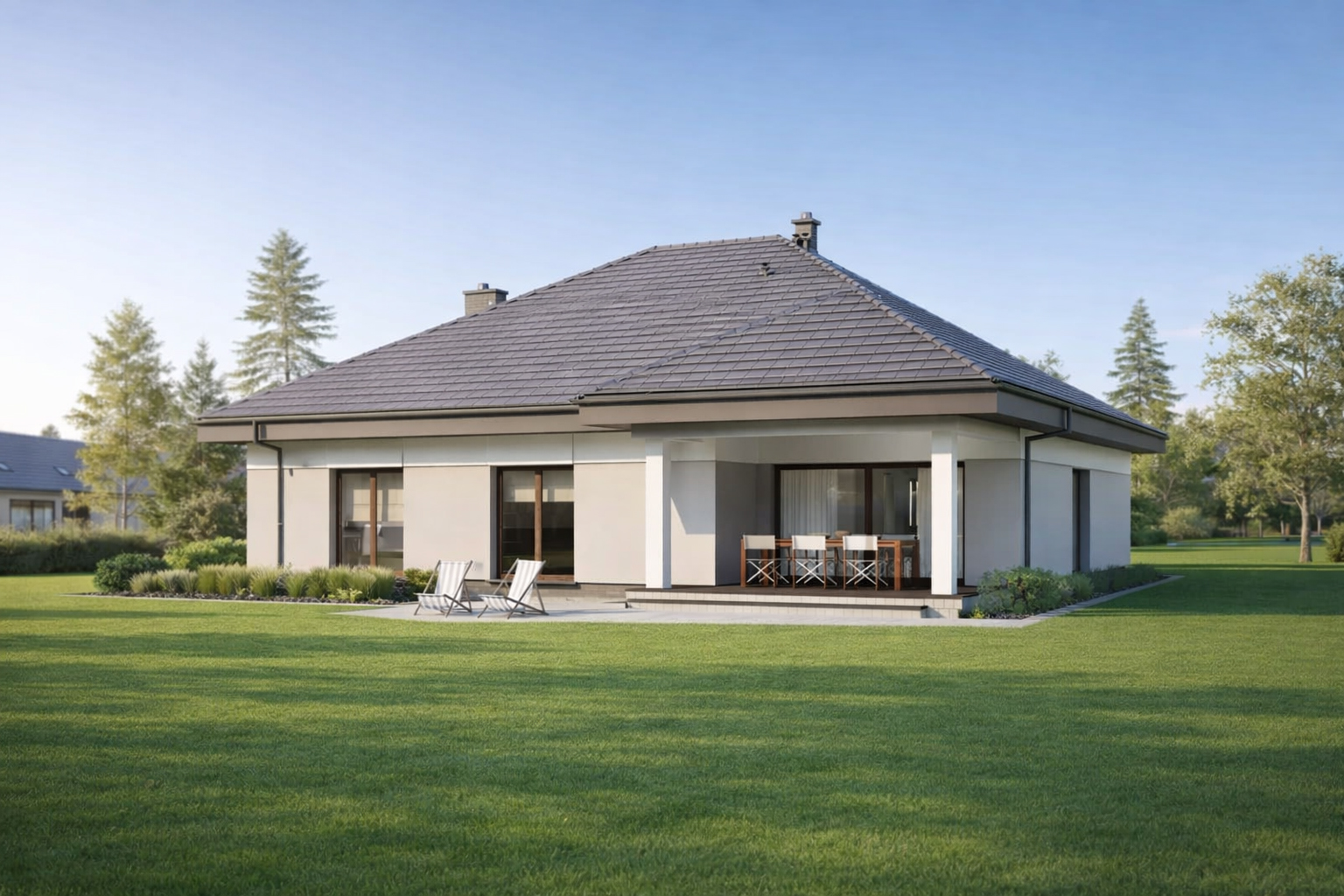 Atrakcyjny parterowy dom jednorodzinny dla czteroosobowej rodziny. W strefie nocnej zaprojektowaliśmy trzy wygodne sypialnie. Otwarty salon z jadalnią tworzy niesamowite wrażenia przestrzenne, a otwarta kuchnia pozwala domownikom na wspólne spędzanie czasu. Dla osób, które wybiorą zdecydowany podział funkcji istnieje możliwość wydzielenia kuchni. Pomieszczenie techniczne może posłużyć jako pralnia lub dodatkowy składzik, a przestronny garaż pomieści dwa samochody . W razie potrzeby można również wykorzystać jako mieszkalną powierzchnię na poddaszu. W pomieszczeniu nr 09 istnieje możliwość umieszczenia schodów.