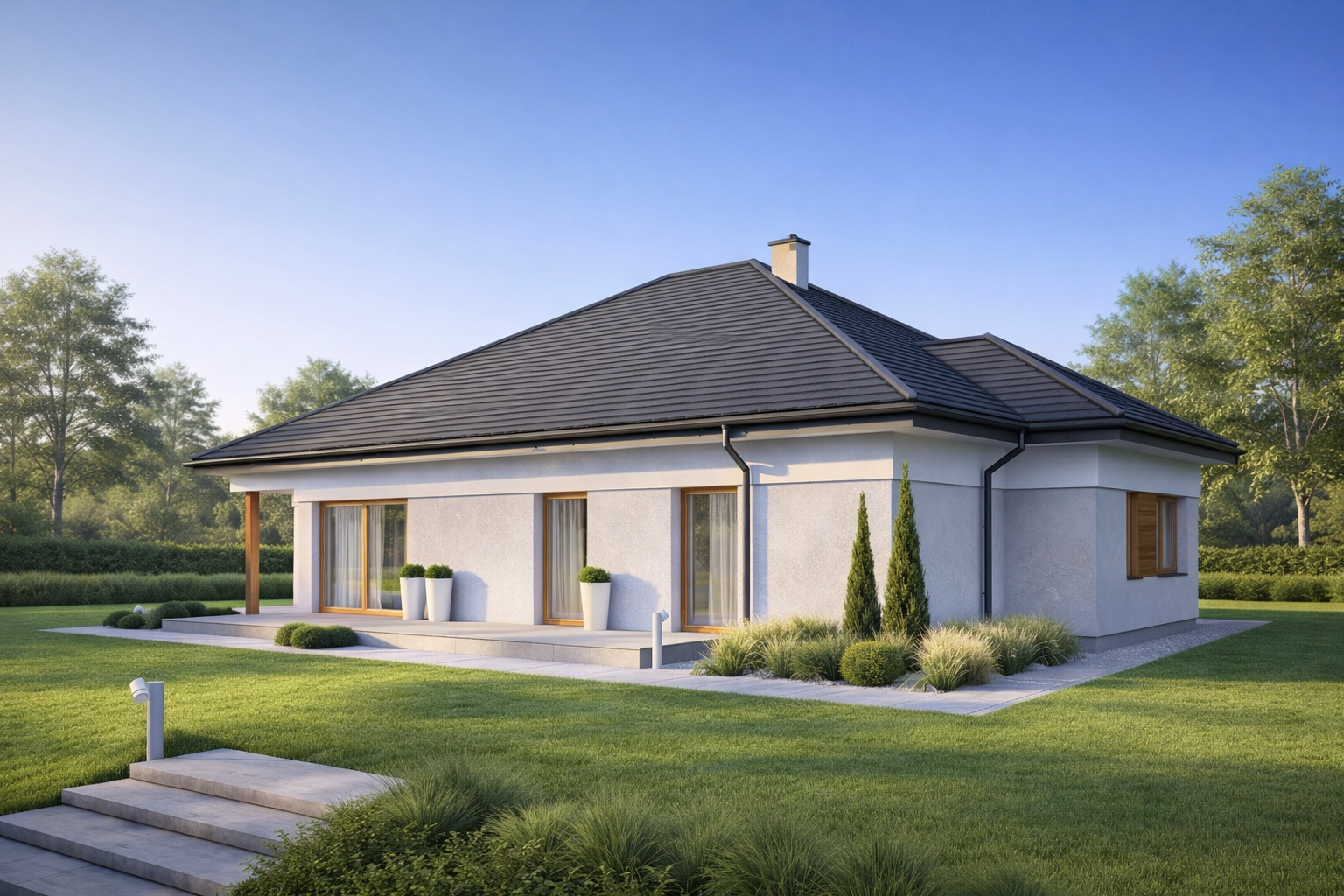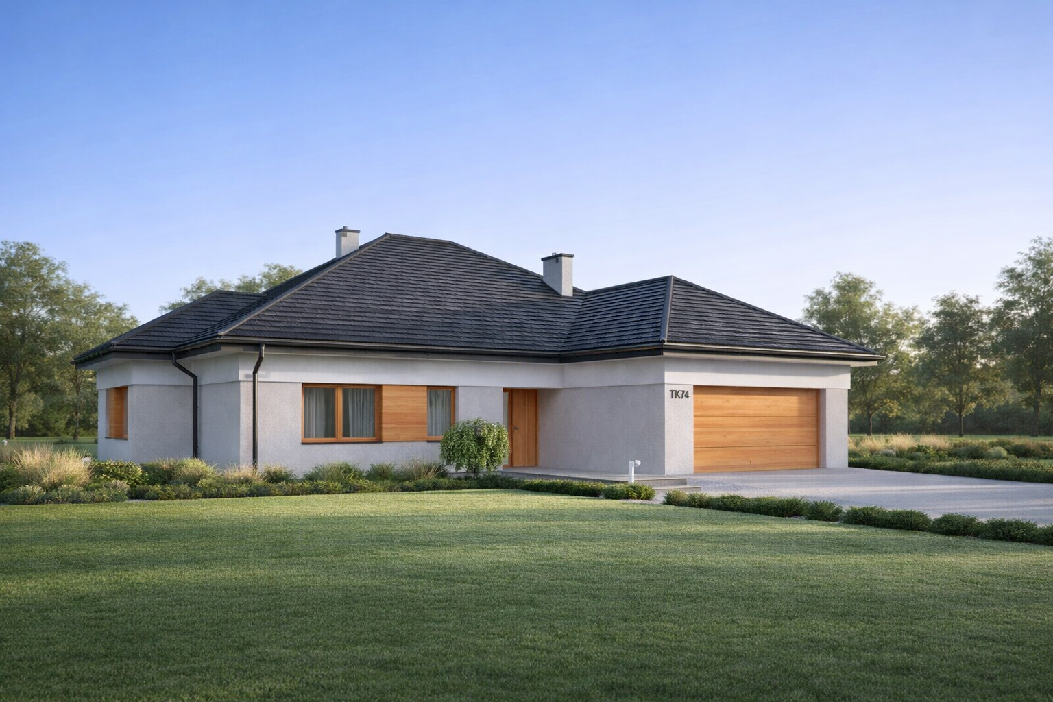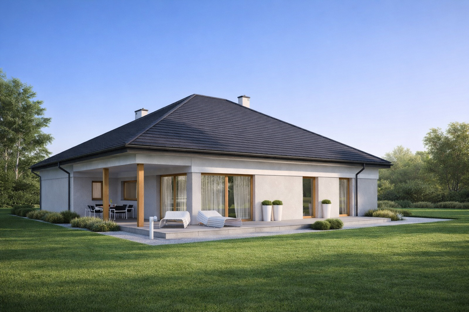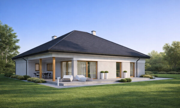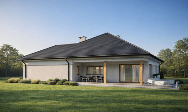 Dom parterowy z możliwością wykorzystania poddasza. Na rzutach zasugerowano lokalizację schodów na poddasze. Jeśli schody okażą się zbędne, ich powierzchnię mogą zająć pojemne szafy lub przesuwając ściankę działową można o tę przestrzeń poszerzyć pralnię. W domu znajdziemy trzy sypialnie, w tym główną z własną łazienką i garderobą. Pomimo małej powierzchni dom posiada liczne pomieszczenia gospodarcze jak pralnia, spiżarka oraz wnękę w garażu mogącą pomieścić sprzęt sportowy czy kosiarkę. Niewątpliwym atutem domu jest przestronna strefa dzienna z piękną przeszkloną jadalnią w narożniku domu z wyjściem na zadaszony taras.