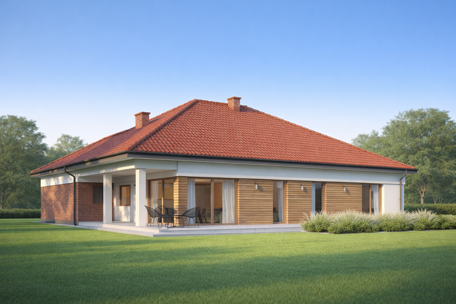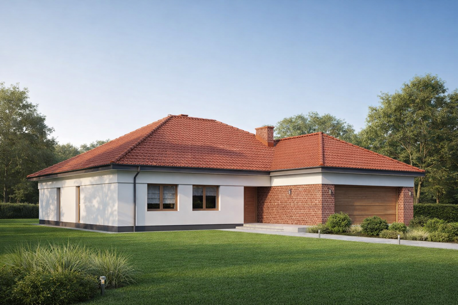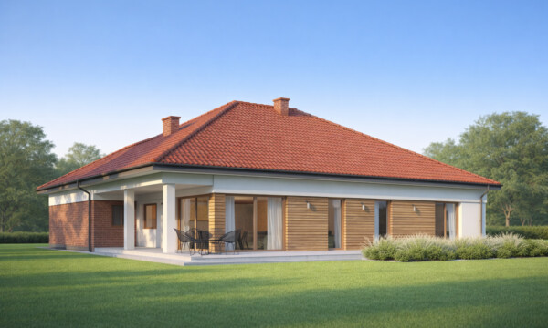 Parterowy dom jednorodzinny z czterema sypialniami. Jedna z sypialni, trochę mniejsza może służyć jako pokój komputerowy lub pokój dla gości. Główna sypialnia połączona z wygodną garderobą oraz własną łazienką. Strefa dzienna otwarta, z przeszkloną jadalnią i wyjściem na zadaszony taras oraz centralny kominek spajający salon jadalnię i kuchnię. Przy kuchni zlokalizowano małą spiżarnię, którą według potrzeb można adaptować na dodatkowe wc. W garażu zaprojektowano wnękę, dzięki której swobodnie pomieścimy rowery i inne sprzęty niezbędne w domu. Układ strefy dziennej jest tak zaprojektowany, aby zwolennicy kuchni zamkniętej bez problemu mogli ją wydzielić ściankami działowymi.