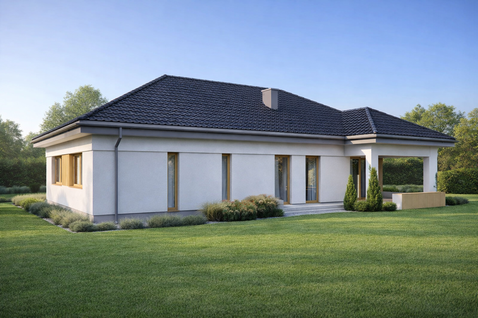 Niepodważalnym atutem domu TK79 jest duży zadaszony taras. Dzięki obszernym przeszkleniom stanowić on będzie piękne przedłużenie jadalni. Można tu swobodnie zostawić meble ogrodowe bez obawy, że zmokną na deszczu. Również wnętrze domu zaprojektowano bardzo funkcjonalnie. Obszerna strefa dzienna, duża kuchnia daje możliwość postawienia sporej wyspy. W pobliżu kuchni zaprojektowano spiżarnię. W strefie nocnej mamy do dyspozycji 3 sypialnie w tym jedną z obszernymi szafami oraz własną łazienką. Dodatkowo przy wejściu zlokalizowano jeszcze jeden mniejszy pokój.