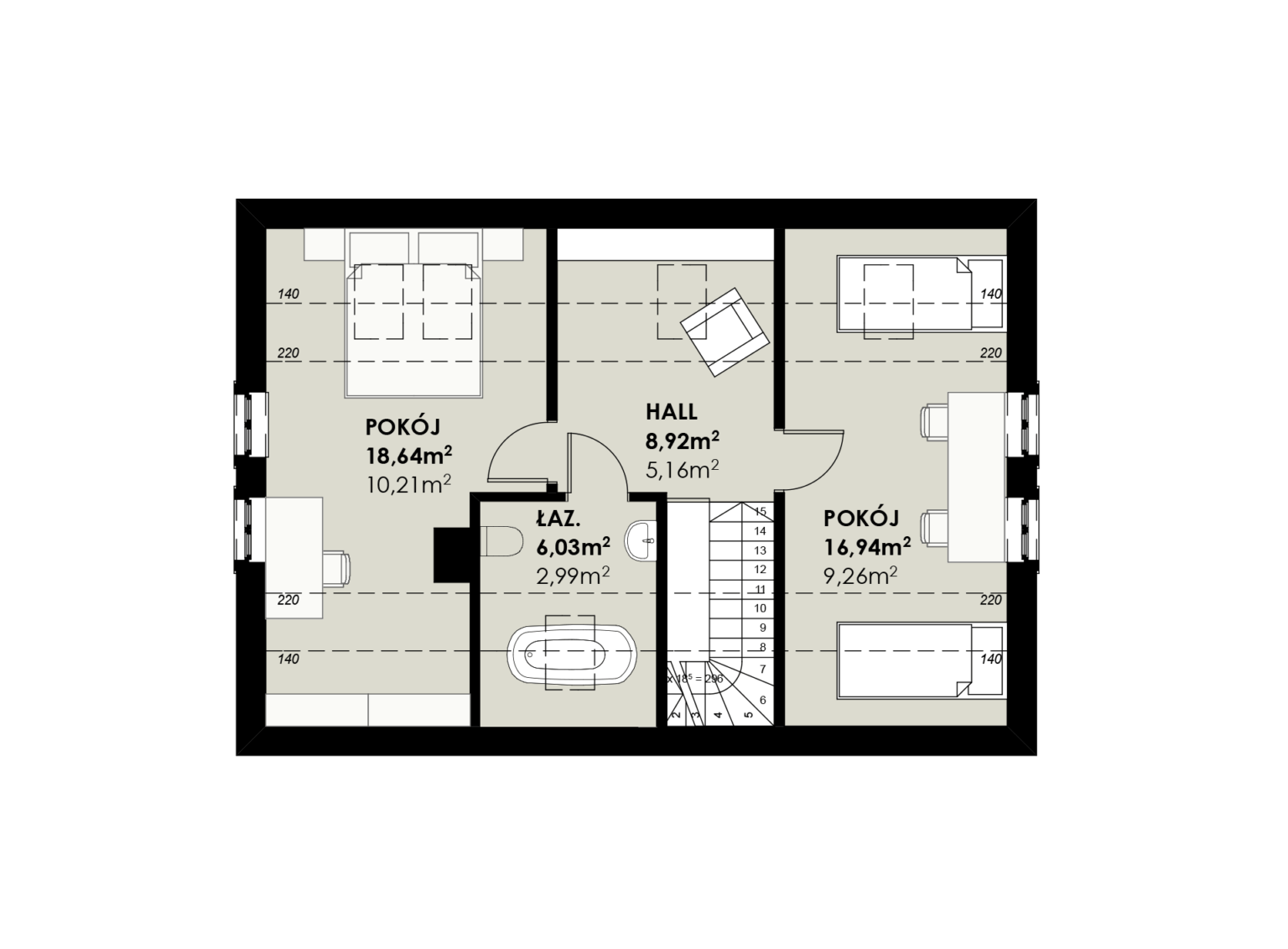 Dom zaprojektowany w technologii drewnianej, szkieletowej z zastosowaniem najnowszych rozwiązań technicznych i materiałów będzie energooszczędny, łatwy i ekonomiczny w budowie. Na parterze znajduje się wygodna strefa dzienna z otwartą kuchnią i duża łazienka oraz pomieszczenie gospodarcze. Na poddaszu wykorzystano miejsce na dwa pokoje i łazienkę.