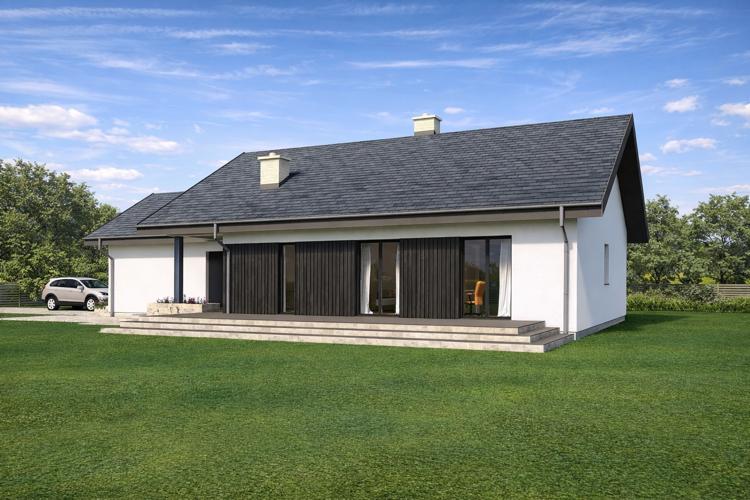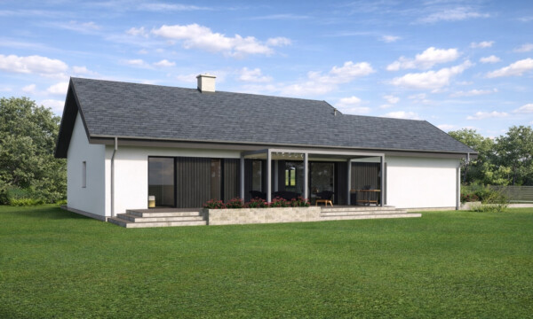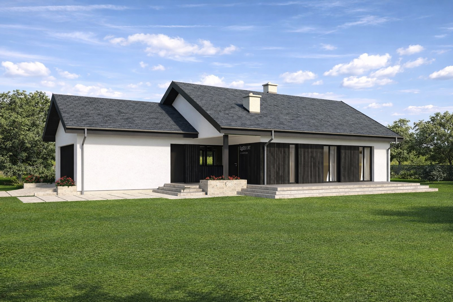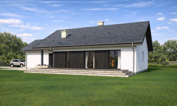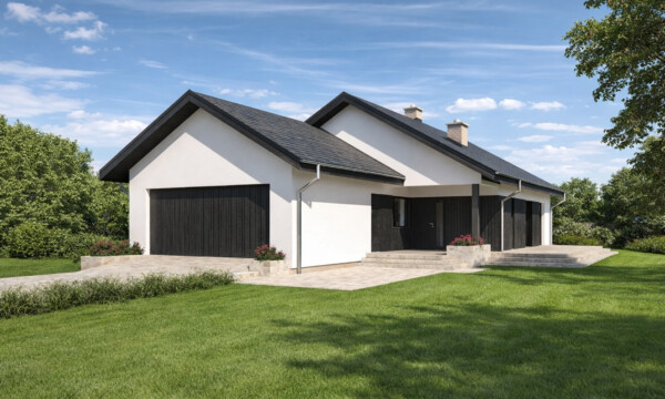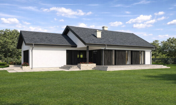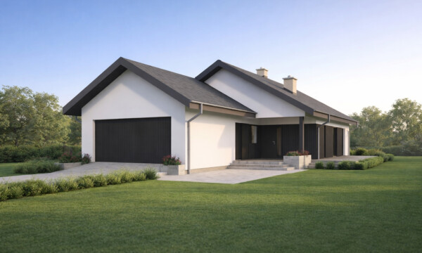 Prosty i wygodny dom parterowy z garażem na dwa samochody. Zaprojektowany z myślą o wygodach dla czteroosobowej rodziny. Proste rozwiązania konstrukcyjne i techniczne zapewniają niskie koszty budowy i użytkowania, a niewielka szerokość budynku pozwala zbudować go na wąskiej działce. Znajdziemy tu dwa wygodne pokoje dla dzieci, sypialnie dla rodziców z własną garderobą, dwie łazienki i wygodną otwartą przestrzeń dzienną z kominkiem w salonie i jadalni. TK82g2 jest domem w konstrukcji murowanej.