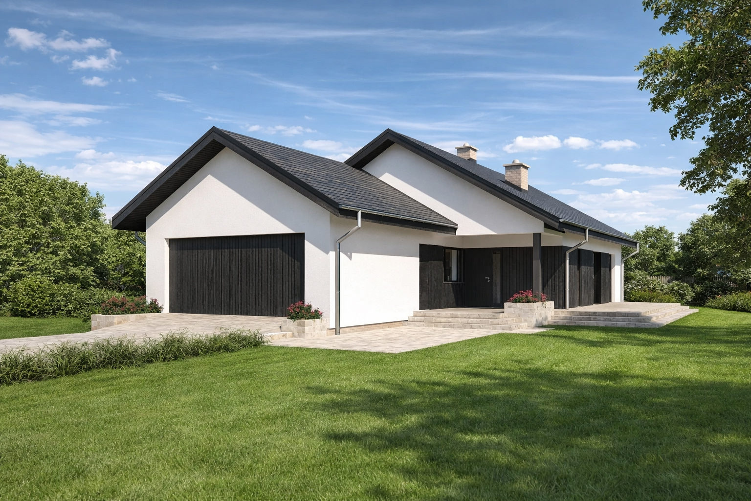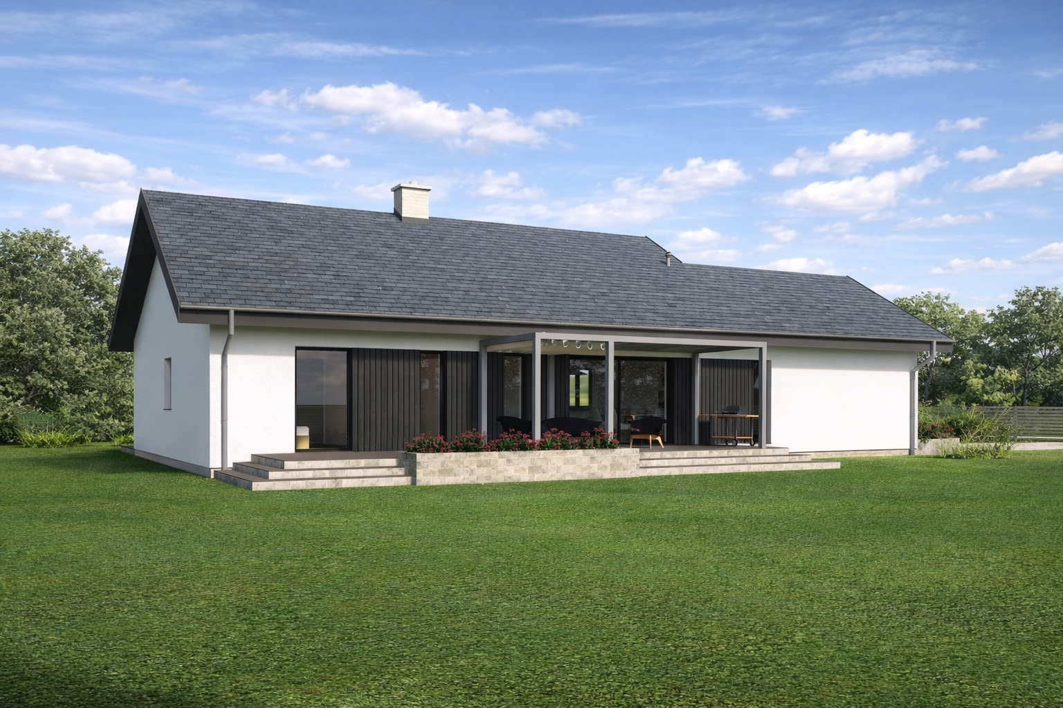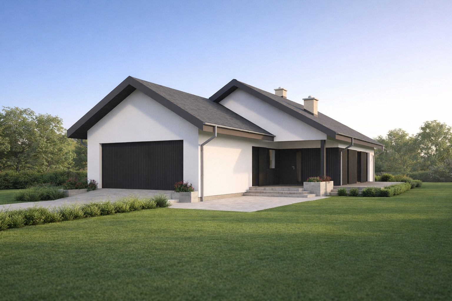 Prosty i wygodny dom parterowy z garażem na dwa samochody. Zaprojektowany z myślą o wygodach dla czteroosobowej rodziny. Proste rozwiązania konstrukcyjne i techniczne zapewniają niskie koszty budowy i użytkowania, a niewielka szerokość budynku pozwala zbudować go na wąskiej działce. Znajdziemy tu dwa wygodne pokoje dla dzieci, sypialnie dla rodziców z własną garderobą, dwie łazienki i wygodną otwartą przestrzeń dzienną z kominkiem w salonie i jadalni. TK82g2 jest domem w konstrukcji murowanej.