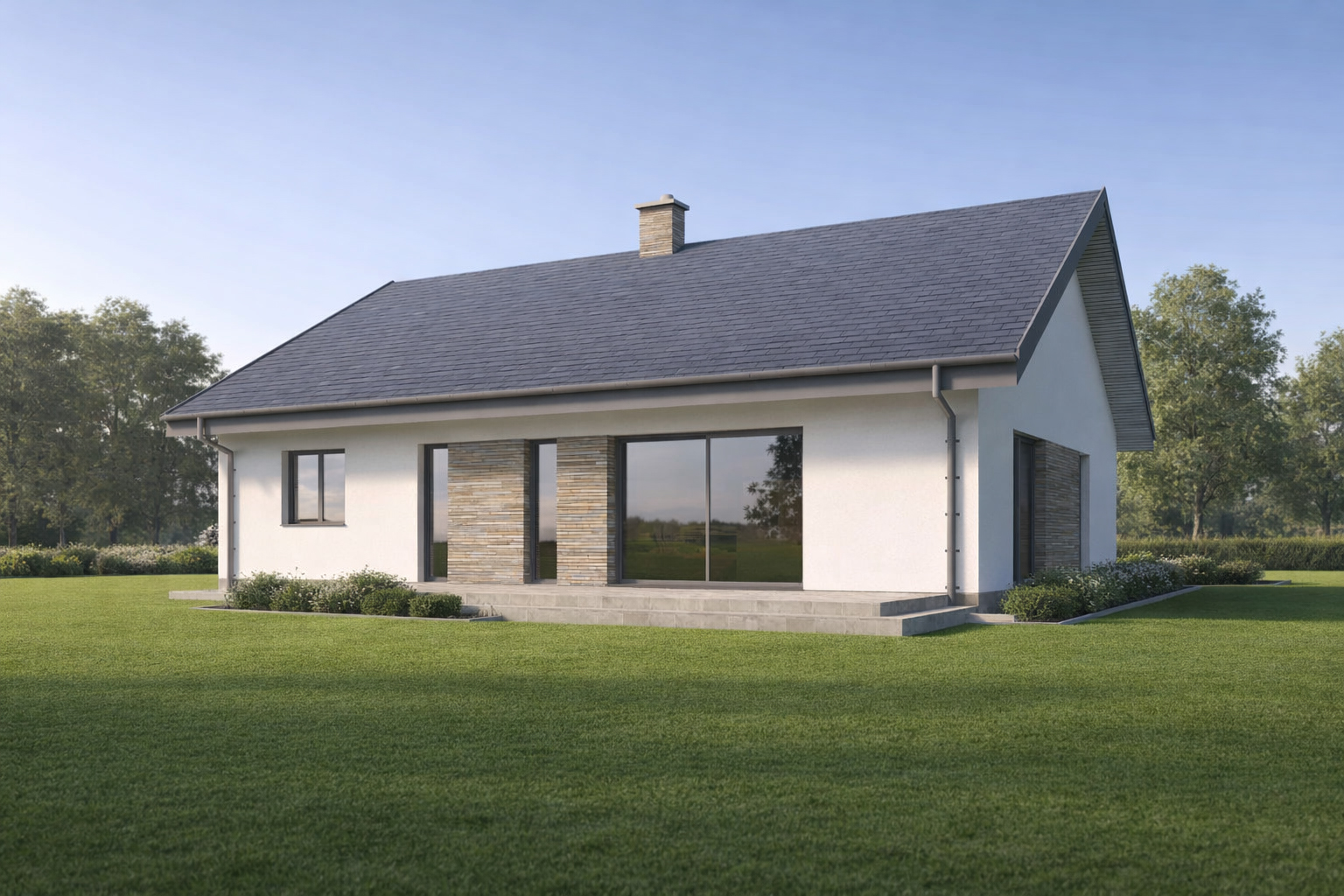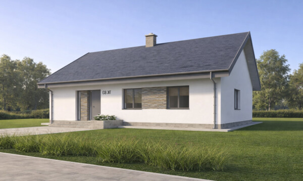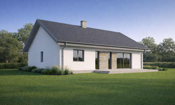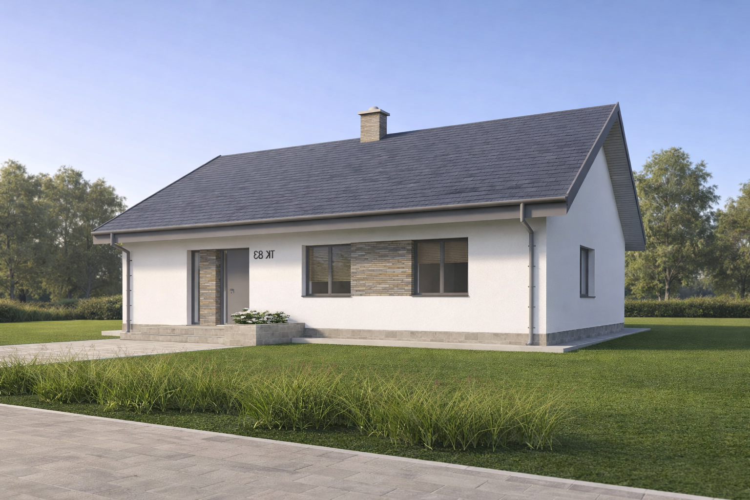 Prostota, wygoda i ekonomia użytkowania to główne cechy jakie ma spełnić ten parterowy dom. Na 108 metrach kwadratowych zaprojektowaliśmy wygodny salon z dużą jadalnią, sypialnię z odrębną garderobą, dwie łazienki, dwa wygodne pokoje i kuchnię która może być otwarta lub zamknięta w zależności od potrzeb. Pomieszczenie techniczne pomieści wszelkie niezbędne urządzenia grzewcze i techniczne dla obsługi domu. Bryła budynku oraz zastosowane rozwiązania konstrukcyjne zapewnią niskie koszty budowy. TK83 jest domem zaprojektowanym w technologii murowanej.