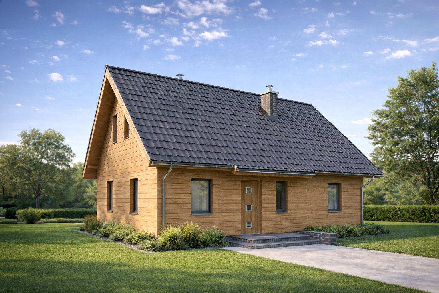 TK88D to niewielki domek, idealny dla osób poszukujących ekonomicznych i prostych rozwiązań. Dzięki swej zwartej bryle jest niezwykle funkcjonalny i tani w eksploatacji. Do jego zalet można zaliczyć także dużą kuchnię oraz powiększoną kotłownię, która może dodatkowo pełnić funkcję pomieszczenia gospodarczego. Stonowana kolorystyka elewacji i prostota bryły sprawiają, że jest to projekt bezpretensjonalny i pełen uroku.
