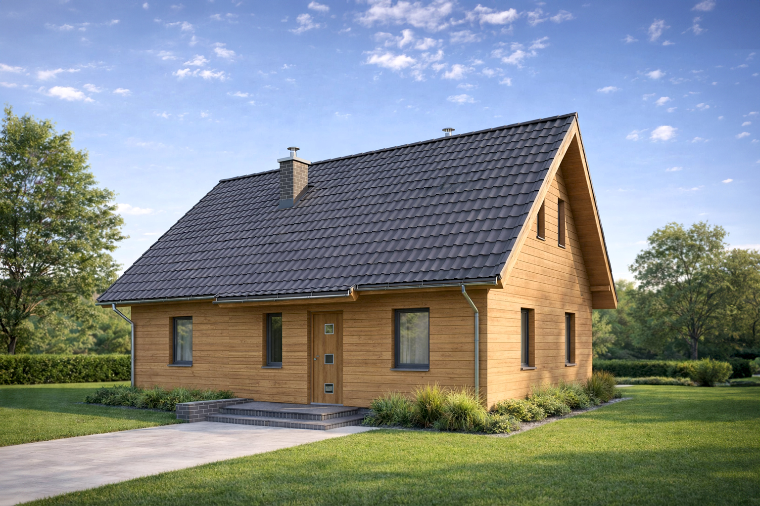 TK88D to niewielki domek, idealny dla osób poszukujących ekonomicznych i prostych rozwiązań. Dzięki swej zwartej bryle jest niezwykle funkcjonalny i tani w eksploatacji. Do jego zalet można zaliczyć także dużą kuchnię oraz powiększoną kotłownię, która może dodatkowo pełnić funkcję pomieszczenia gospodarczego. Stonowana kolorystyka elewacji i prostota bryły sprawiają, że jest to projekt bezpretensjonalny i pełen uroku.