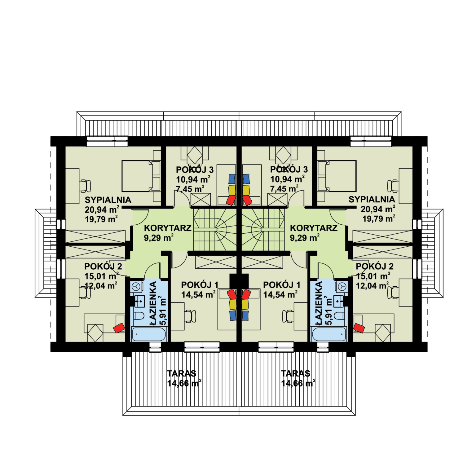 Nowoczesny dom w zabudowie jednorodzinnej dwulokalowej oferujący atrakcyjne i funkcjonalne wnętrza. Na parterze przestronna przestrzeń dzienna z kominkiem w jadalni, wygodny gabinet i obszerny garaż na jeden samochód. Na poddaszu skosy ograniczone są do minimum dzięki dużym i przeszklonym lukarnom, które zapewniają doskonałe oświetlenie. Liczne tarasy pozwolą domownikom cieszyć się otaczającą naturą.