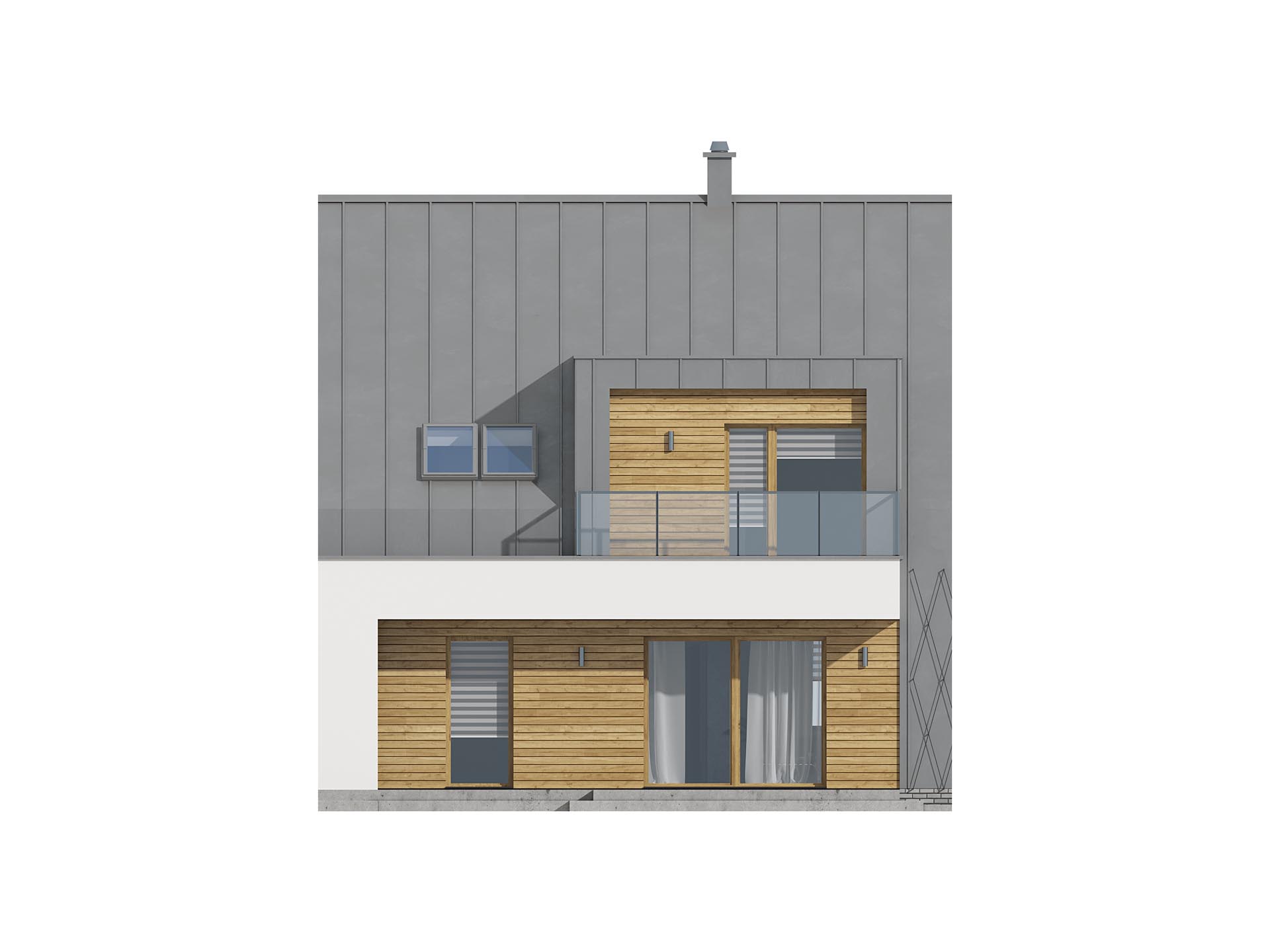 Nowoczesny dom w zabudowie szeregowej oferujący atrakcyjne i funkcjonalne wnętrza. Na parterze przestronna przestrzeń dzienna z kominkiem w jadalni, wygodny gabinet i obszerny garaż na jeden samochód. Na poddaszu skosy ograniczone są do minimum dzięki dużym i przeszklonym lukarnom, które zapewniają doskonałe oświetlenie. Liczne tarasy pozwolą domownikom cieszyć się otaczająca naturą.
