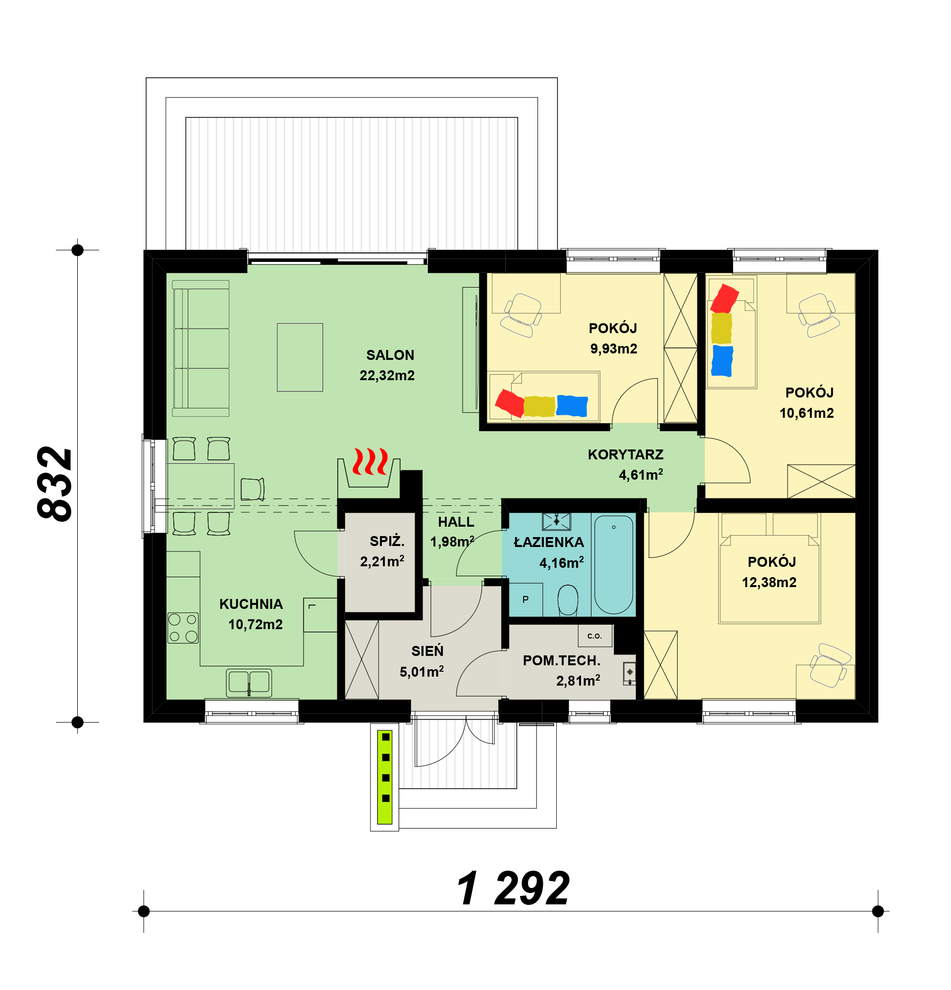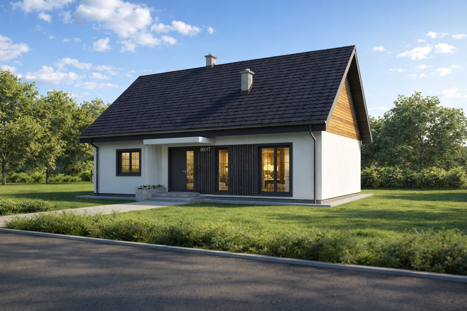 TK98 to projekt małego murowanego domu parterowego spełniający wymagania czteroosobowej rodziny. Salon z kominkiem, kuchnia ze spiżarką to niewątpliwe atuty tego projektu. Prosta bryła i prosta konstrukcja to gwarancja taniej budowy i późniejszego użytkowania.